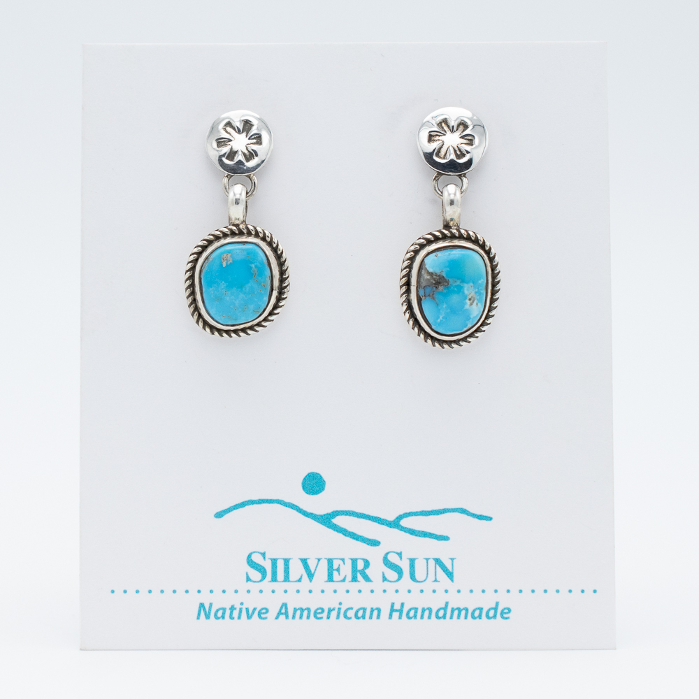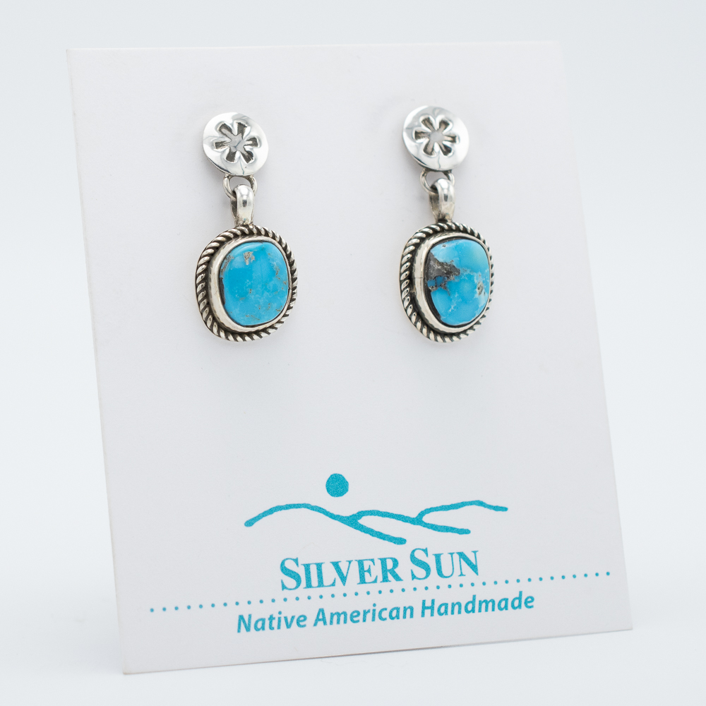 These stud dangle earrings, handcrafted by Navajo artist Bryant Martinez, feature stunning natural Morenci turquoise stones. Each stone is securely set in sterling silver with an elegant rope border that highlights its natural beauty. The design is completed with a polished silver stud top adorned with a flower-like stamp, adding a charming touch to these versatile earrings. Perfect for any occasion, these earrings bring a classic Southwestern style to your collection.