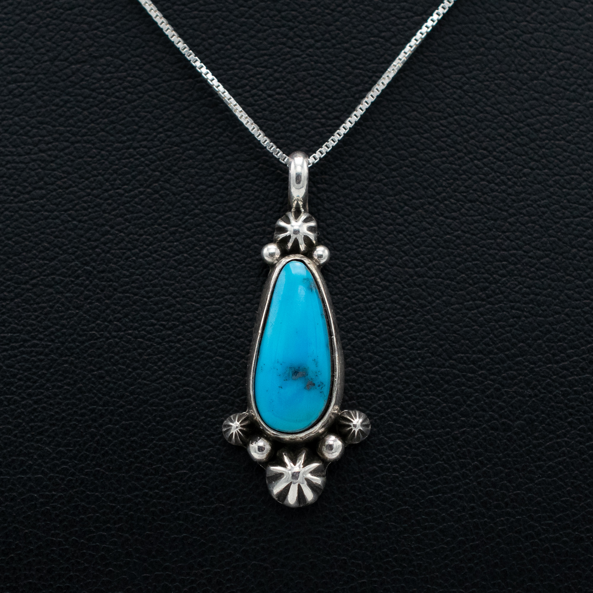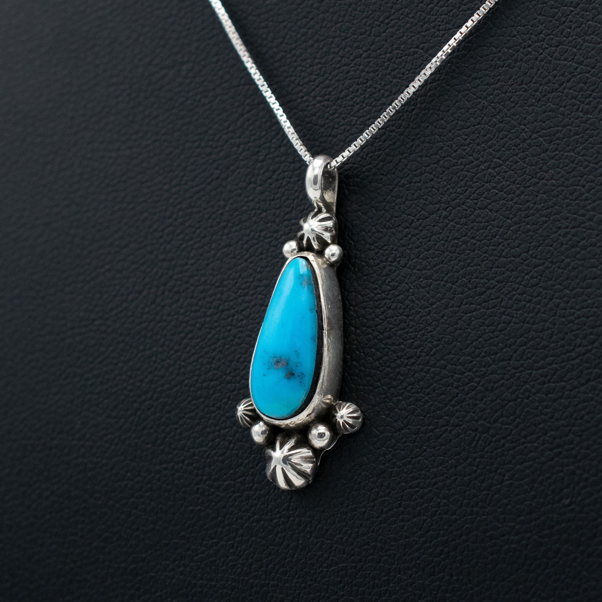 Crafted by Ruth Ann Begay, a skilled Navajo artisan, this Morenci Turquoise Pendant features a captivating blue stone with dark inclusions. The silver work complements the moody hues of the turquoise, with delicate rosettes and raindrops adorning the top and bottom of the pendant, adding a touch of elegance and tradition.
