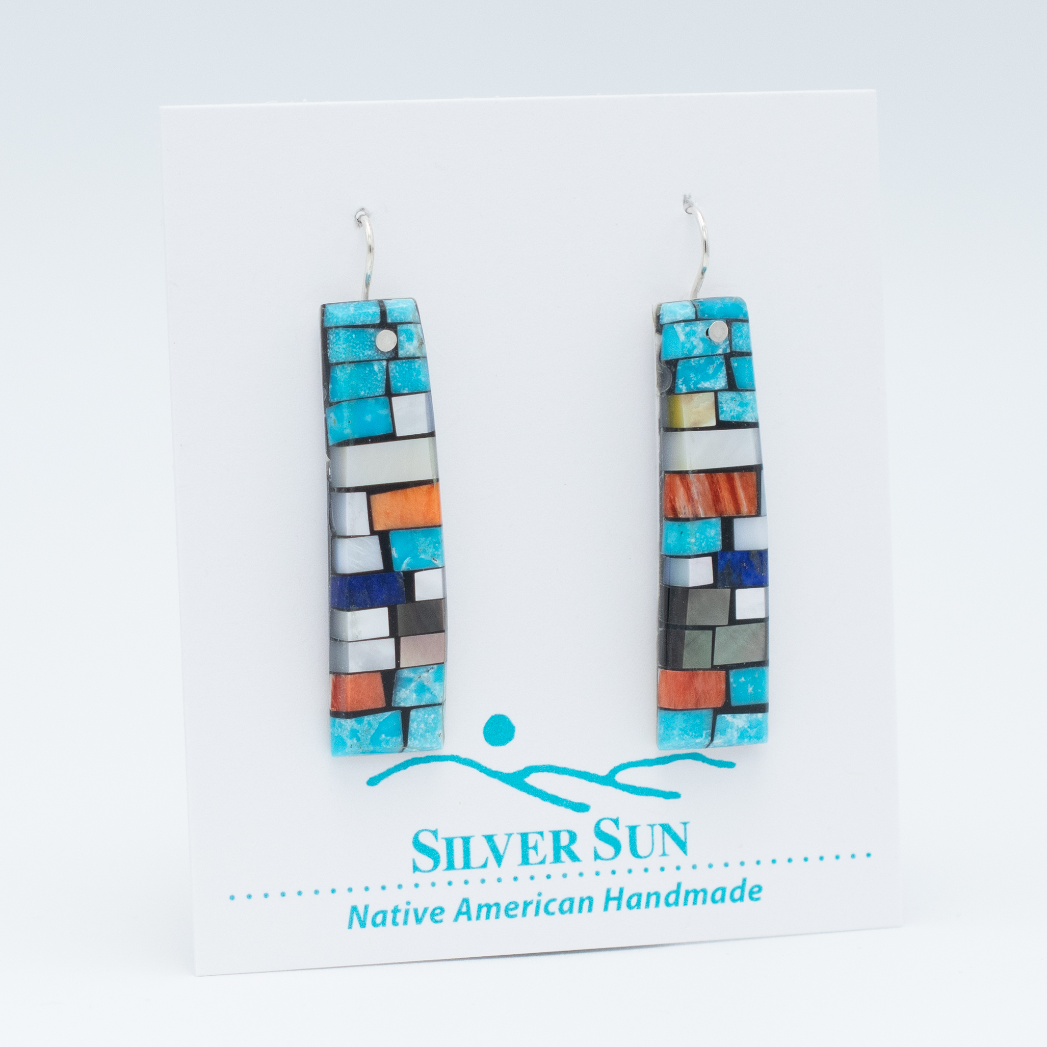 Another exquisite pair by Charlene Reano, these long and narrow dangle earrings feature a striking mosaic inlay of stabilized Kingman turquoise, lapis lazuli, spiny oyster shell, and mother of pearl. The mosaic is set on top of mother of pearl, providing a beautiful iridescent quality to the backs of the earrings, making them as captivating from the back as they are from the front.