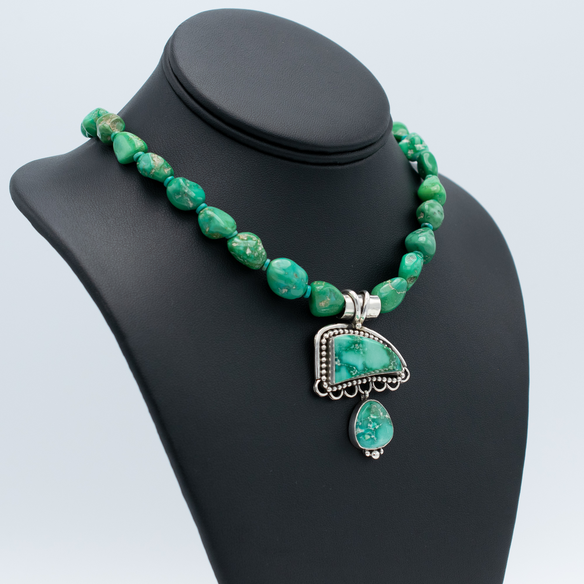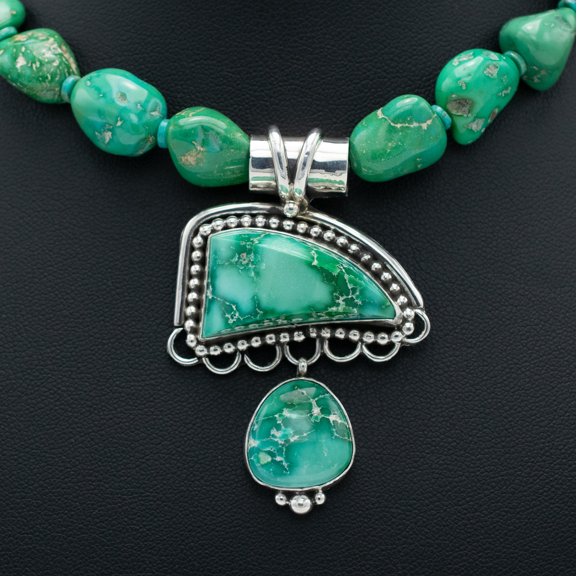 This one-of-a-kind necklace by Navajo artist Ruth Ann Begay features vibrant natural Armenian turquoise arranged in a striking half-moon and drop design. The pendant is accented with delicate silver beadwork and hangs from a necklace of beautifully matched nugget beads that enhance the depth and color of the stones. Bold yet balanced, this piece brings timeless artistry and rich color to any collection.