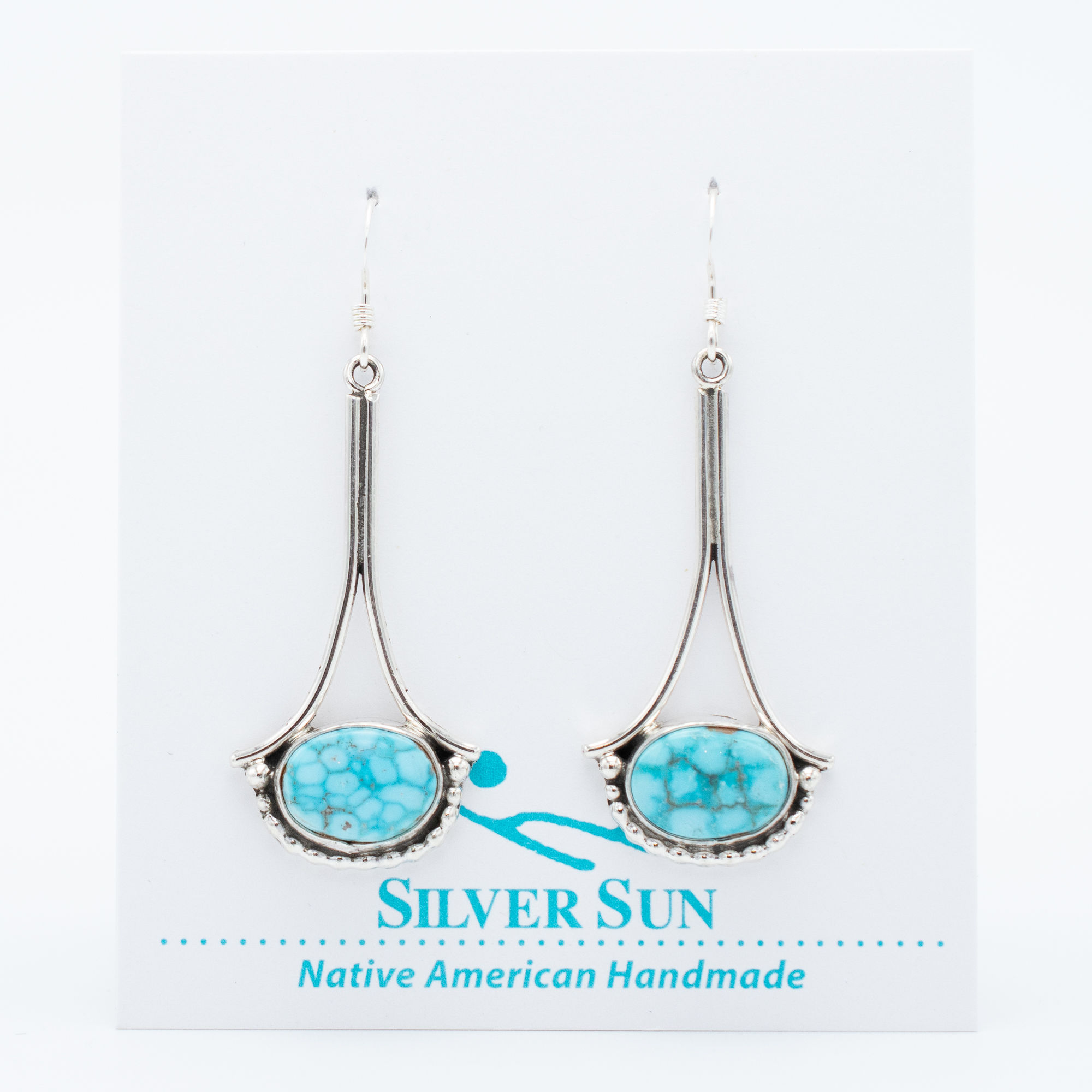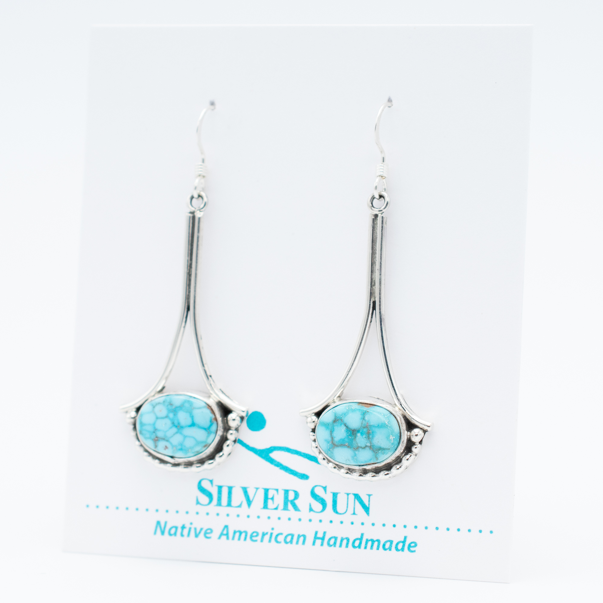 These graceful earrings by Navajo artist Ruth Ann Begay feature natural Bird’s Eye Kingman turquoise, known for its dreamy sky-blue color and distinctive matrix. The turquoise stones are framed in sterling silver with a swooping, sculptural design that adds movement and charm. Light and elegant, they’re a lovely pair of earrings that will brighten your look all year long.