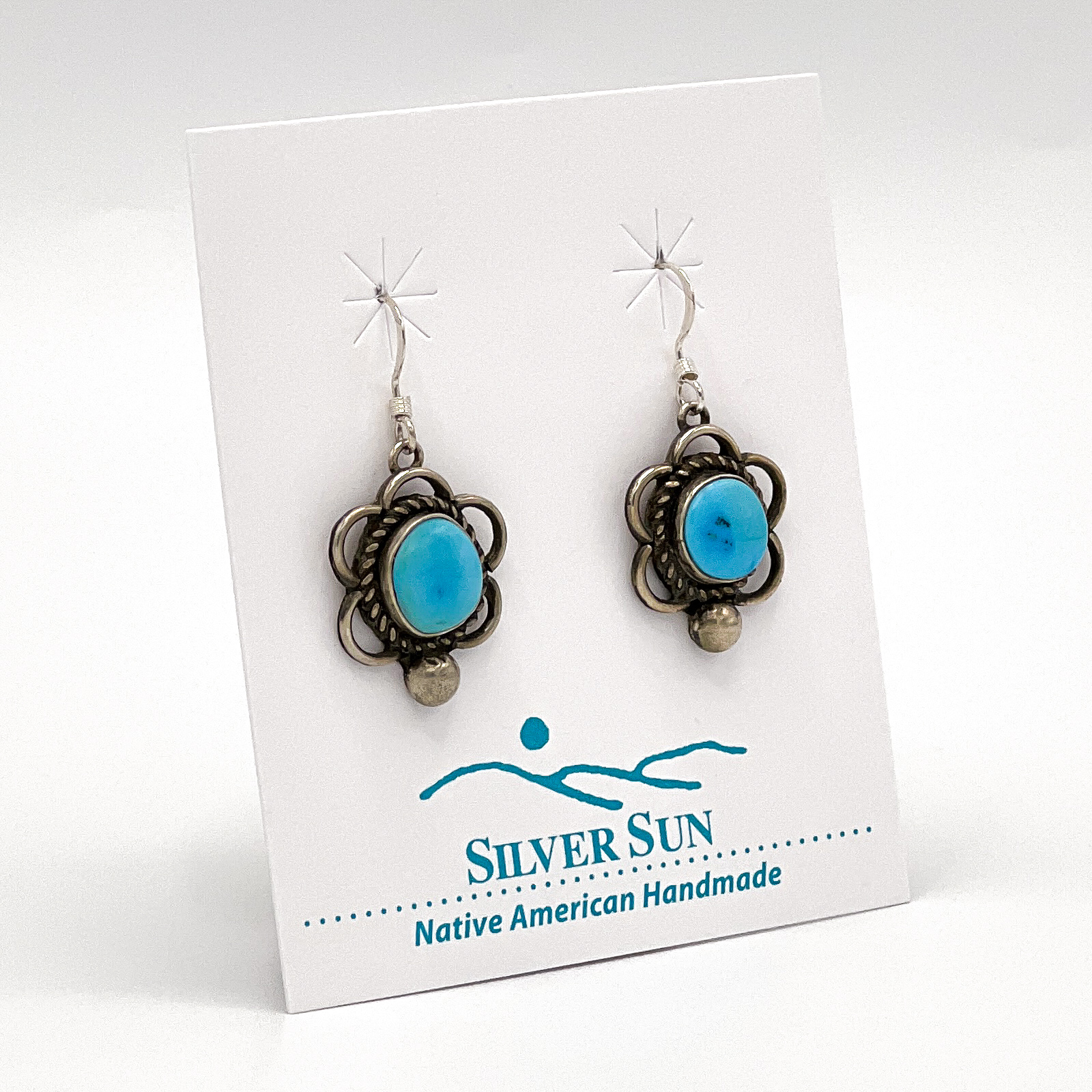 The antiqued, vintage setting brings out the bright, lively blue of these Blue Ridge turquoise. Open scallops and nice big raindrops complete the look.