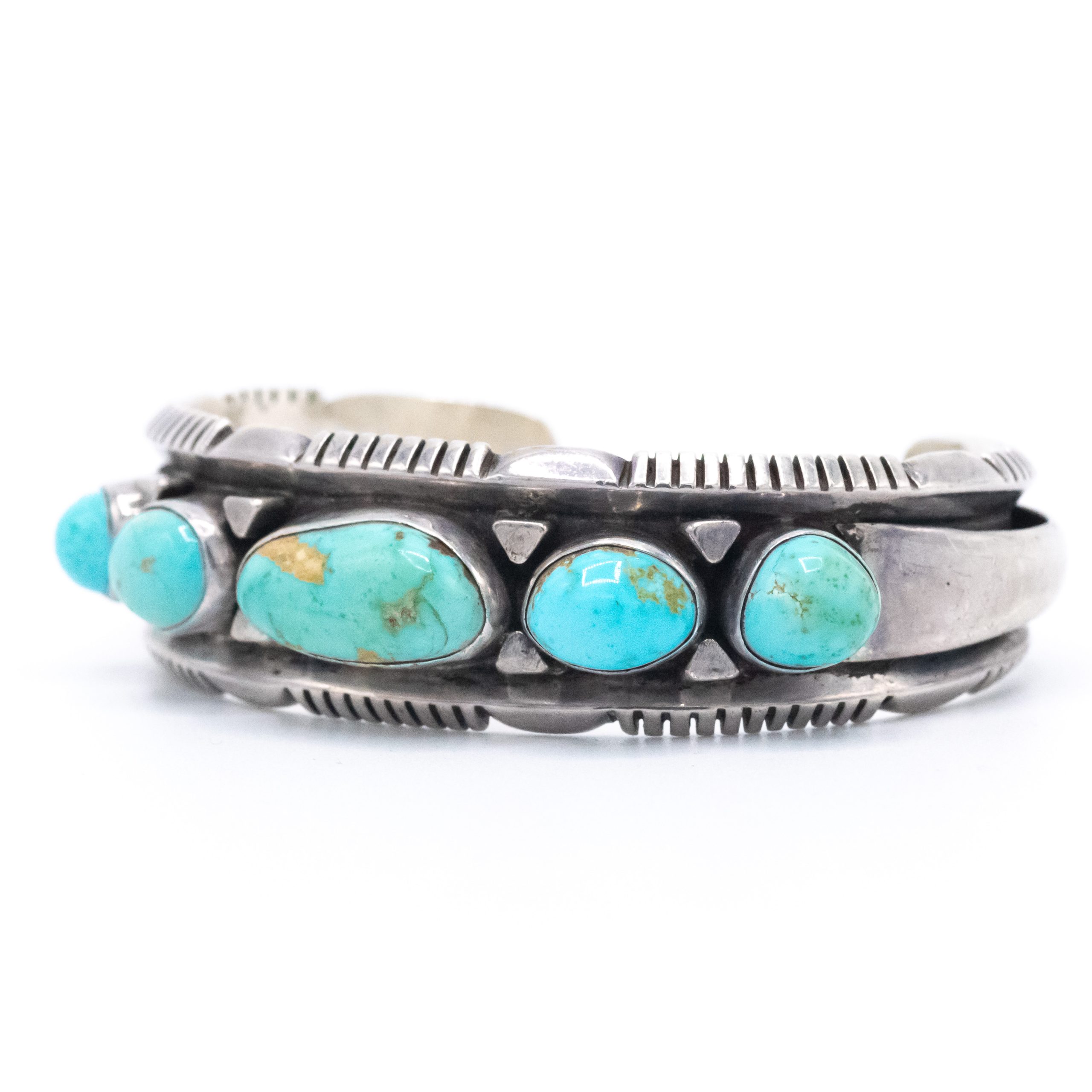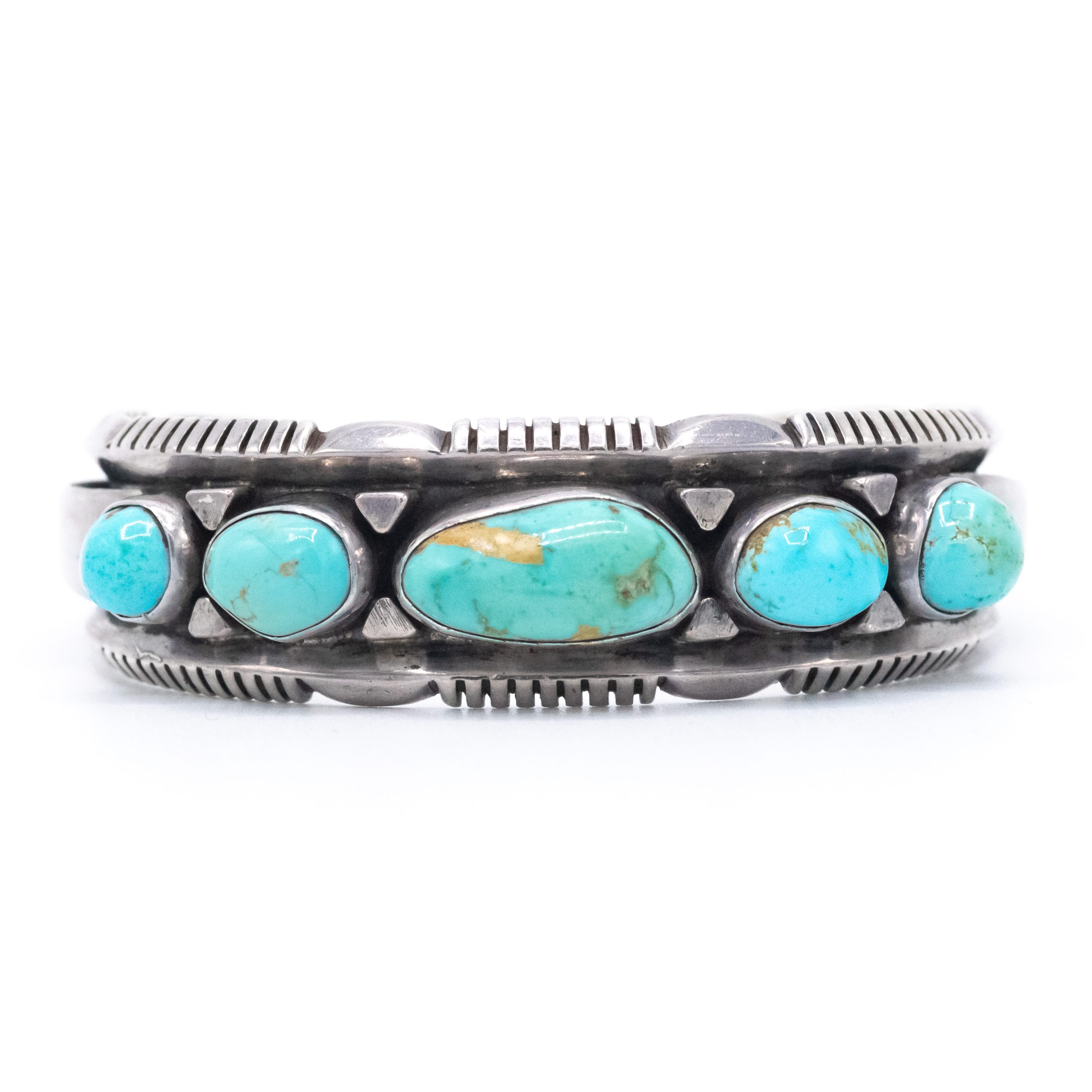 A row of natural Cerrillos stones show their changing colors, they sit inside silverwork showing a nice patina; excellent silversmithing by Delbert Vandever, Navajo. C. 1990.