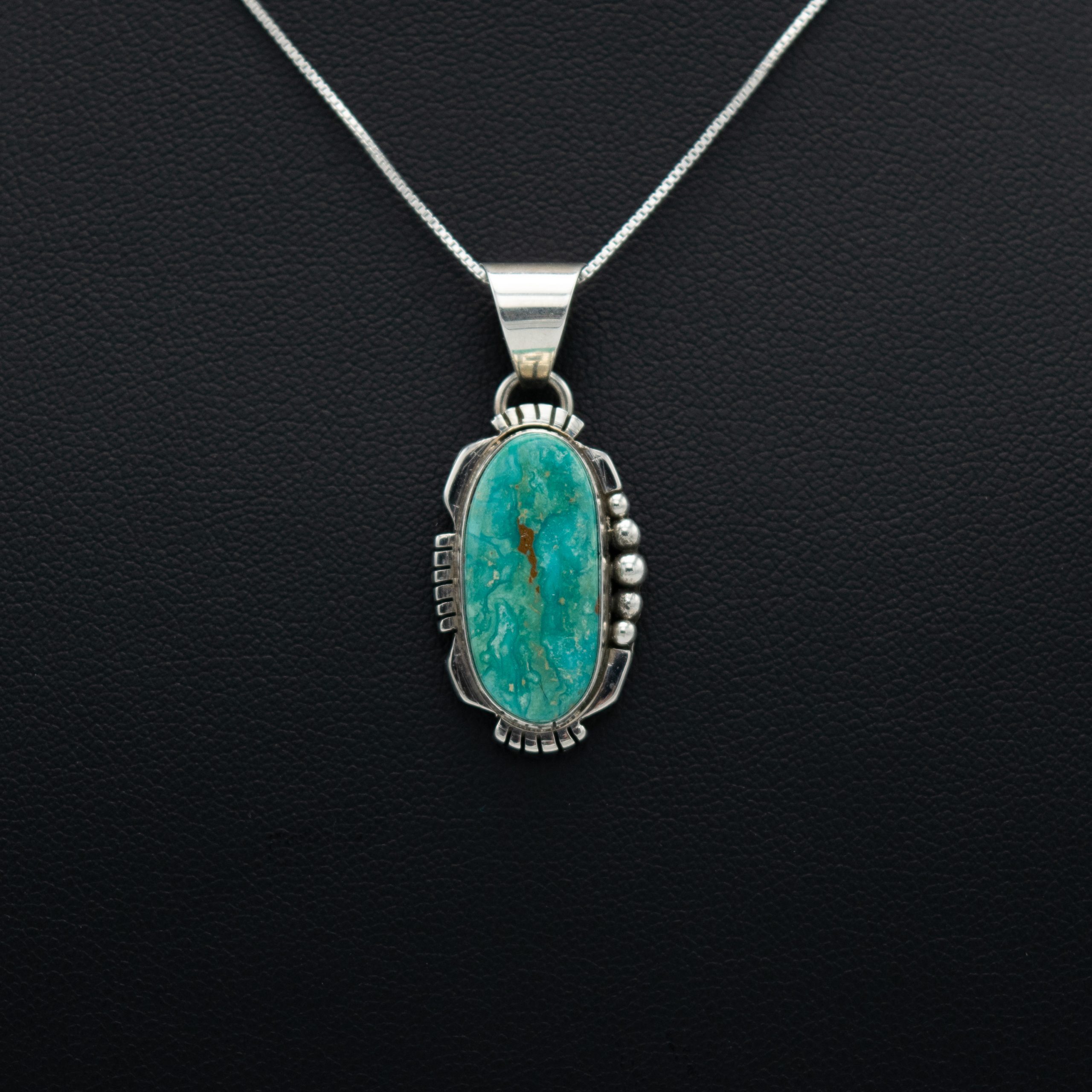 Ruth Ann Begay’s pendant is a tribute to the beauty of Fox Turquoise. Adorned with intricate silver detail, it’s a testament to Navajo craftsmanship.