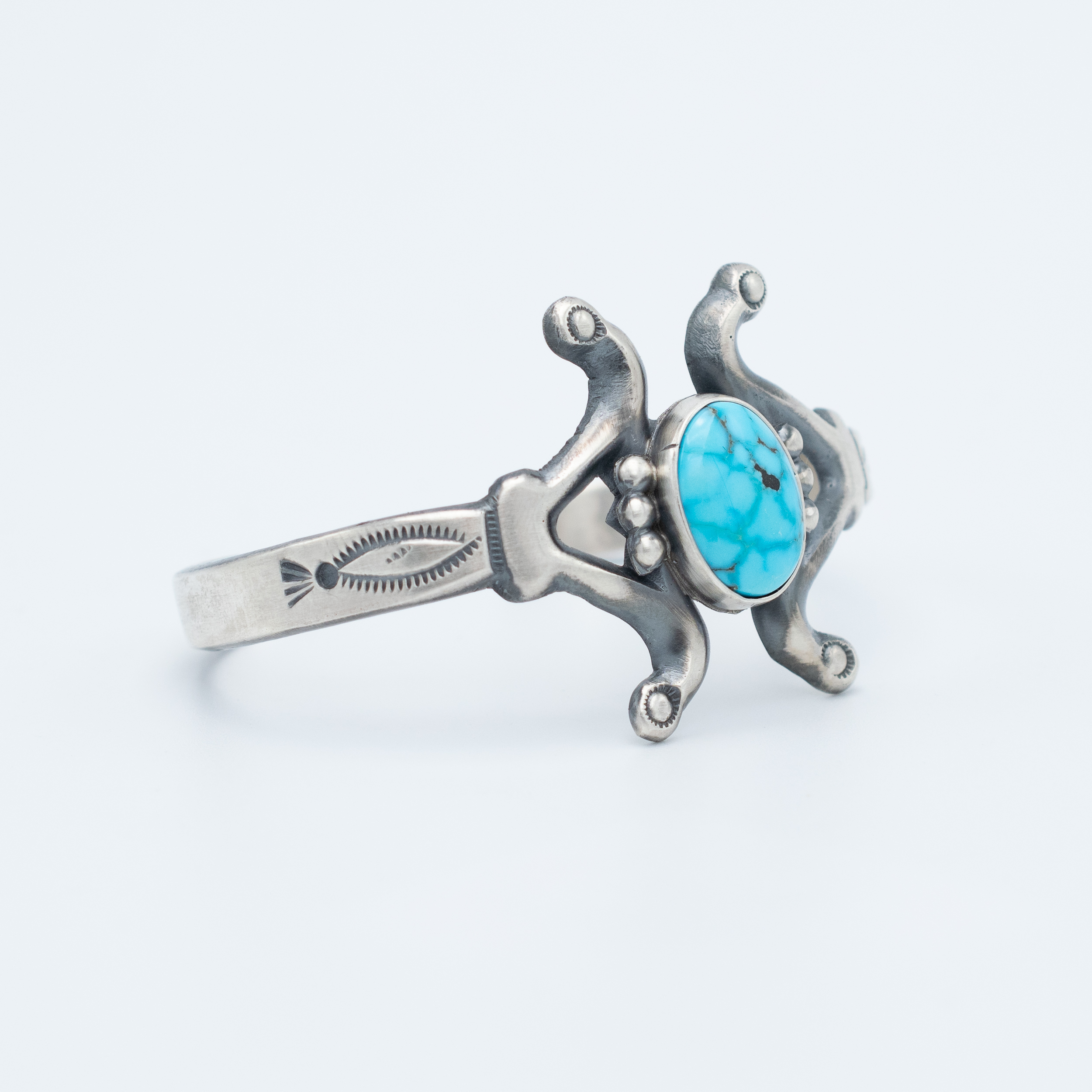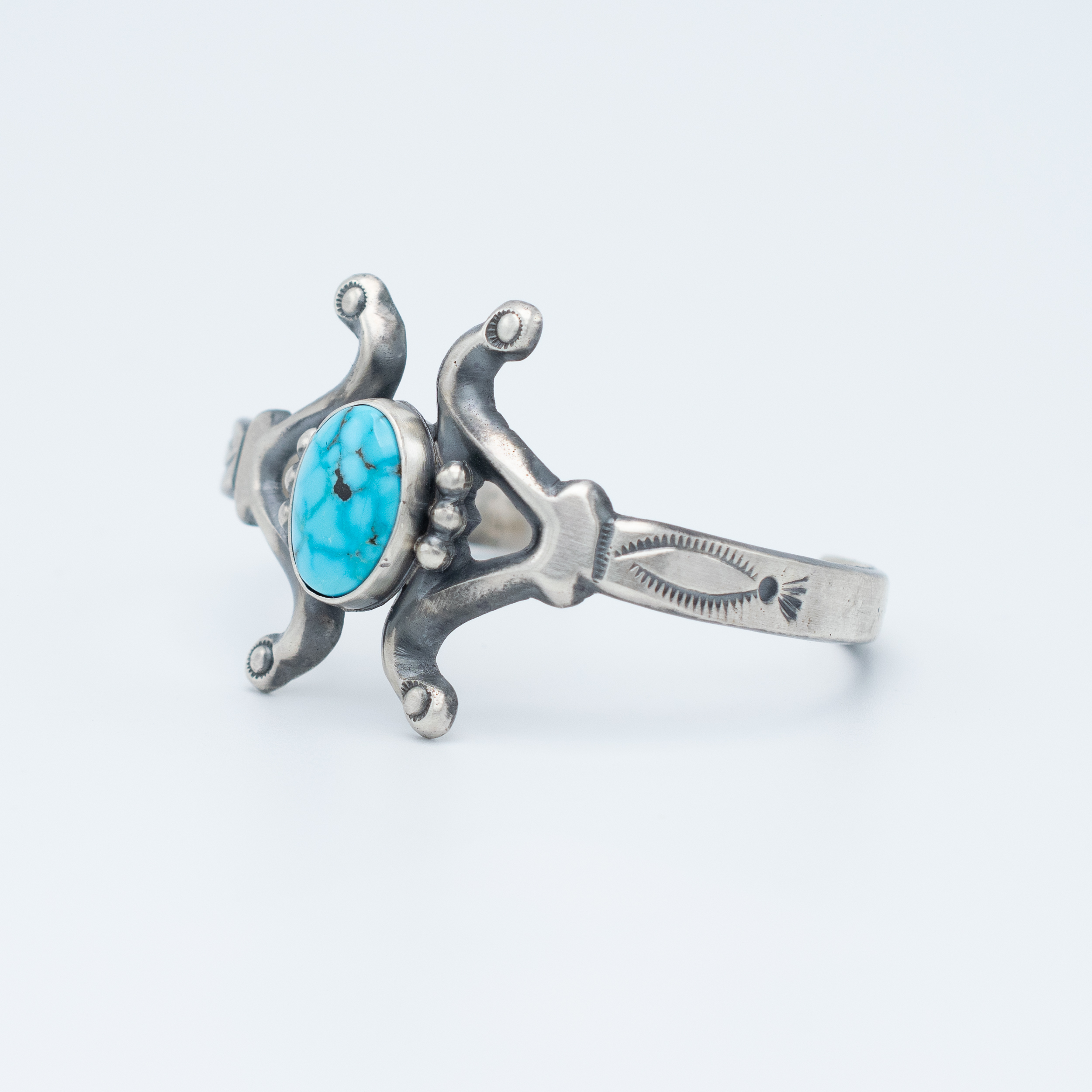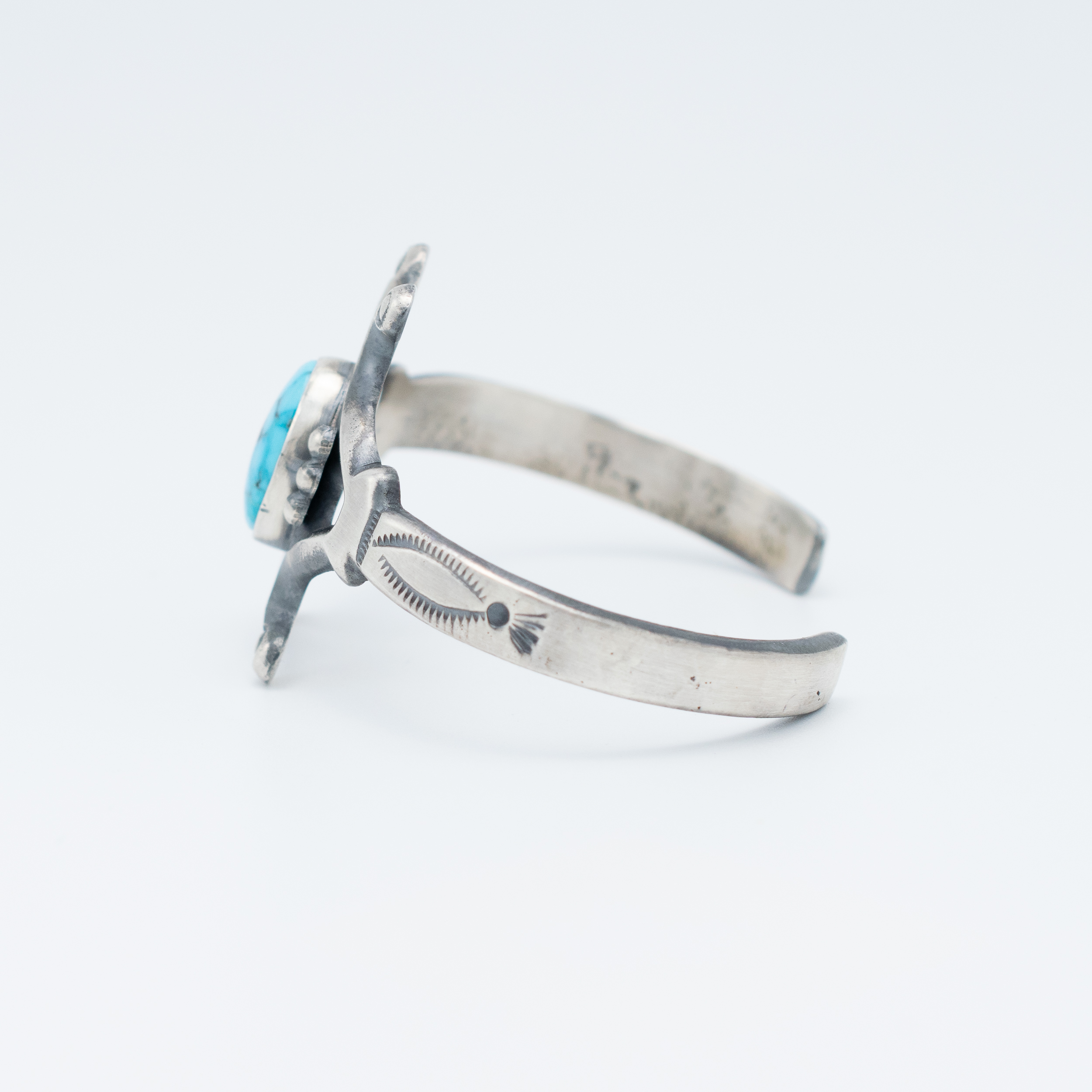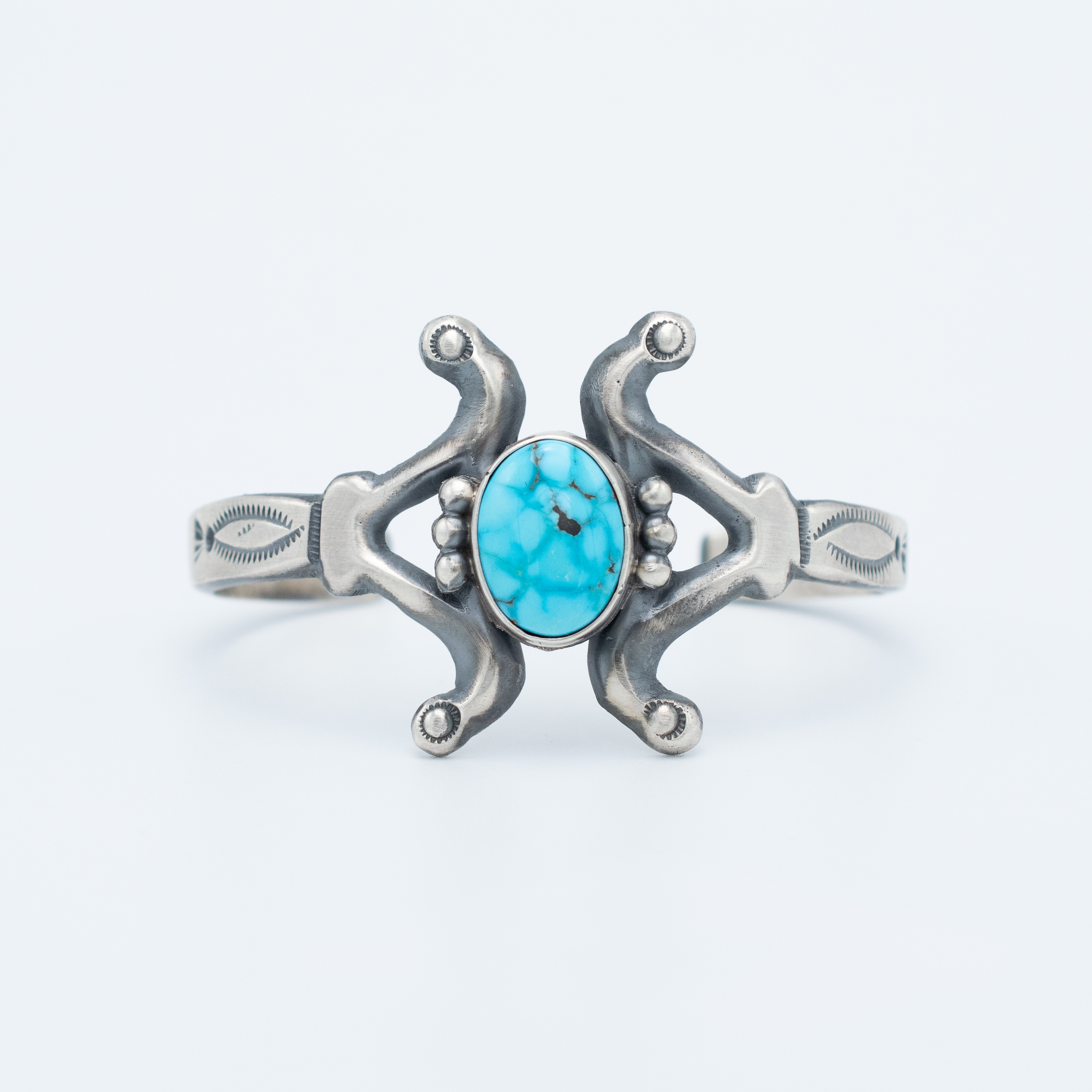 Harrison Bistue’s masterpiece celebrates the beauty of nature. This sandcast bracelet, reminiscent of a butterfly, showcases an exquisite Natural Kingman Turquoise stone.