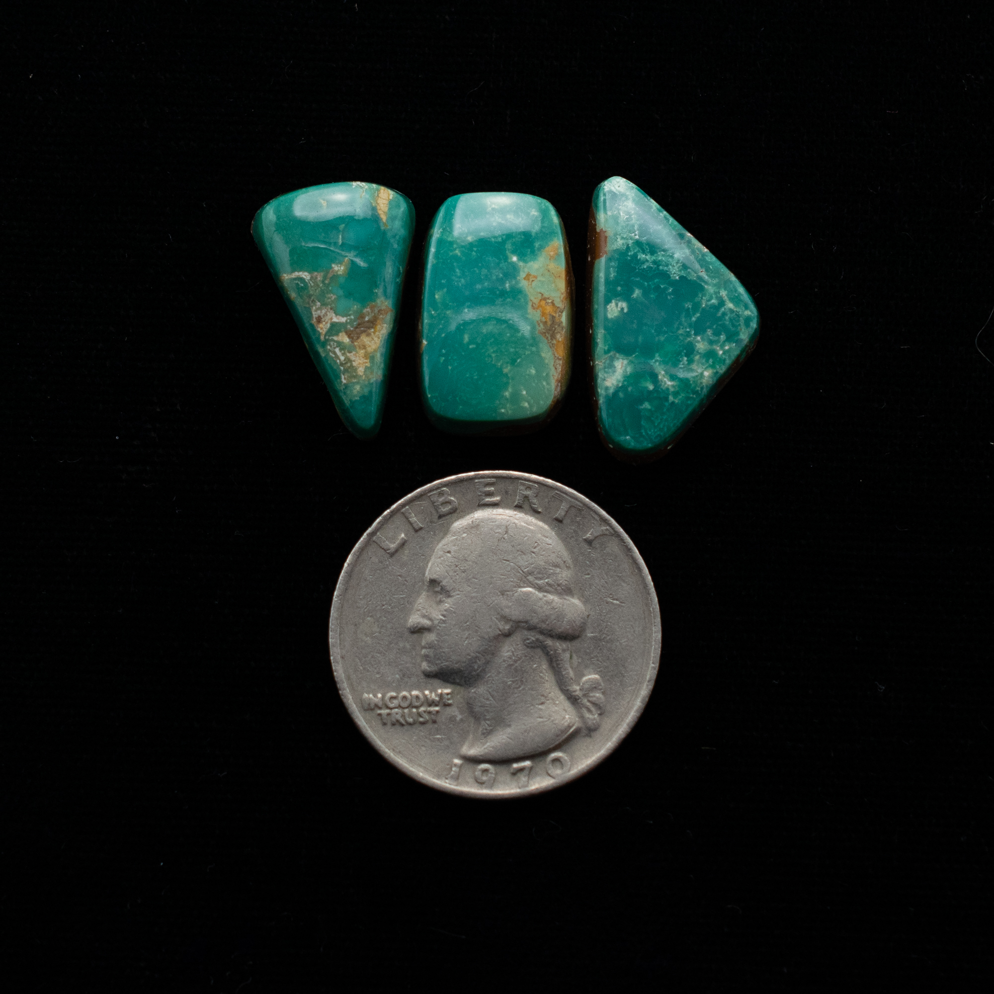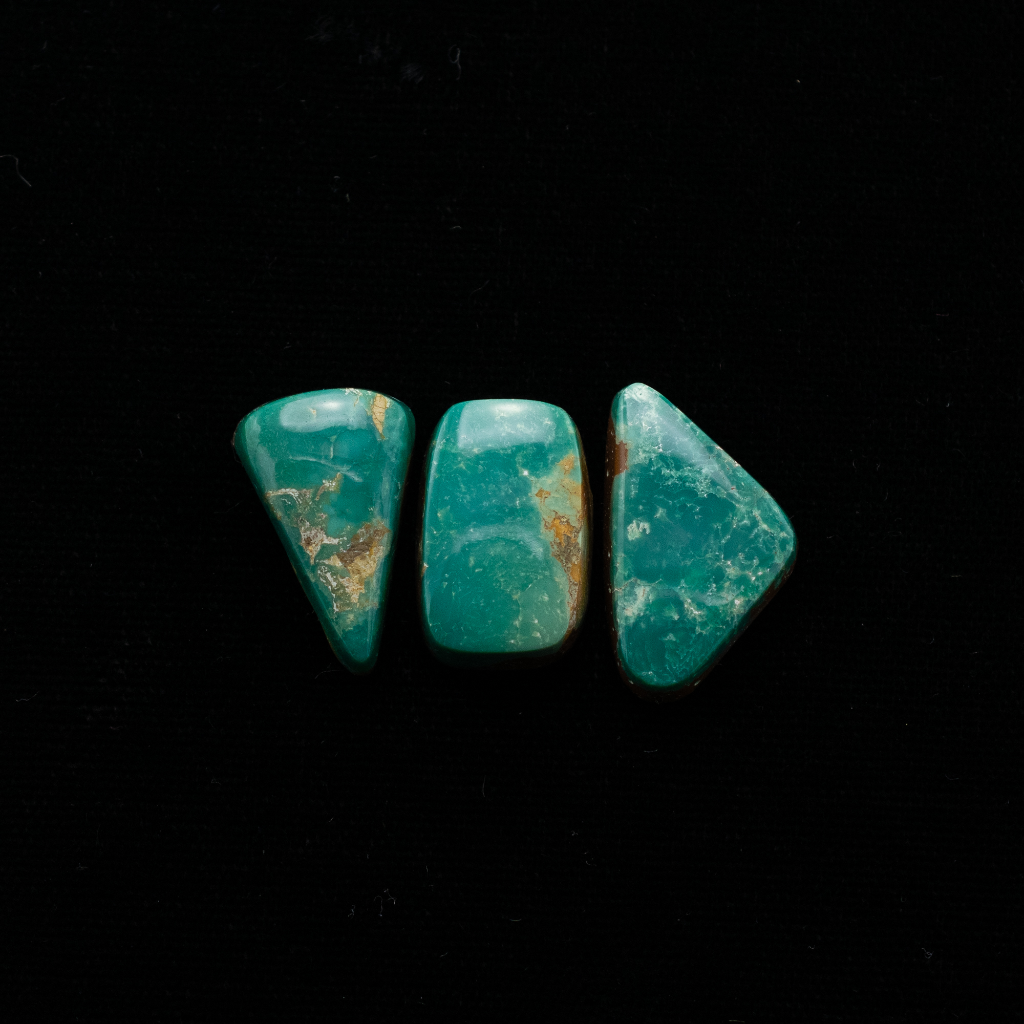 This Natural Ma’anshan Turquoise Cabochon Trio showcases three striking stones with a combined weight of 29 carats. With individual weights of 9.5, 10.5, and 9 carats, each cabochon displays its own unique blend of rich green-blue tones and warm golden-brown matrix patterns, a signature of this collectible turquoise from the Ma’anshan mine.