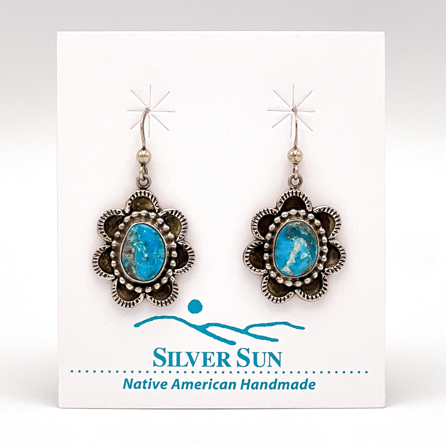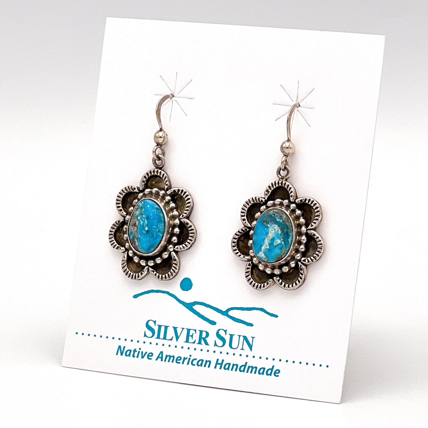 Intricately stamped silver scallops surround two beautiful blue turquoise MaAnshan stones. The Ma’Anshan in our collection was mined in China in the early 70’s.
