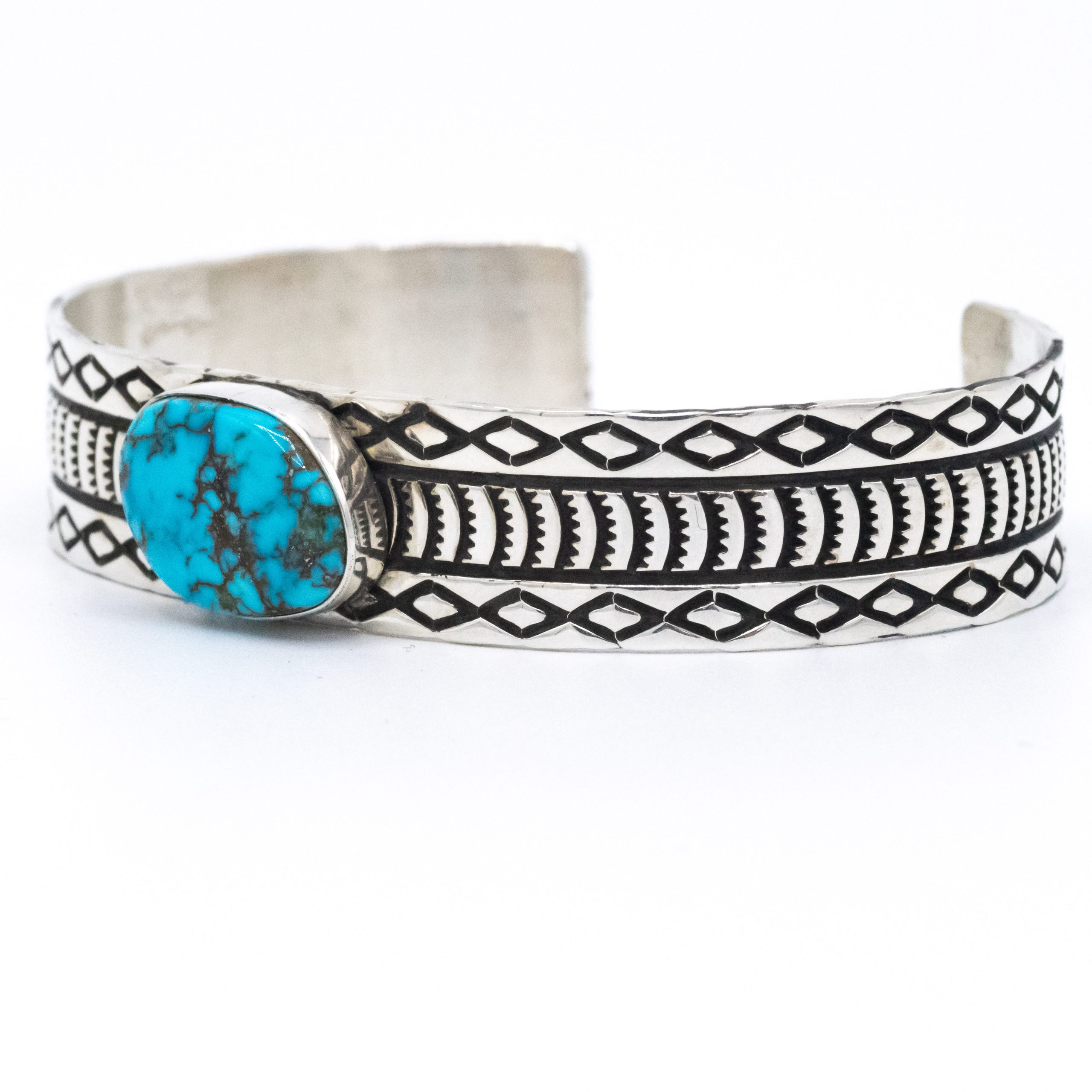 Webbing, like lightning strikes and the color of chocolate, move through this intense blue Morenci turquoise stone. The stamped silver shank is just right.