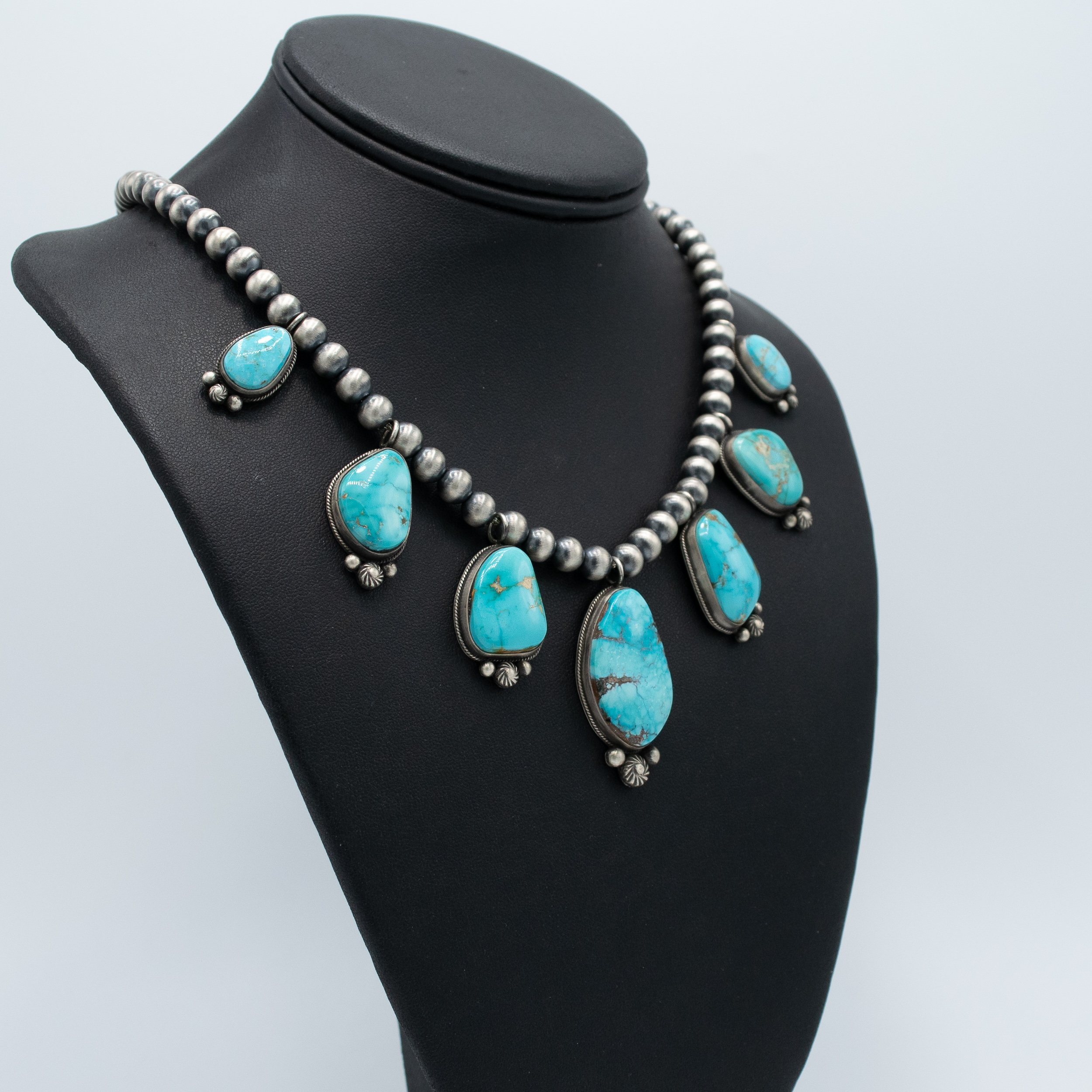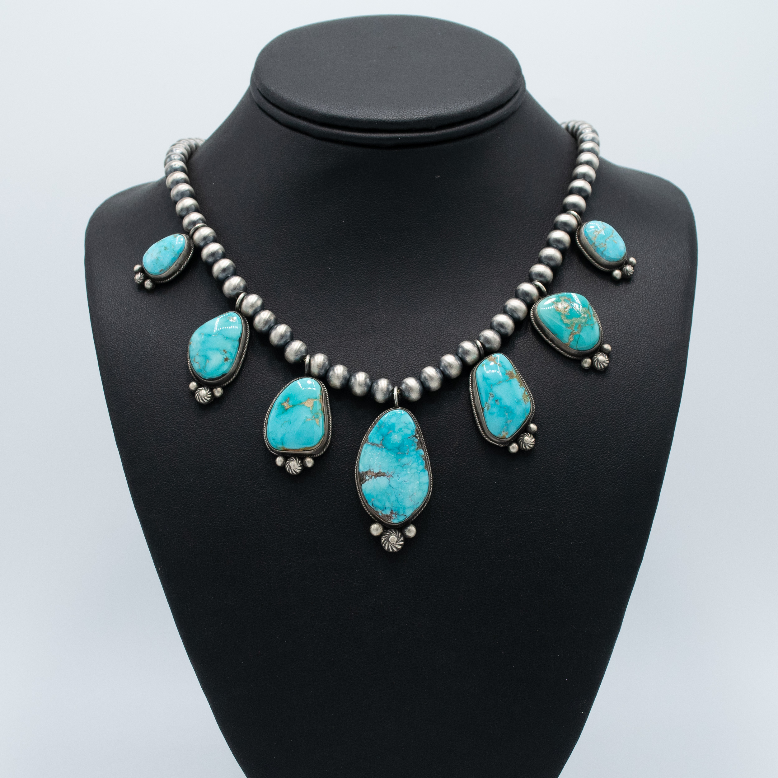 This incredible Natural Royston Turquoise has been set in sterling silver by Bryant Martinez on Navajo Pearls. Each stone sings a song that is captivating and mysterious.