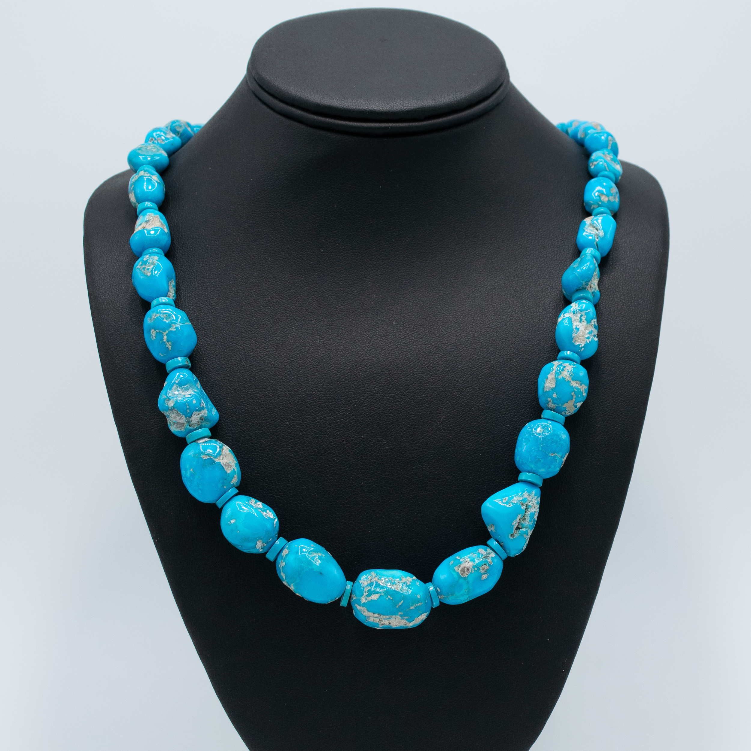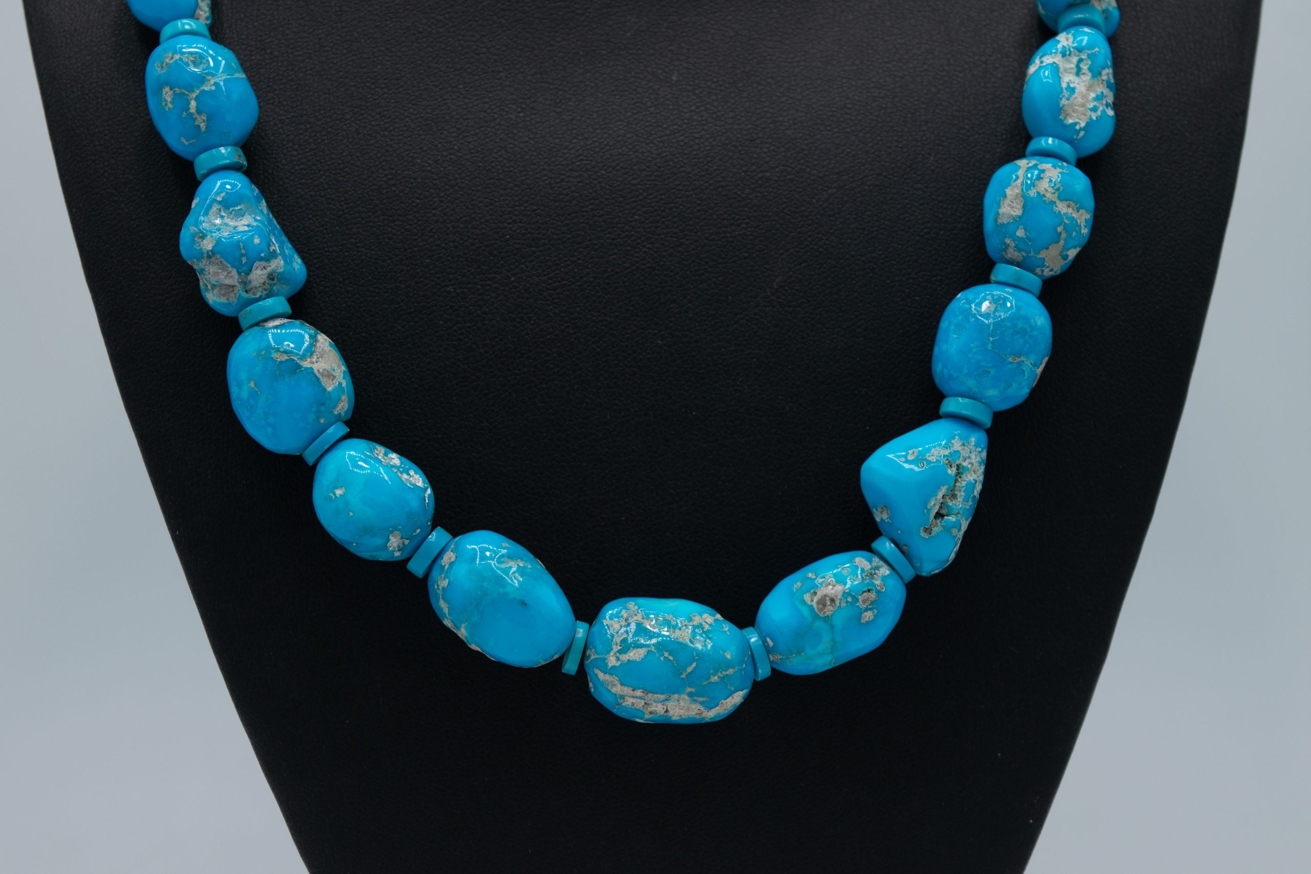 Remarkable Natural Sleeping Beauty Bead Necklace strung by Kathleen Sanchez. The beads are still a bit rough so they have lots of character and depth but all have that sky blue characteristic of the Sleeping Beauty mine.
