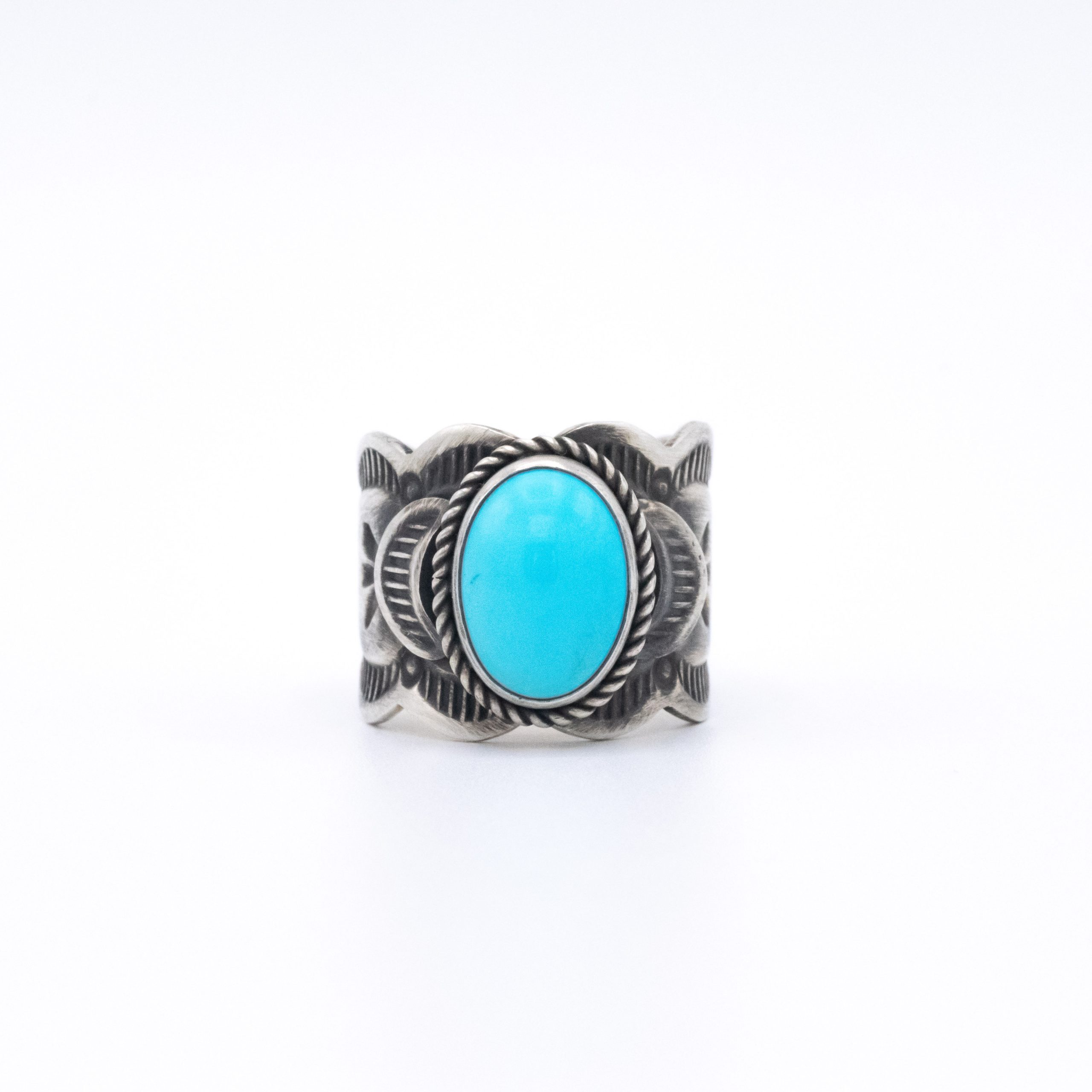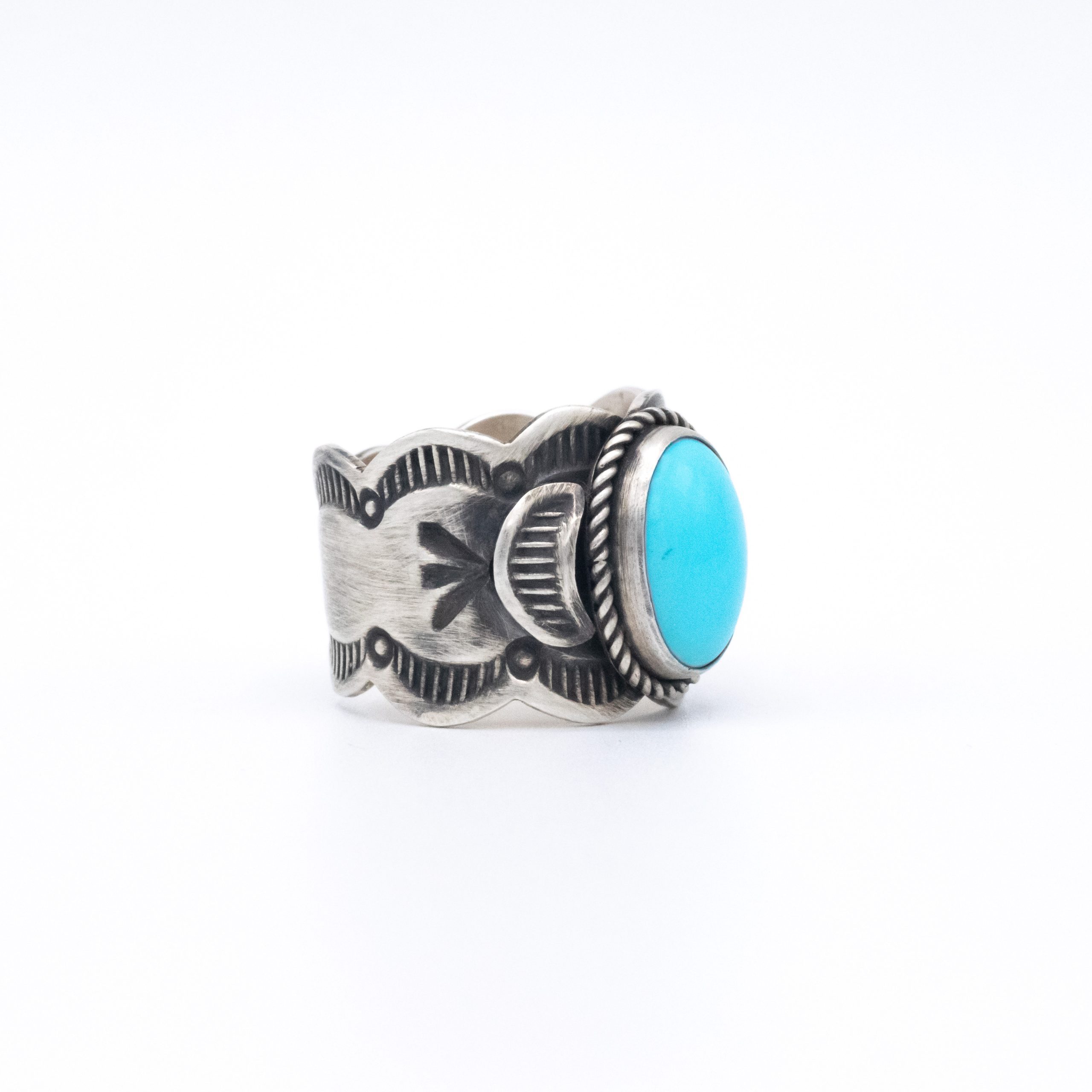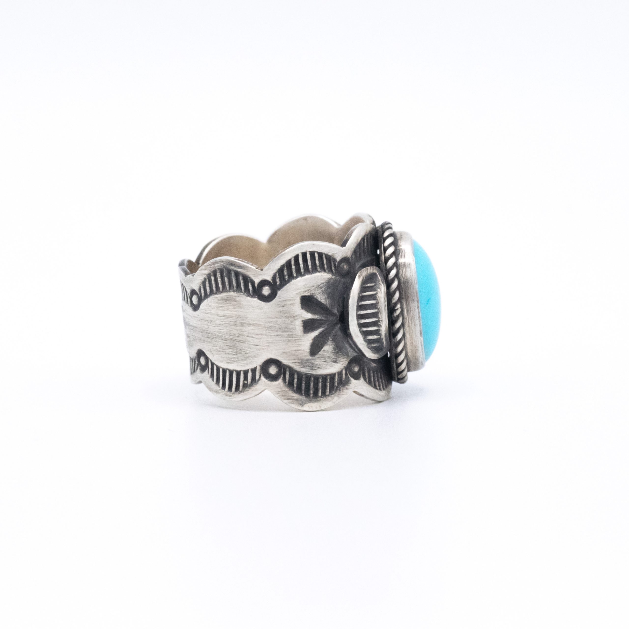 An antiqued stamped scalloped shank features a bright and light natural Sleeping Beauty turquoise stone, a great look and a beautiful contrast!