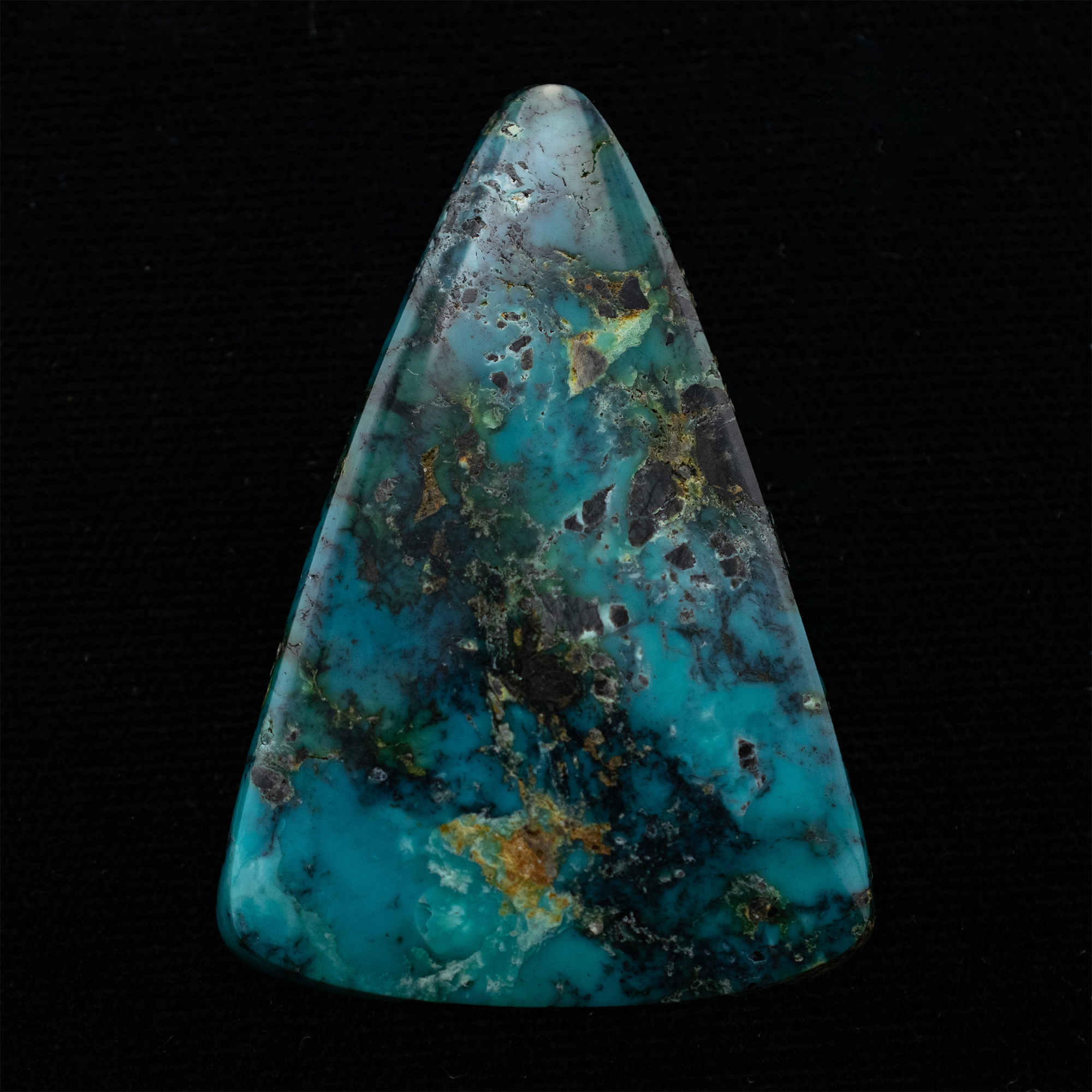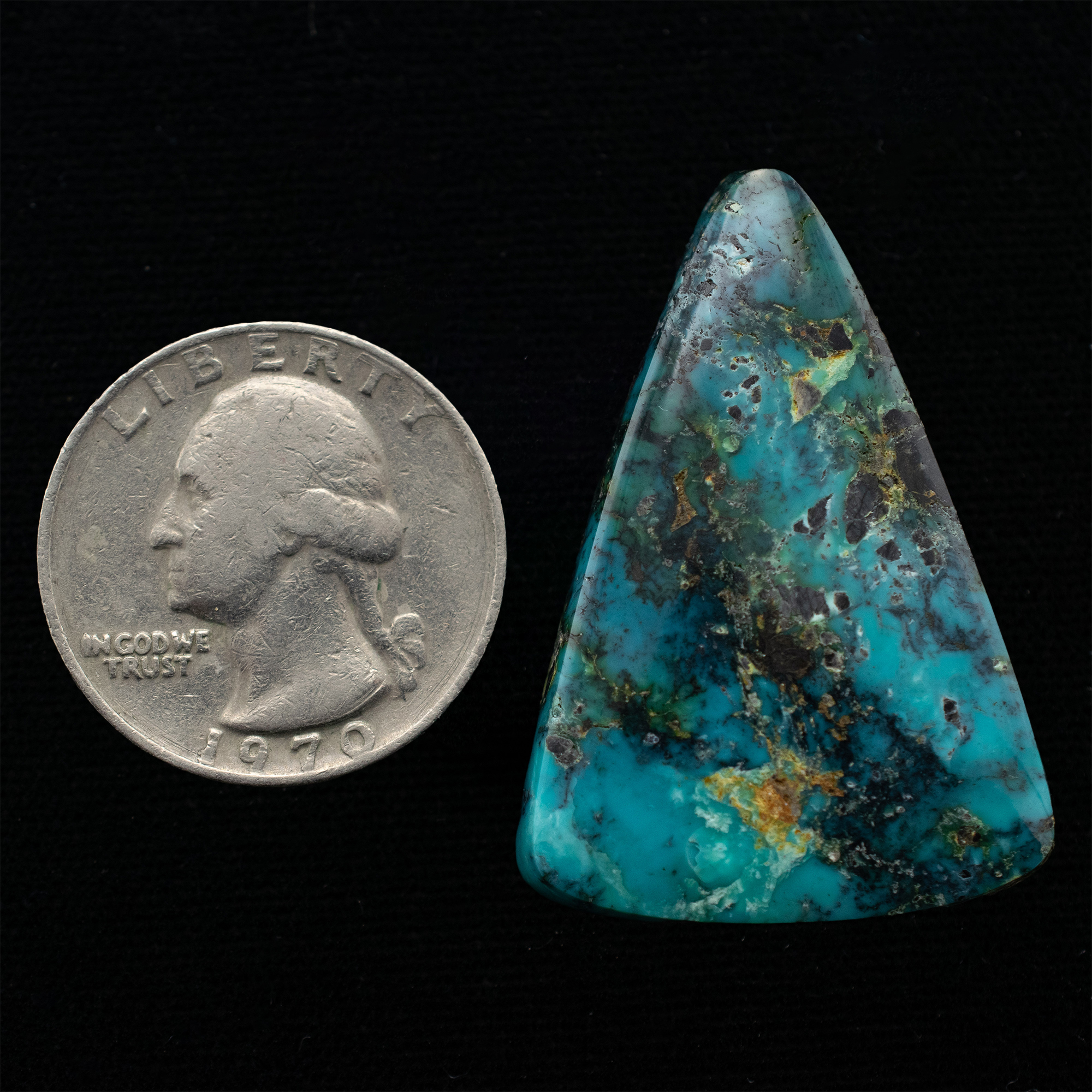 This dark and moody turquoise comes from Elko, Nevada. We purchases this cab from Al Jaramillo, owner of the Sacred Buffalo Gallery, back in the 1980’s.