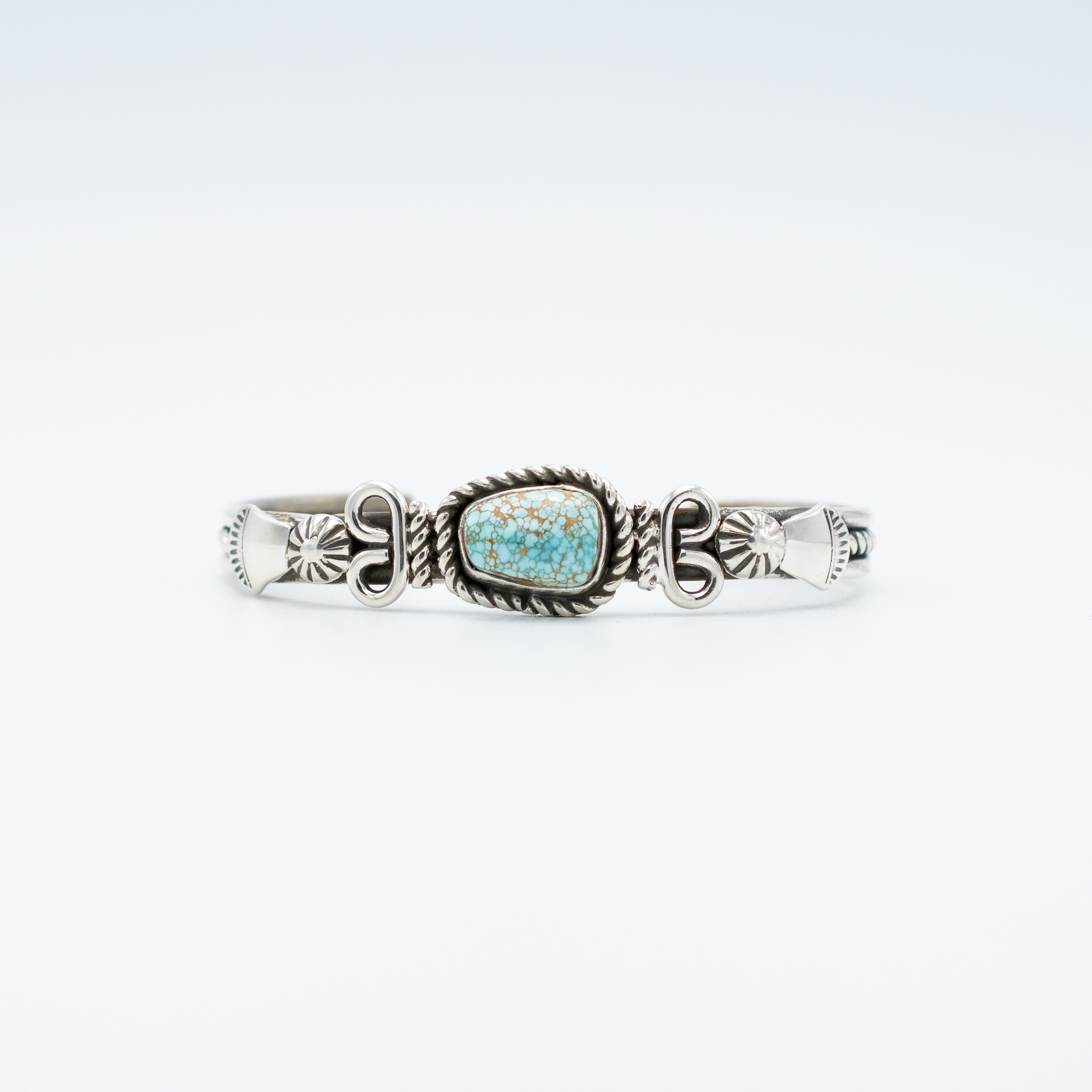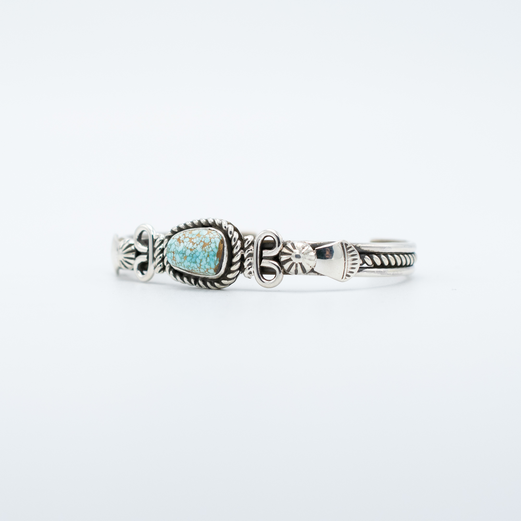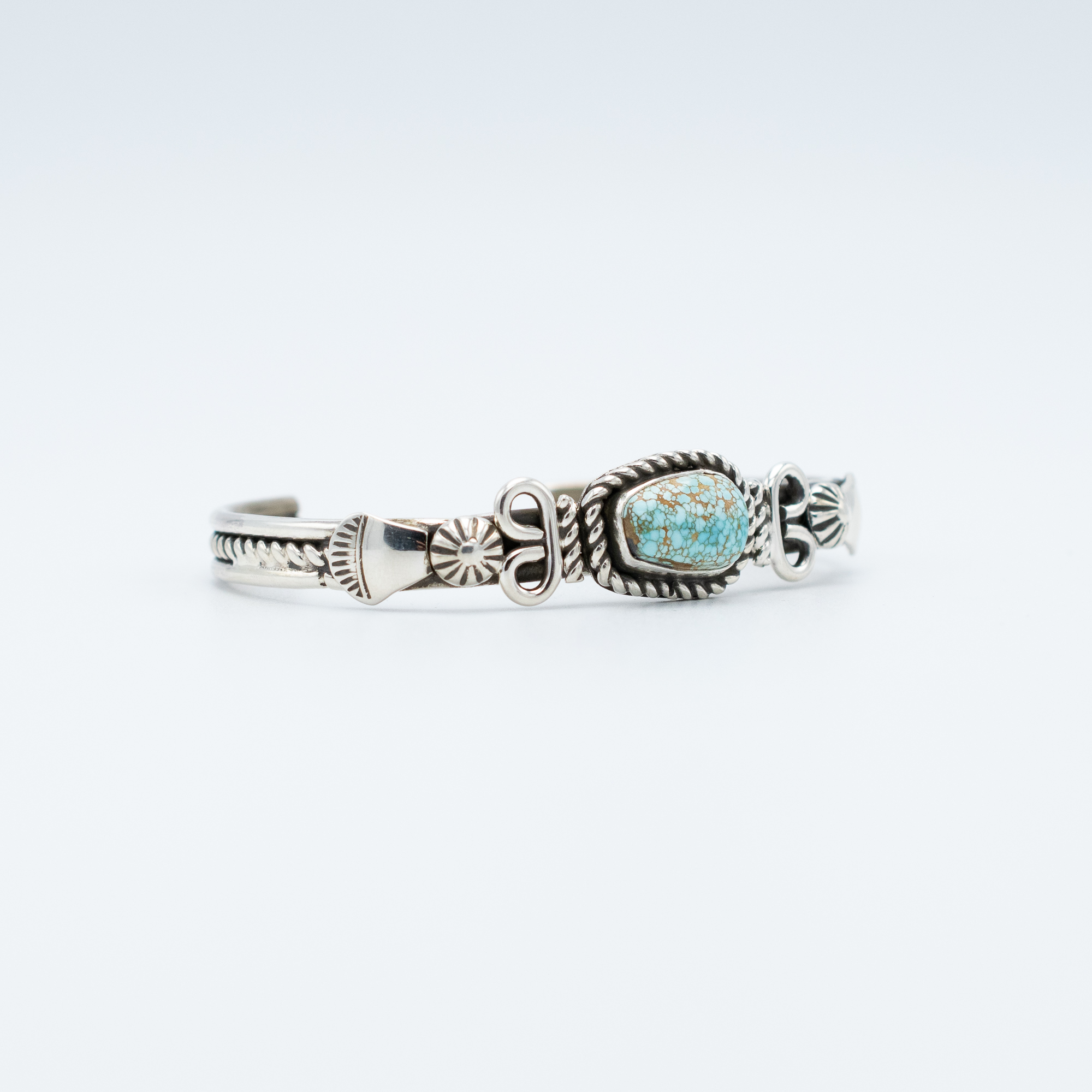This Natural Number 8 Turquoise Bracelet by Navajo artist Ruth Ann Begay features a beautiful webbed turquoise stone framed by a twisted silver bezel. Decorative scrolls, stamped motifs, and a carefully crafted band highlight Ruth Ann’s signature style and attention to detail. A classic piece that pays homage to the artistry of Navajo silversmithing.
