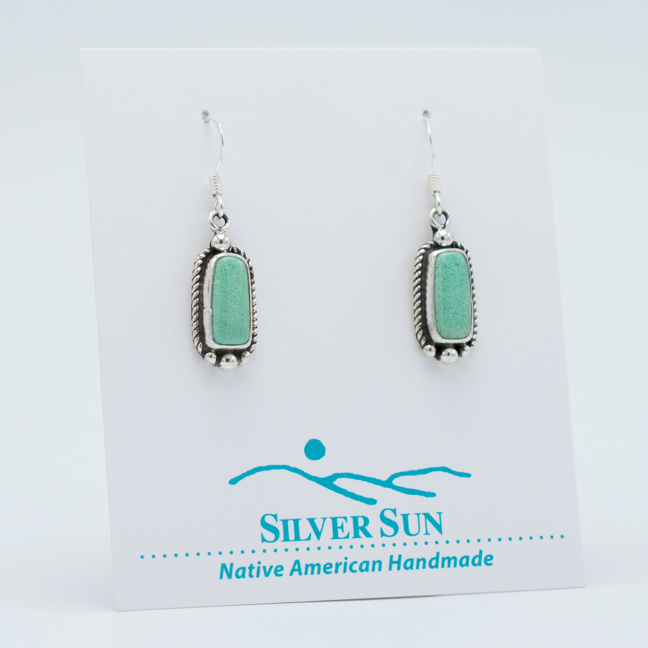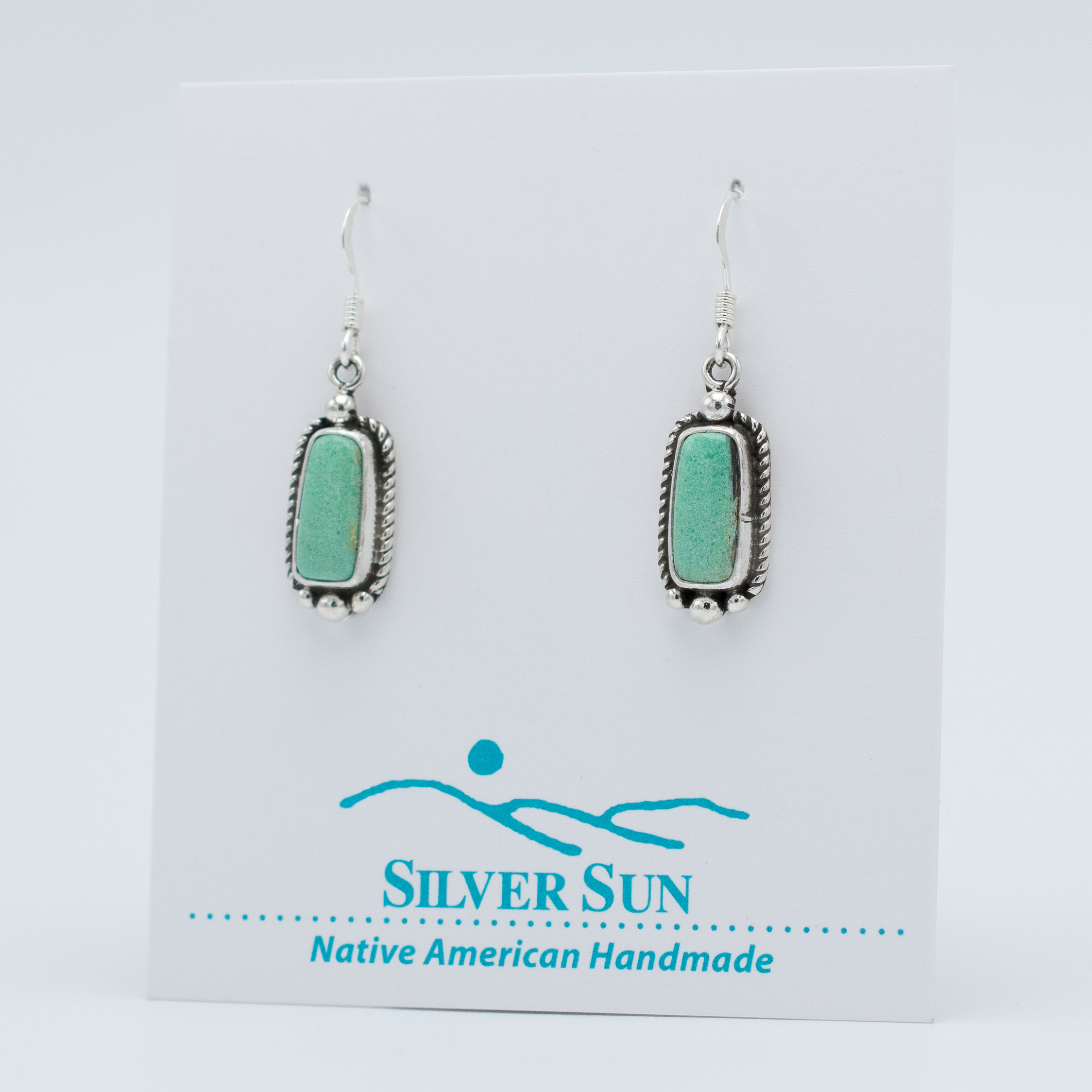 These elegant dangle earrings by Ruth Ann Begay showcase rectangular aquamarine-colored Orville Jack turquoise stones. The stones are set in plain bezels, surrounded by silver twist wire along the edges, and accented with silver raindrops at the top and bottom, creating a refined and sophisticated look.