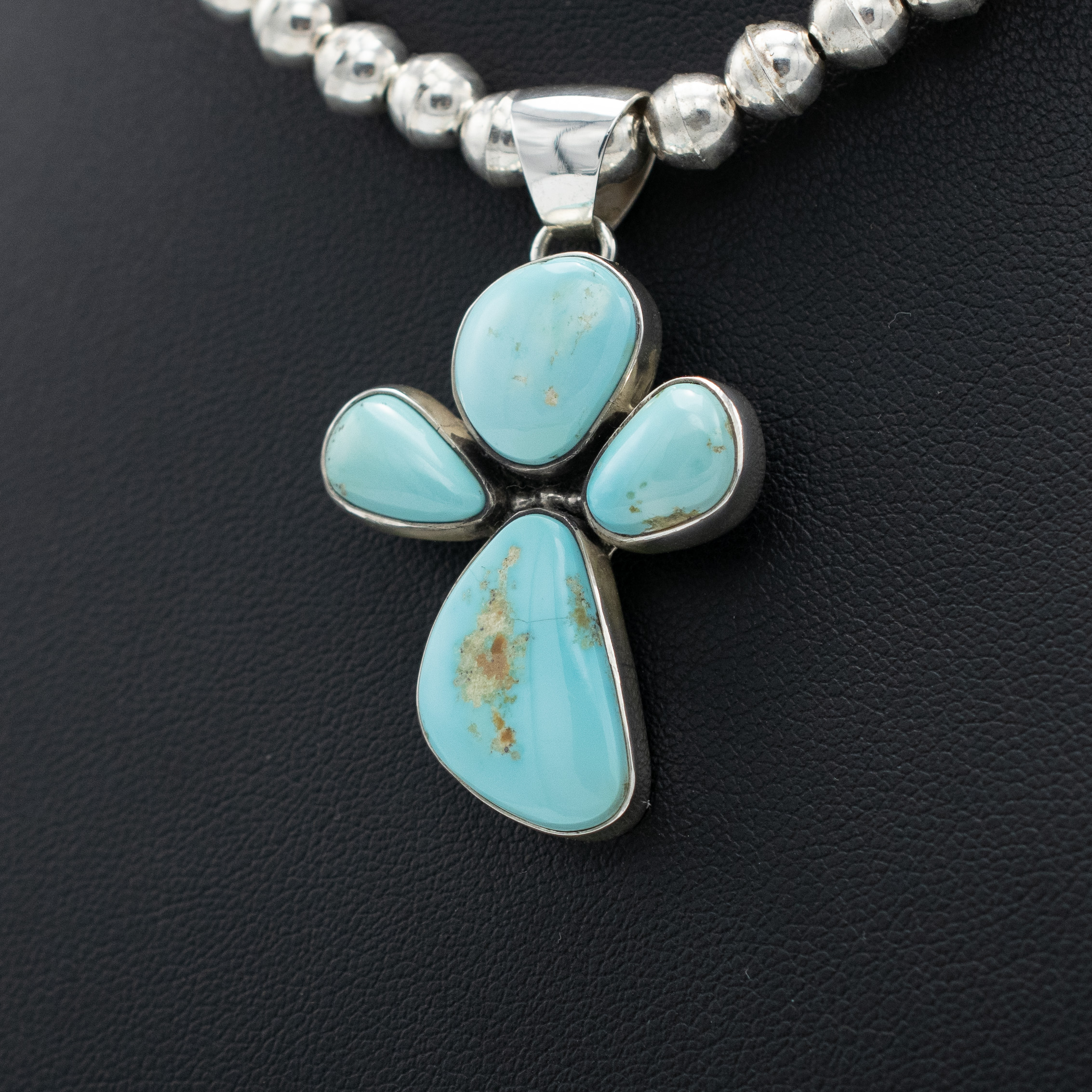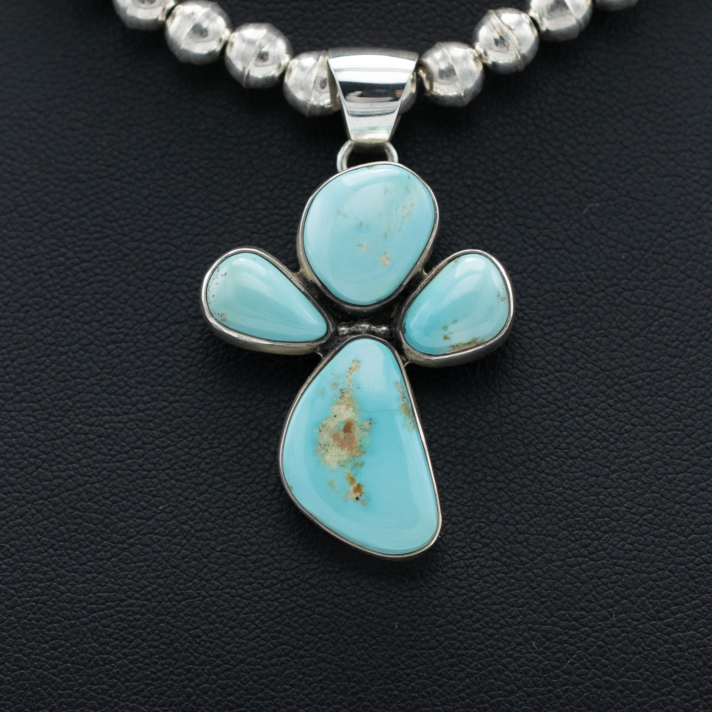 The Persian Turquoise Hugs Pendant by Bryant Martinez showcases a harmonious blend of four uniquely shaped Persian turquoise stones arranged in a “hugging” formation. Each stone features its natural variations, creating a soft yet striking palette of light blue hues complemented by subtle matrix patterns. Set in sterling silver, this pendant radiates warmth and elegance, perfect for adding a touch of Southwestern charm to any ensemble.