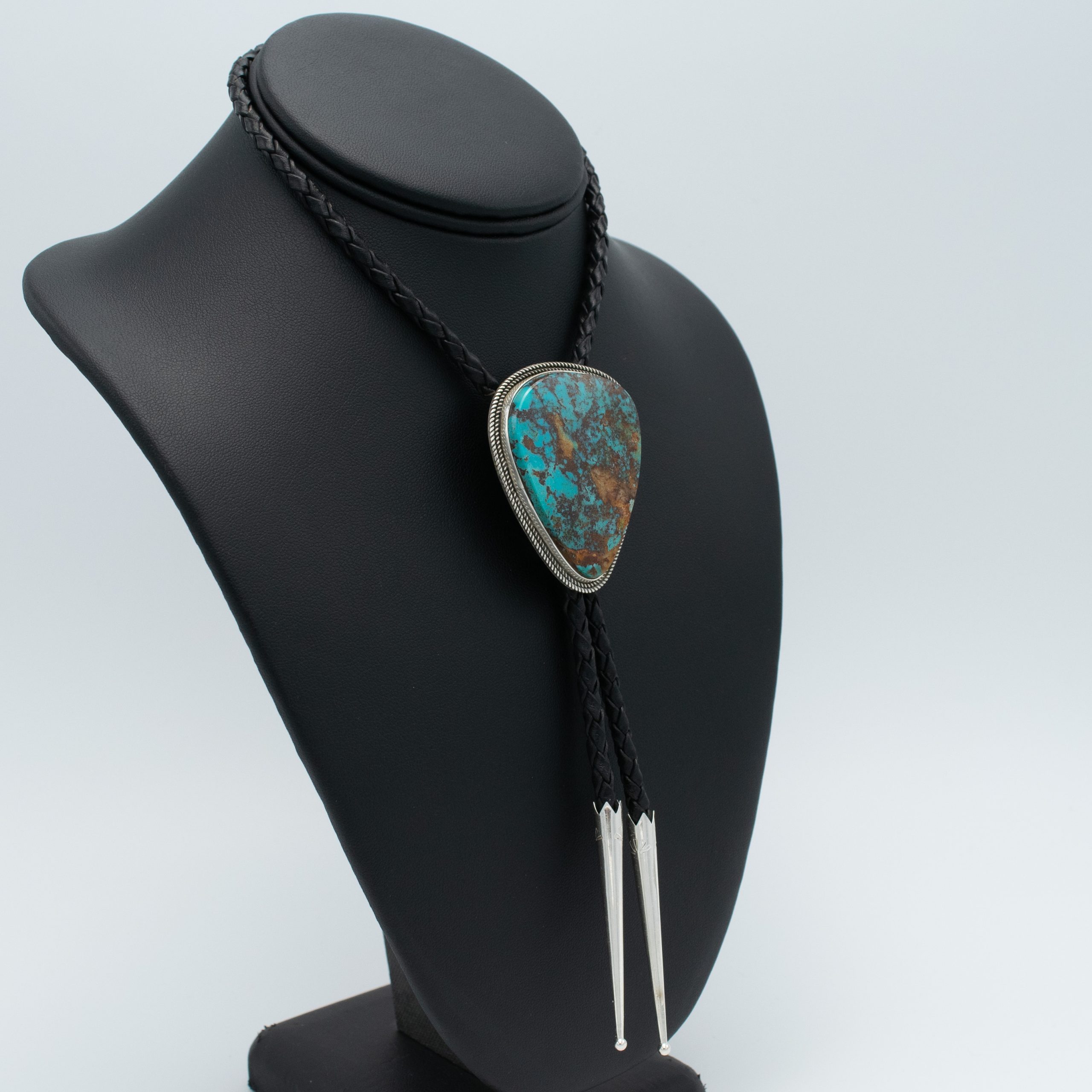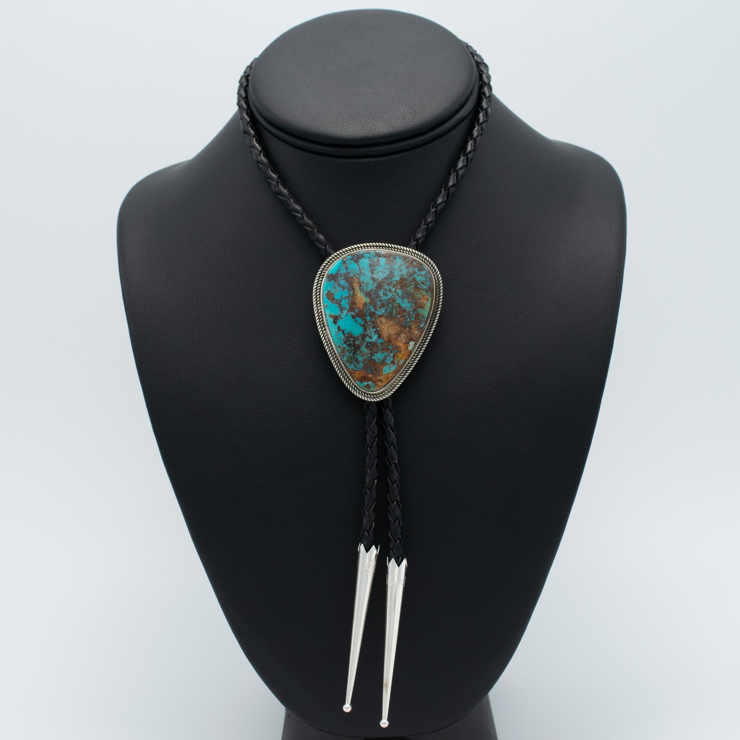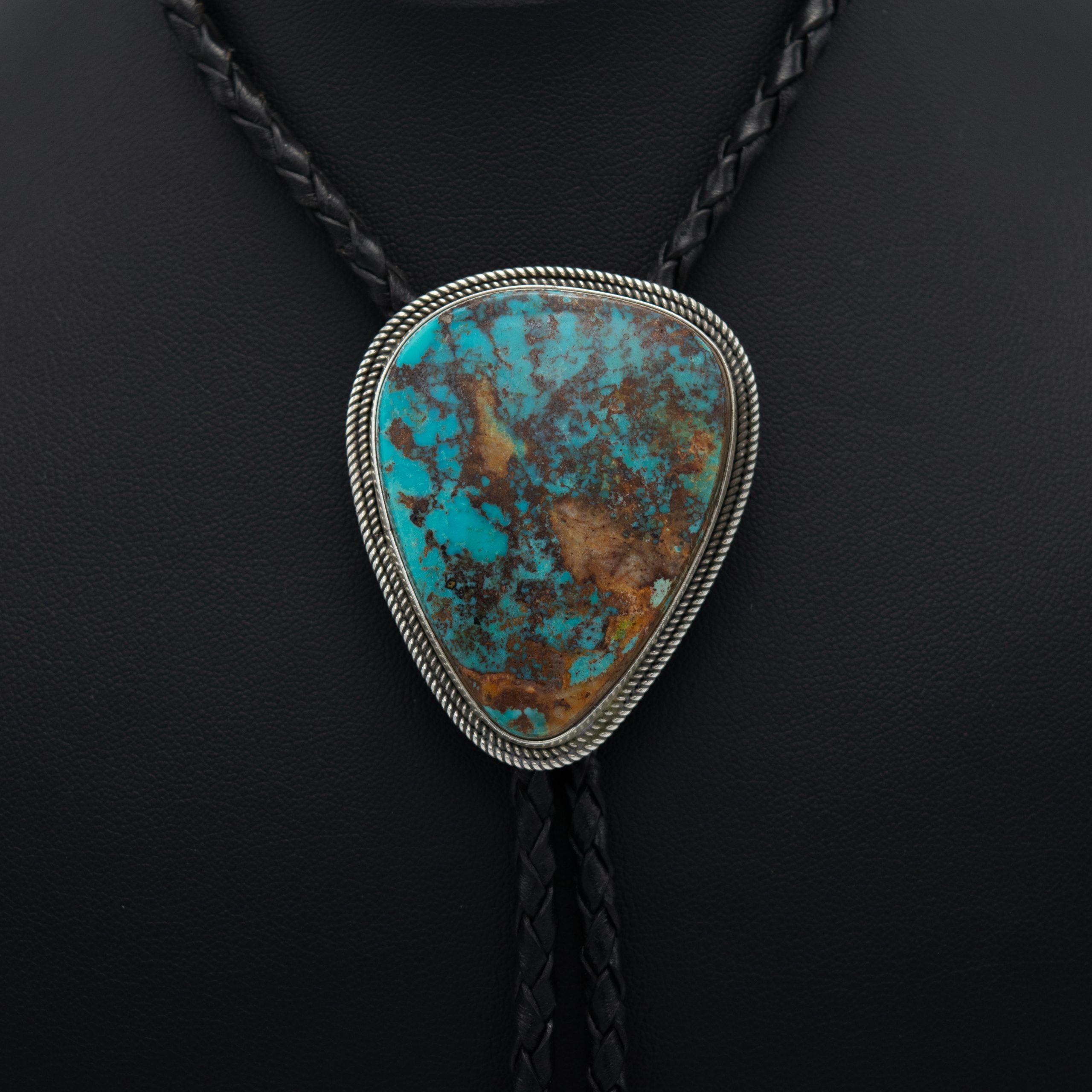 The Pilot Mountain Turquoise Bolo Tie by Bryant Martinez is a stunning piece of jewelry that embodies the rich heritage and craftsmanship of Navajo artisans. The turquoise stone at its center showcases an incredible array of colors, blending red, brown, and teal in a harmonious display. Framed by double twisted silver wire, the stone is securely and elegantly set, making a bold statement as it rests on the wearer’s chest. This bolo tie is a perfect for those looking to add a touch of Southwestern elegance to their attire!