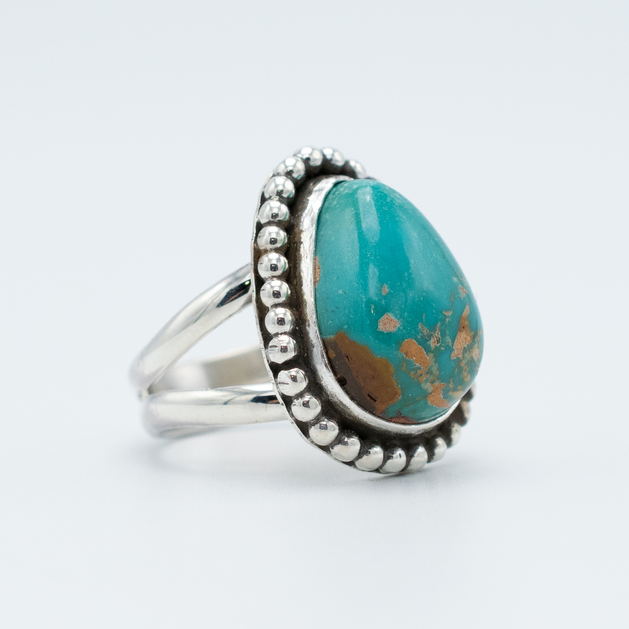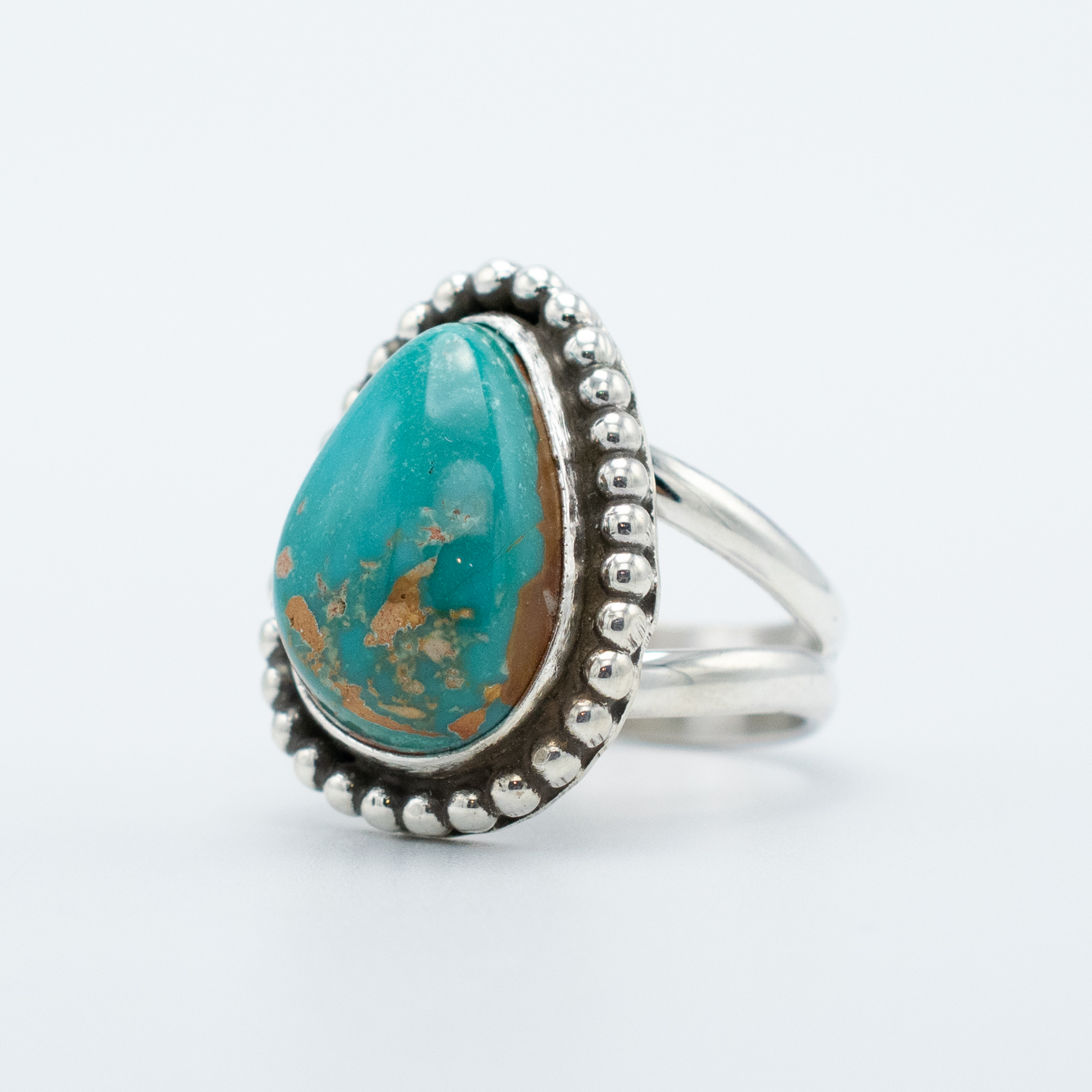 This Natural Pilot Mountain Turquoise Ring by Navajo artist Ruth Ann Begay highlights the warm, earthy beauty this Nevada mine is known for. The pear-shaped stone displays rich teal tones touched with golden-brown matrix, creating a striking blend of color and character. Set in a smooth sterling silver bezel and framed by a bold row of hand-placed sterling beads, the ring balances elegance with classic Southwestern style. Finished with a split-shank band for a comfortable fit, this piece is a timeless addition to any turquoise collection.