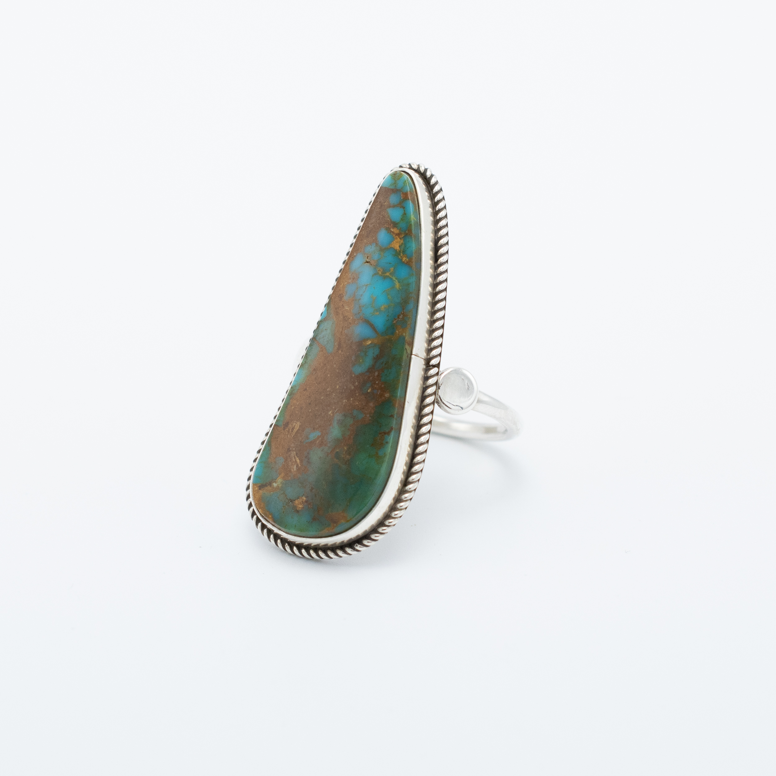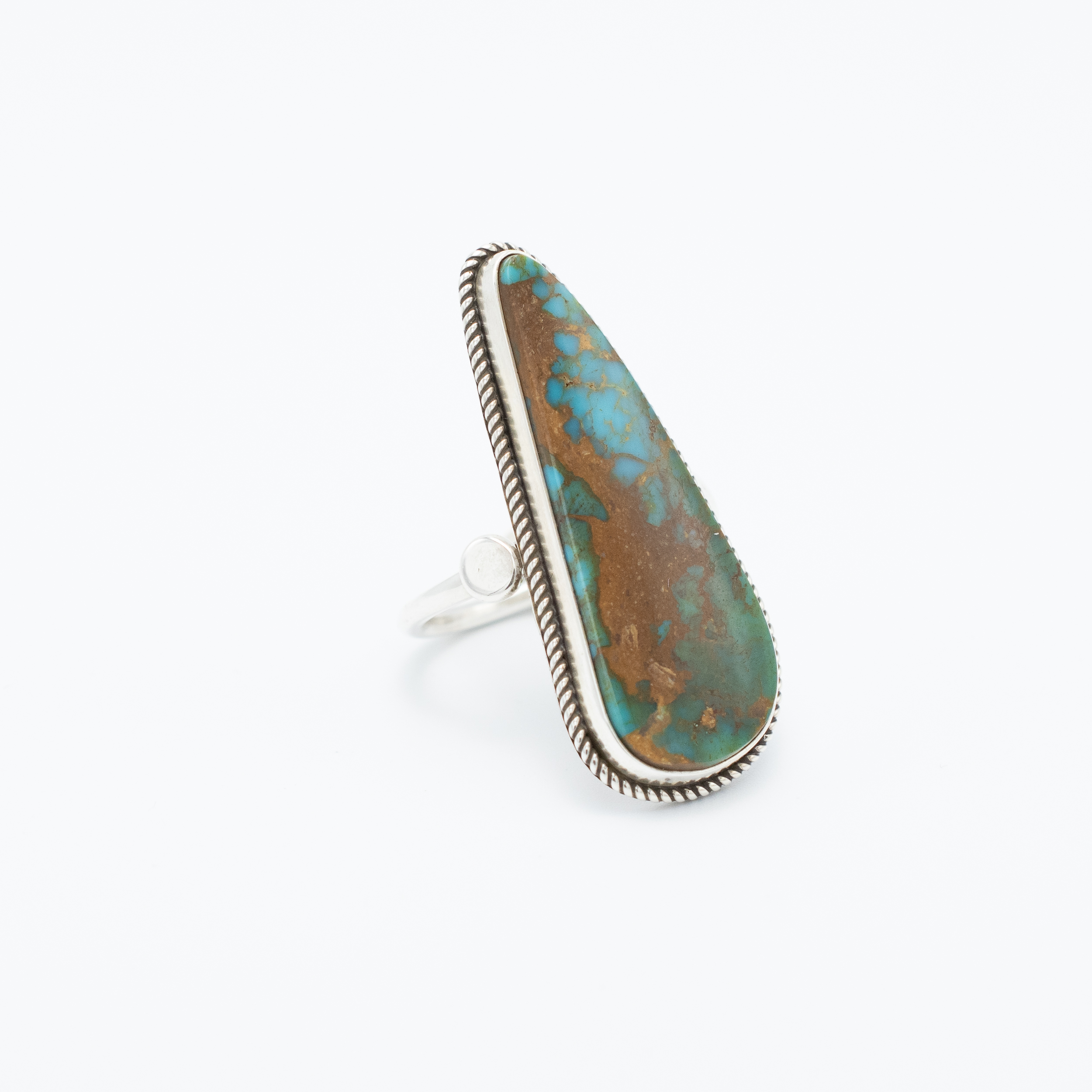 This striking natural Pilot Mountain Turquoise ring, crafted by Navajo artist Bryant Martinez, showcases a beautifully elongated teardrop-shaped stone. The rich blue and brown hues of the turquoise are secured to a smooth simple sterling silver bezel that allows the matrix to take center stage. The thin round silver band ensures comfort, while the delicate rope trim harken to traditional Navajo craftsmanship. This ring is a bold statement piece, perfect for adding a touch of intrigue to any collection.