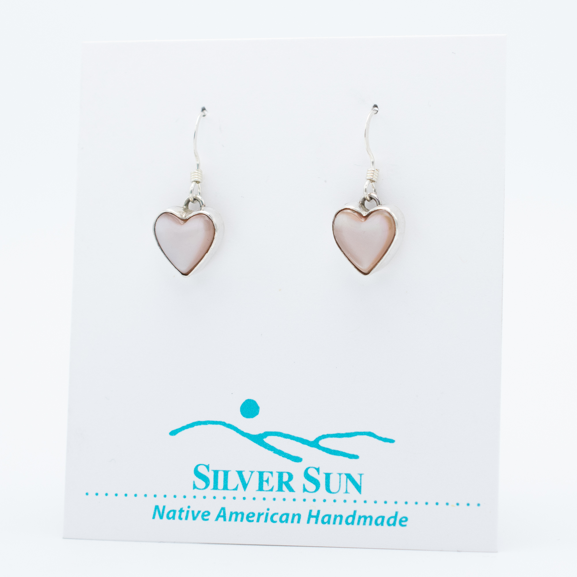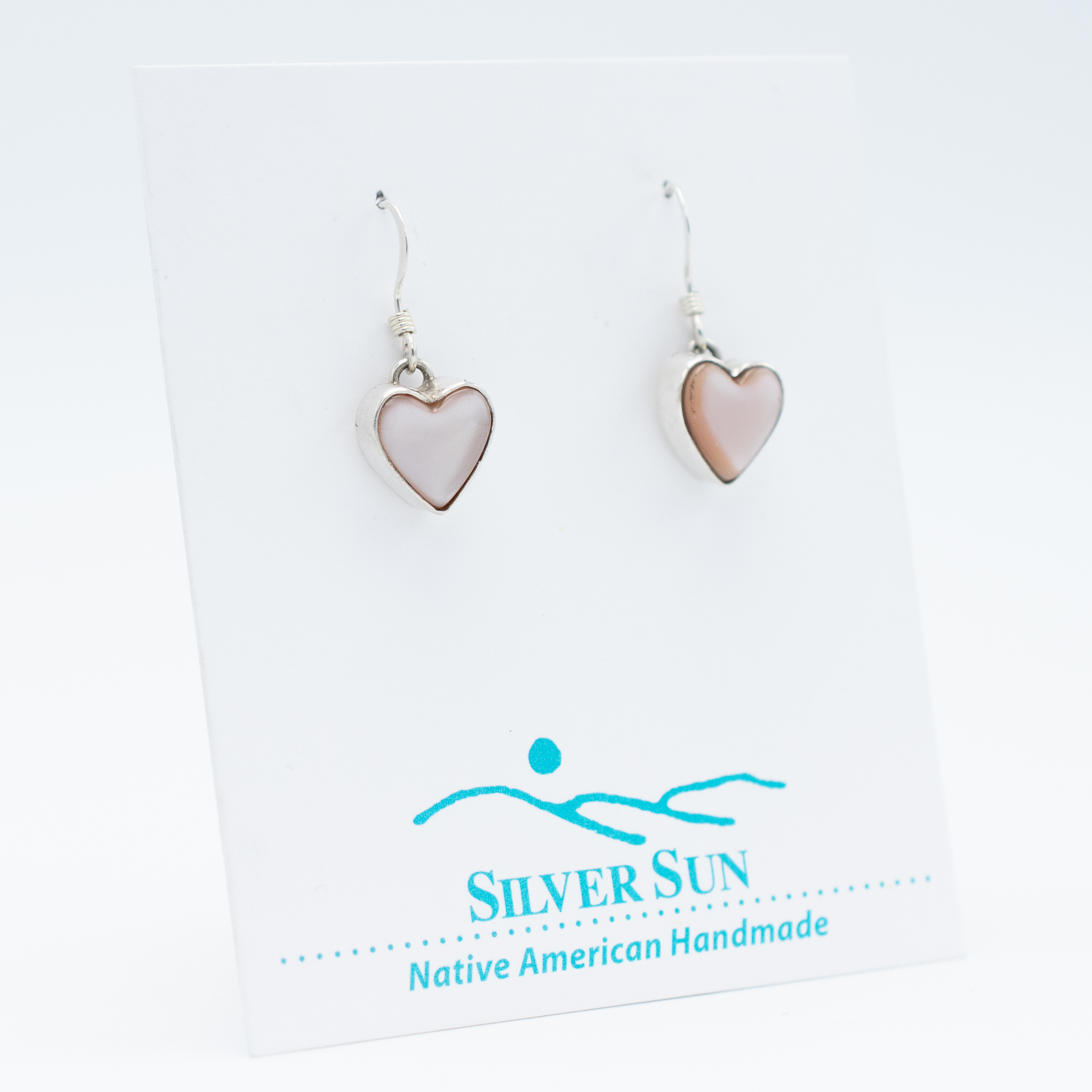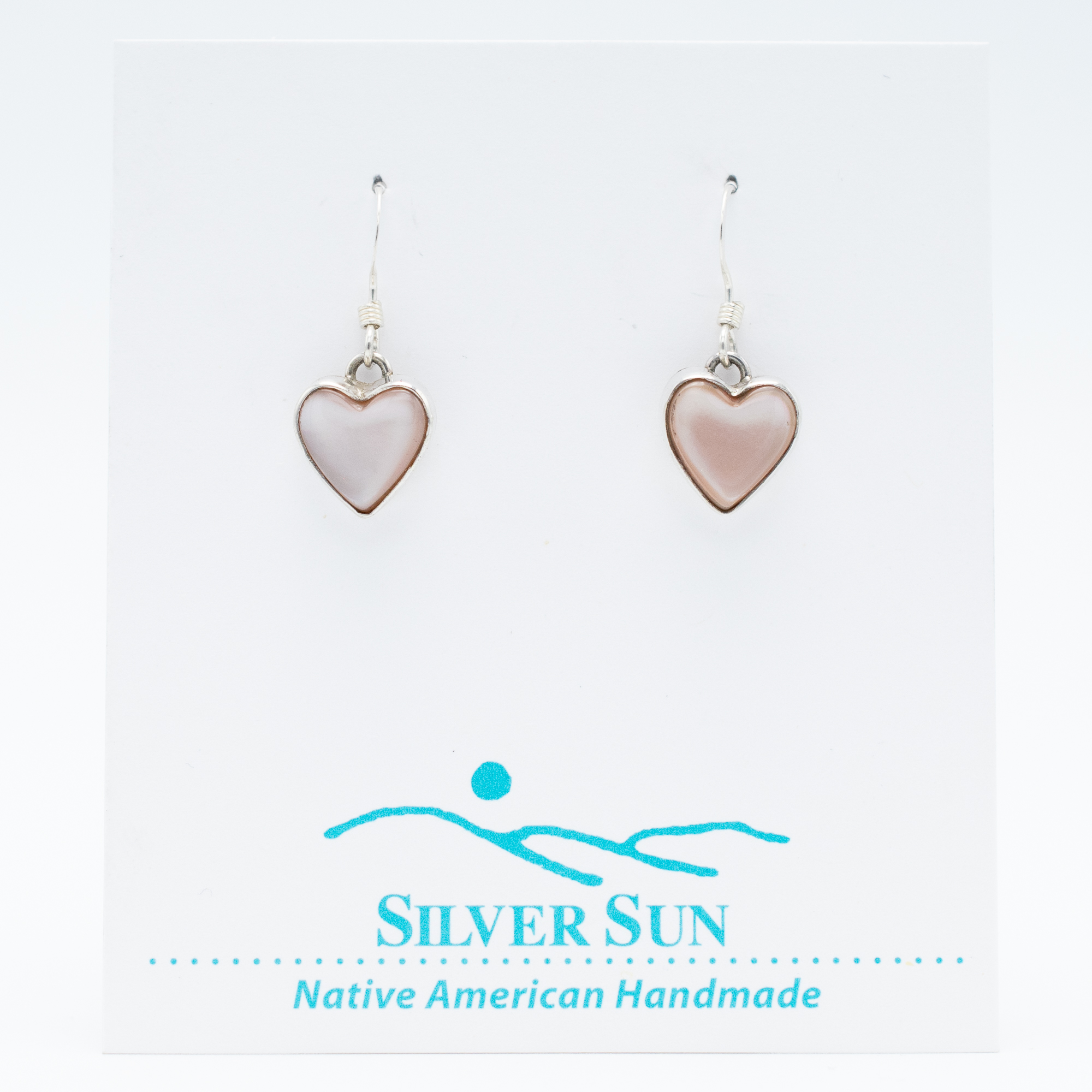 These charming heart-shaped earrings by Navajo artist Bryant Martinez feature soft pink mussel shell, delicately set in sterling silver. Lightweight and full of personality, they’re a sweet, simple accessory that adds a gentle pop of color to any outfit. Handcrafted with care, they bring a touch of warmth and love to your jewelry collection.
