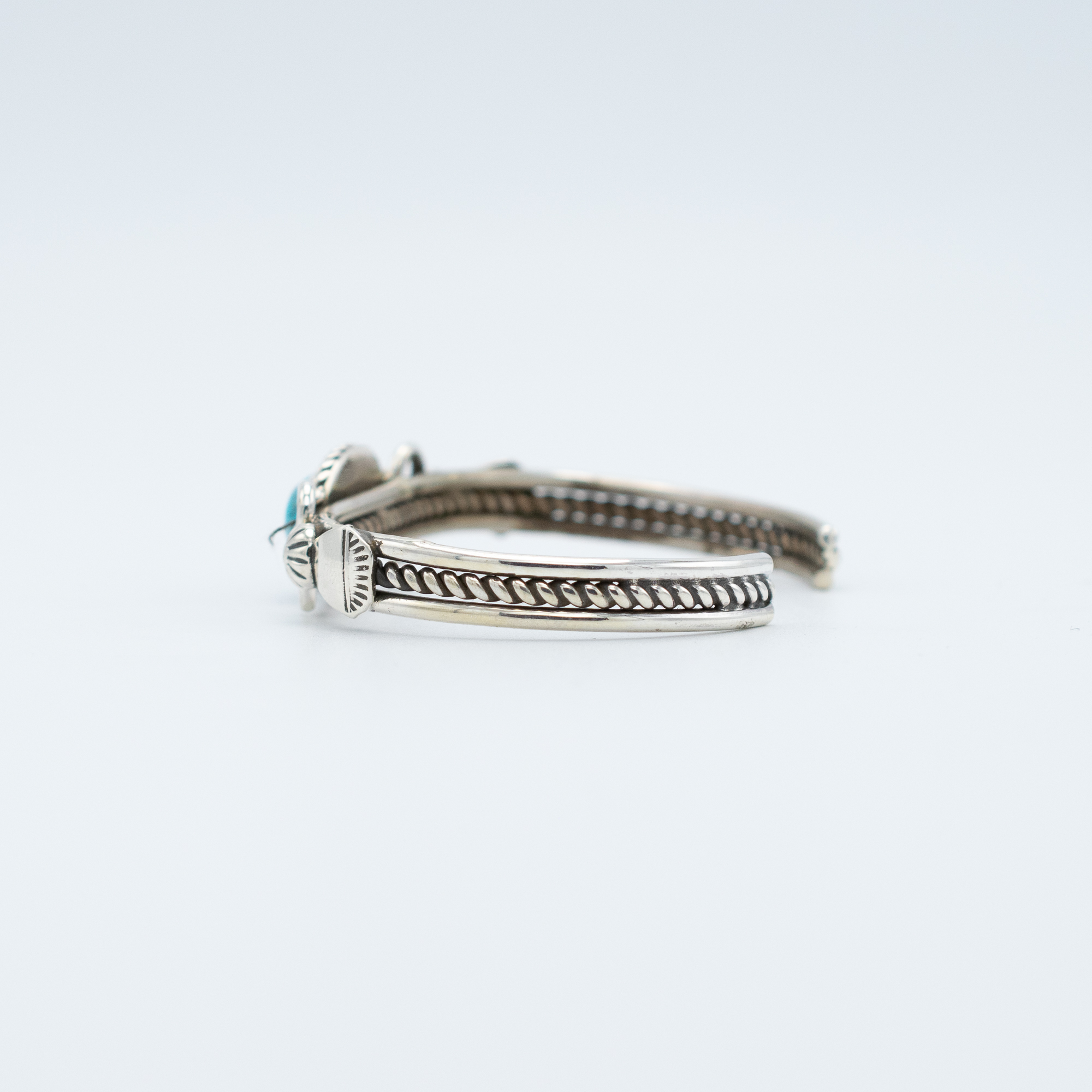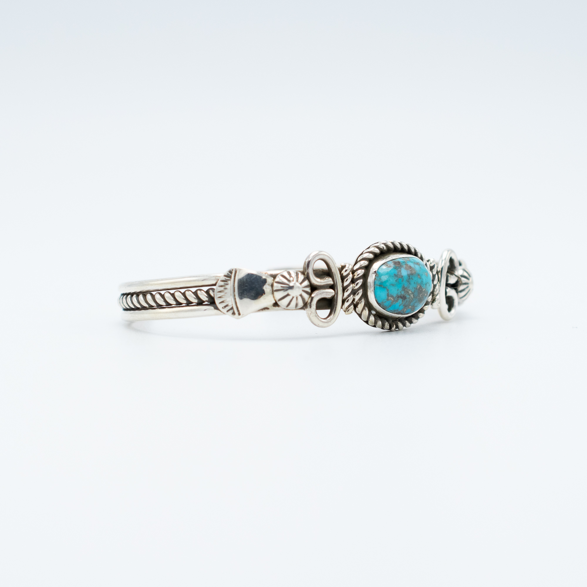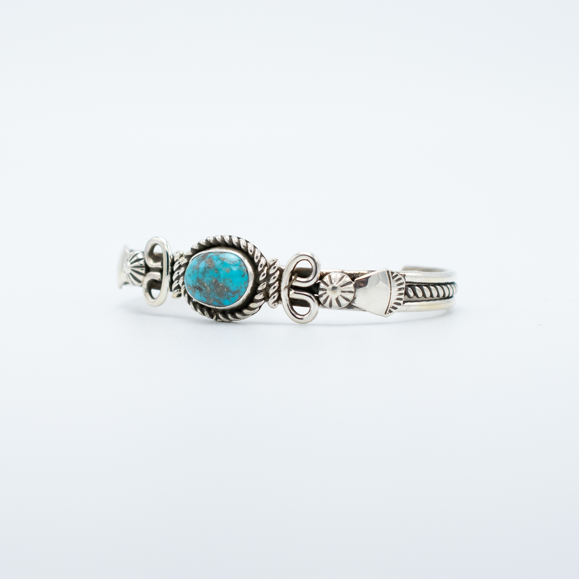 This Natural Red Mountain Turquoise Bracelet by Navajo artist Ruth Ann Begay showcases a striking sky-blue stone with warm brown matrix, framed in a classic rope bezel. Traditional stamp work and flowing silver scrolls complete the design, creating a piece that blends heritage craftsmanship with timeless elegance.