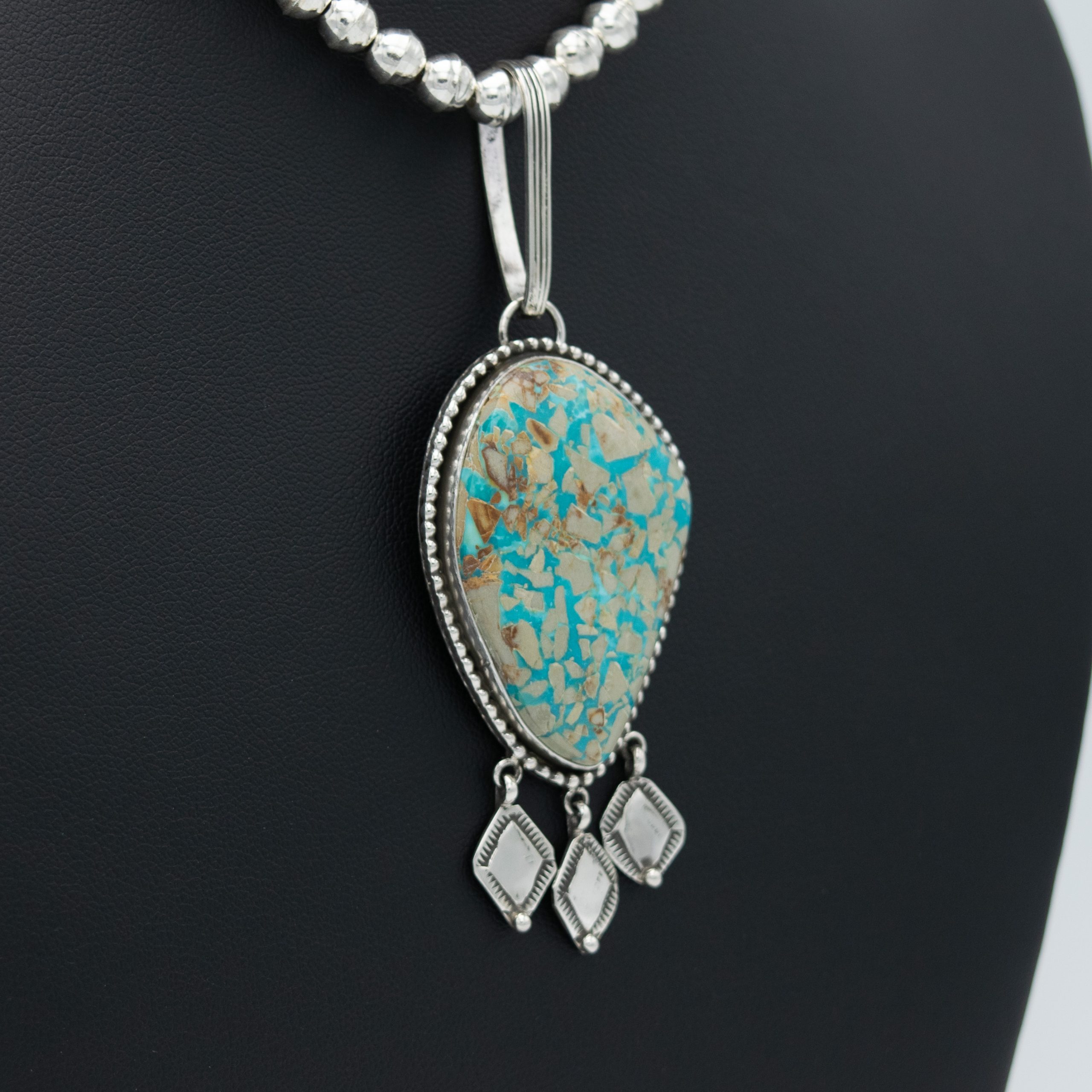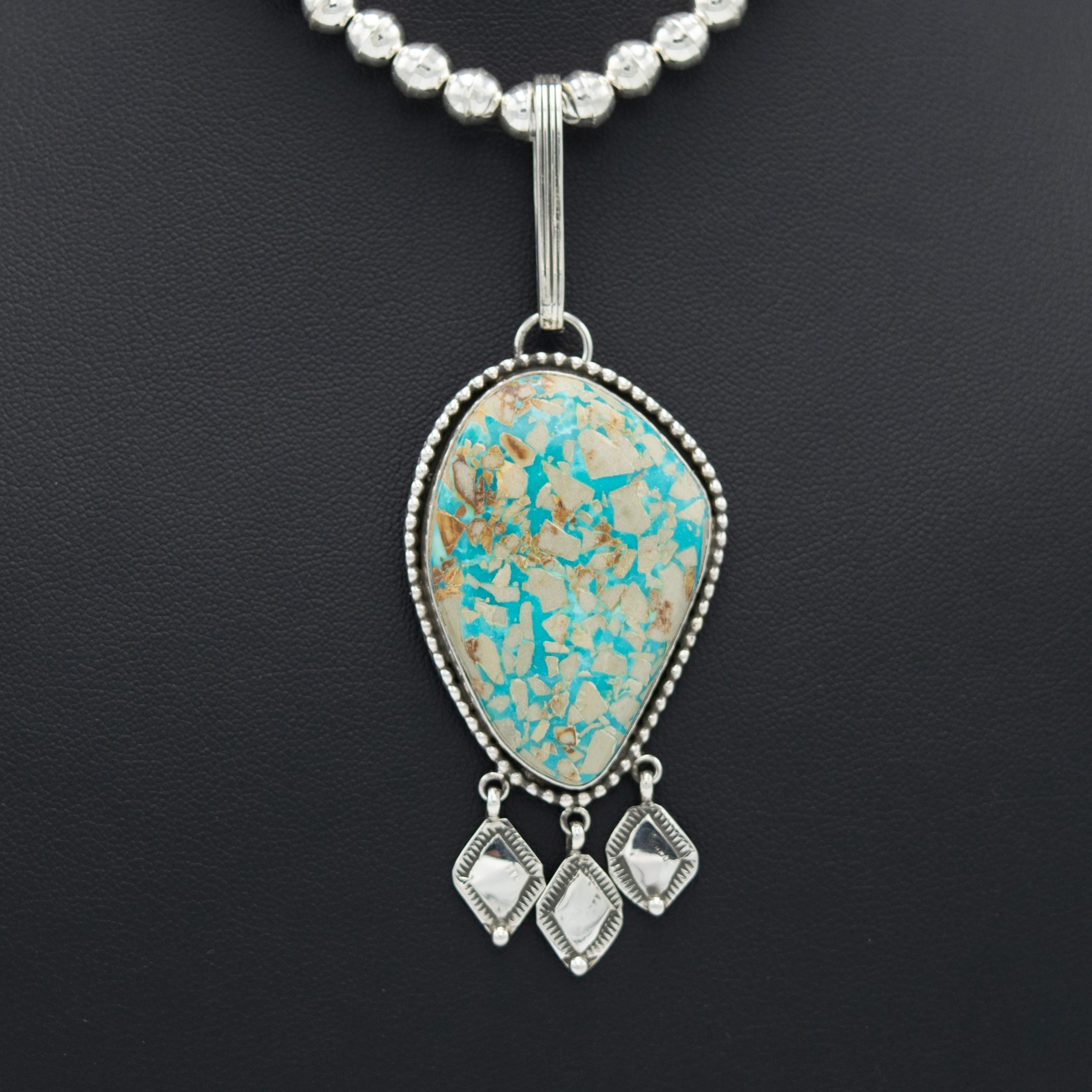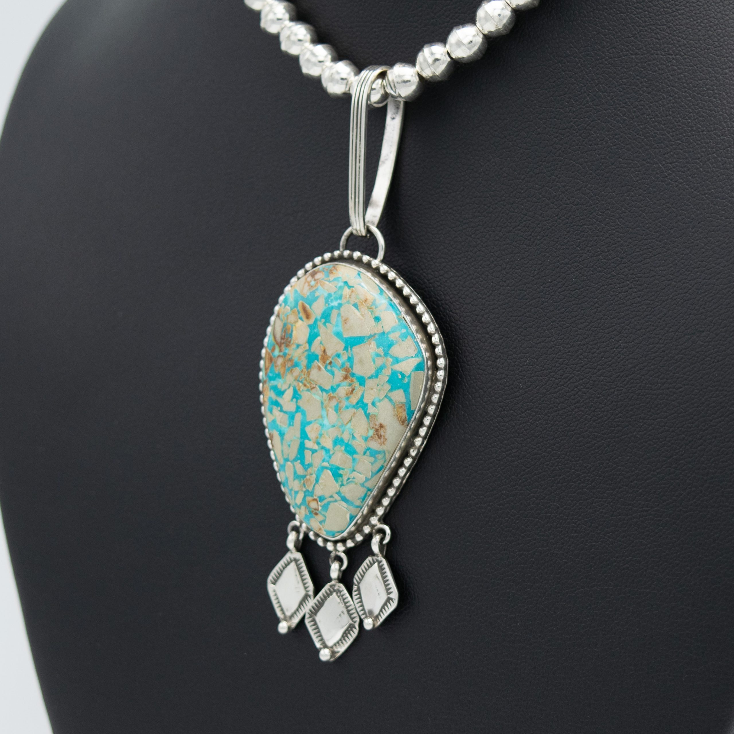 This unusual piece of Natural Royston Turquoise sits above three sterling silver dangles that hang from the bottom of the pendant, mimicking the shapes left behind from the mother stone. The long bale adds another unique touch to this Royston Turquoise Pendant by Ruth Ann Begay, Navajo.