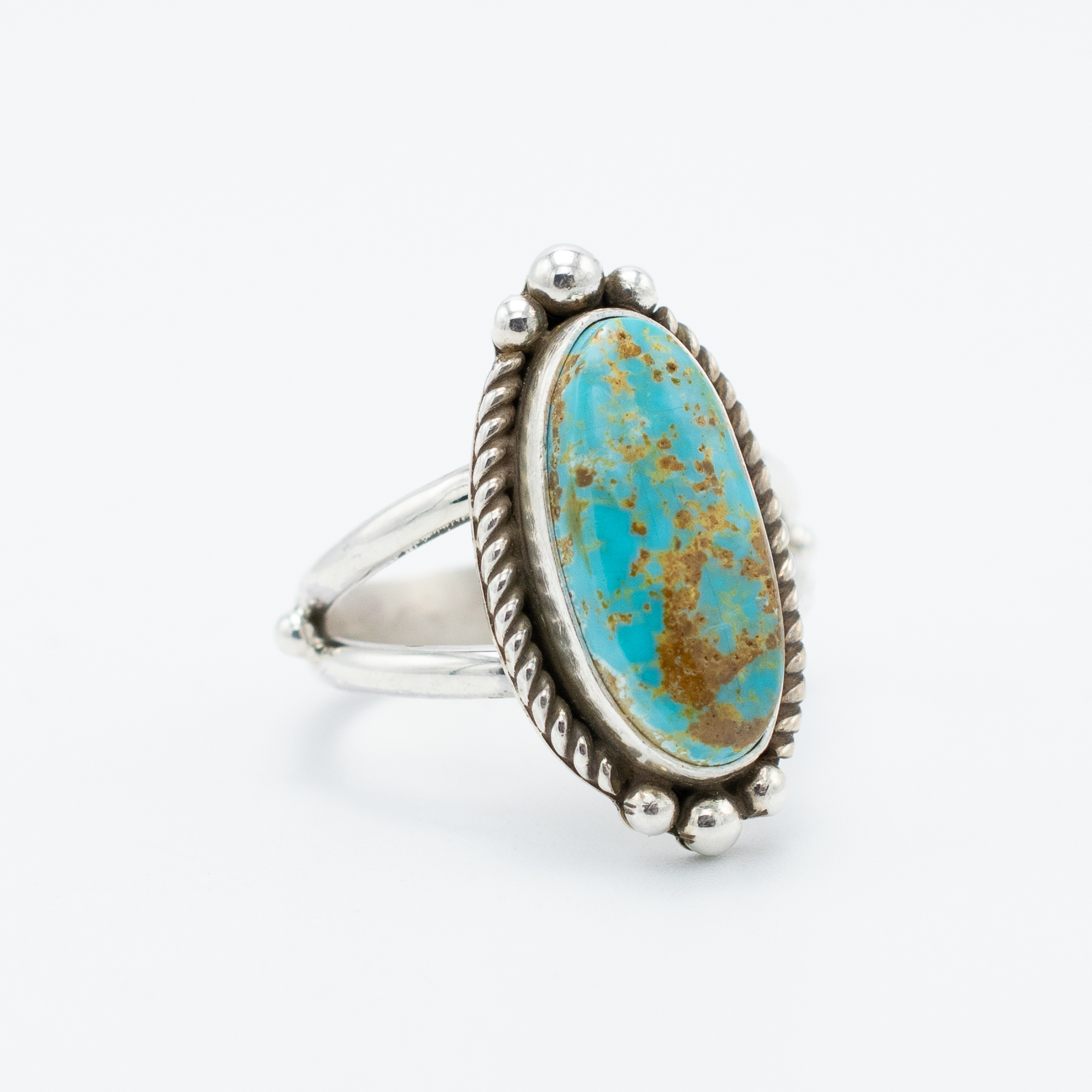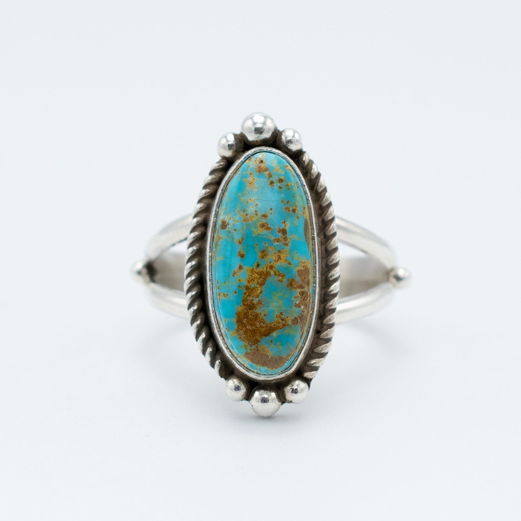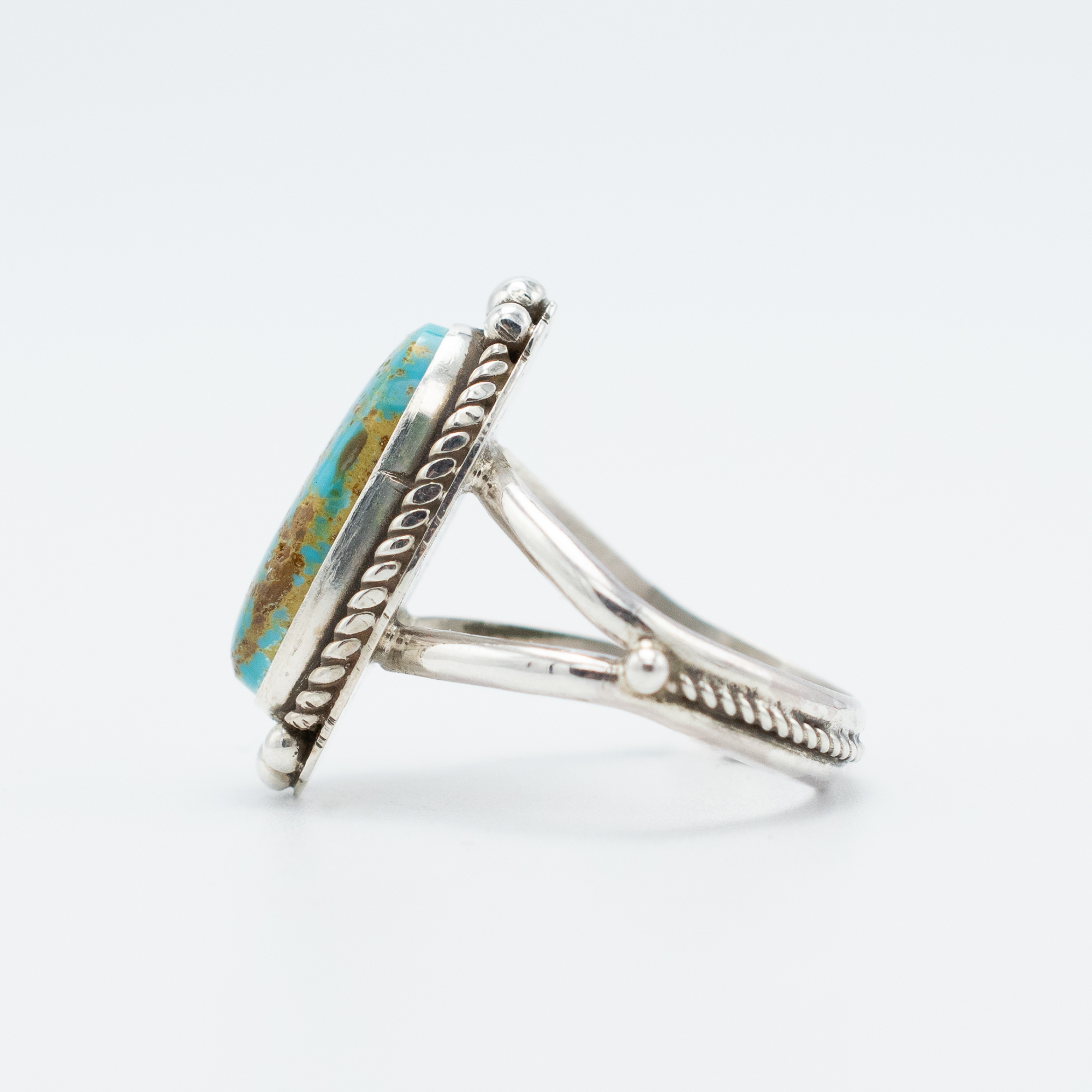 This Natural Royston Turquoise Ring by Navajo artist Ruth Ann Begay brings together warm earth tones and cool blue hues in a beautifully balanced stone. Set in sterling silver, the elongated oval turquoise cabochon features rich golden matrix patterns that highlight its one-of-a-kind character. Ruth Ann frames the stone with a twisted wire border and silver bead accents, adding subtle texture to the classic design. Handcrafted with care, this ring offers timeless Southwestern elegance perfect for everyday wear or special occasions.