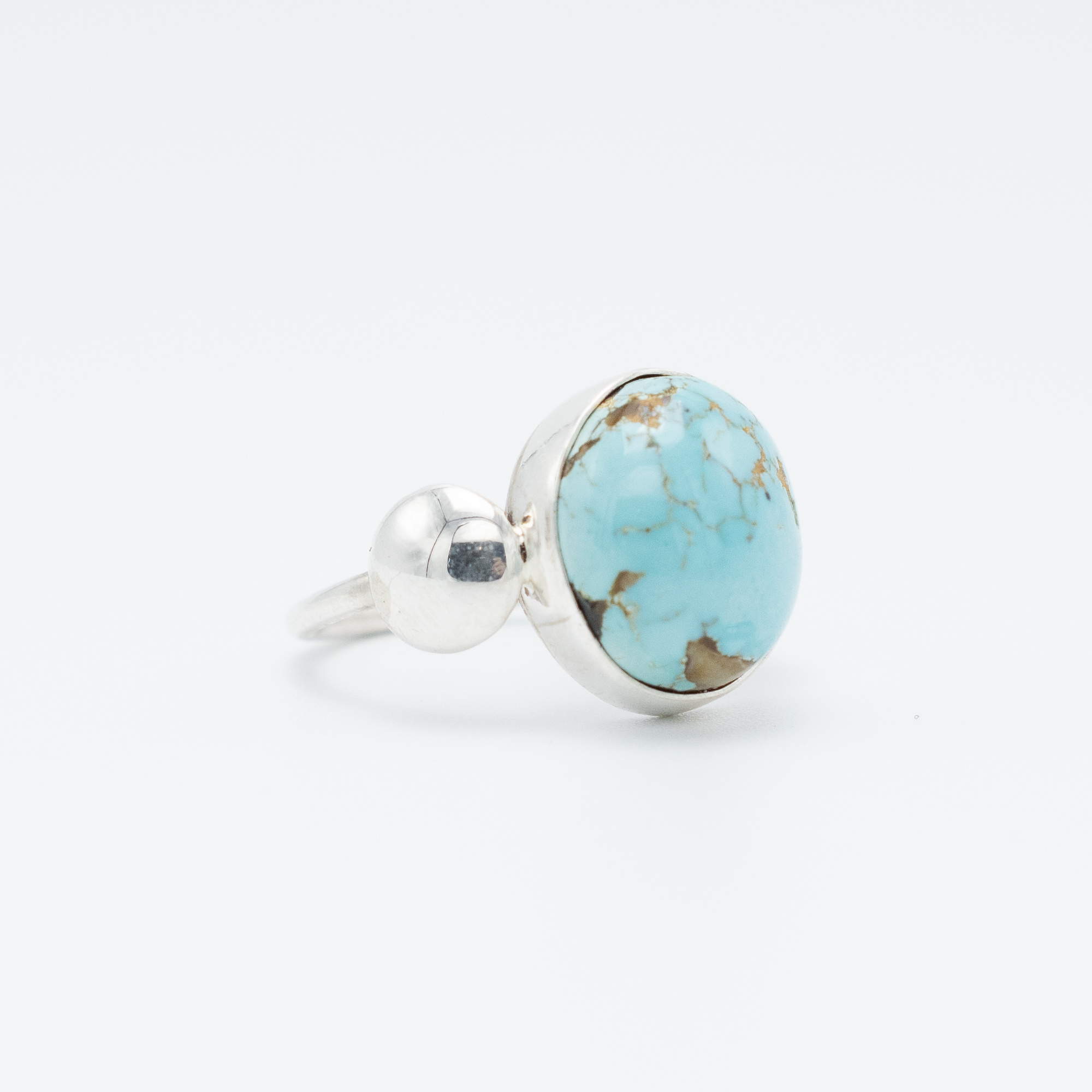 This elegant Royston Turquoise Ring by Navajo artist Ruth Ann Begay beautifully showcases the natural beauty of turquoise. The soft blue stone with intricate veining brings an earthy charm, enhanced by the polished sterling silver band. Its simplicity makes it versatile, while the substantial stone offers a statement feel. Perfect for any occasion, this ring celebrates traditional Navajo craftsmanship with a modern touch.