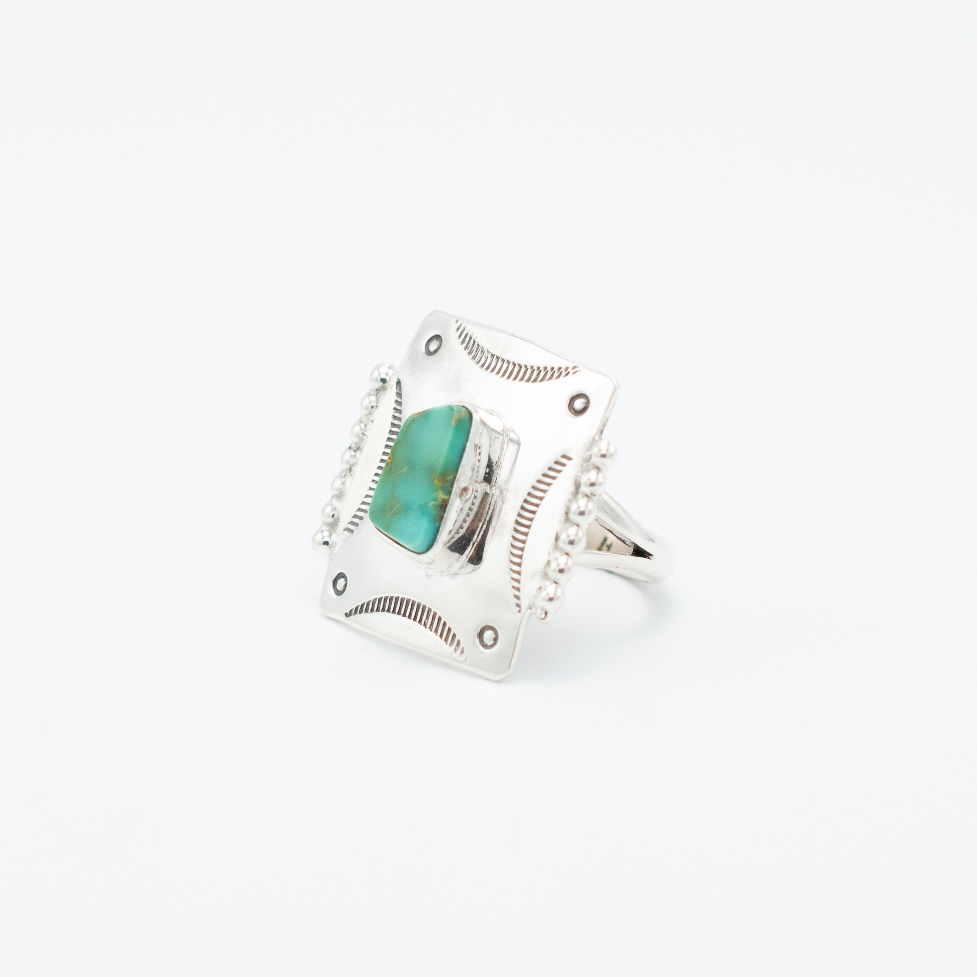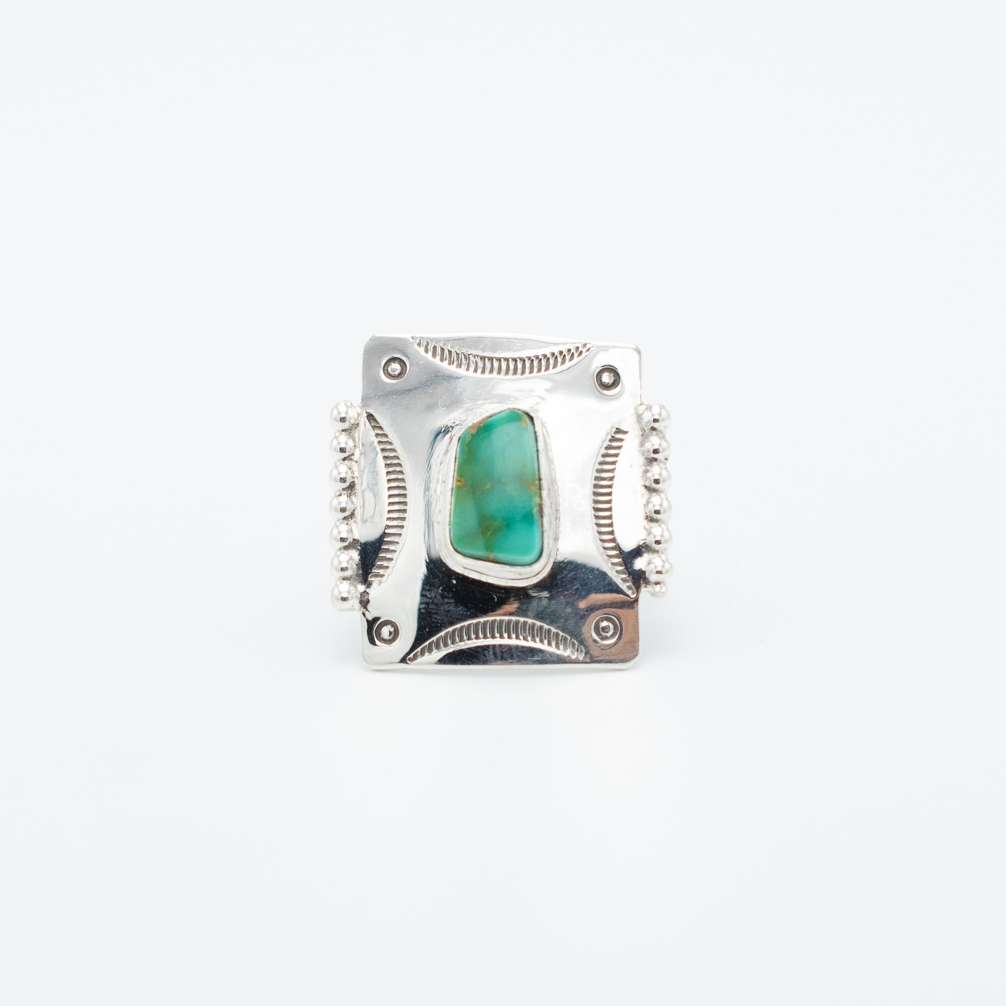 This Natural Royston Turquoise Ring by Navajo artist Ruth Ann Begay features a bold geometric setting and a vibrant green and gold-hued turquoise stone. The sterling silver shield design is adorned with stamped detailing and silver beadwork, giving this statement piece both strength and elegance.