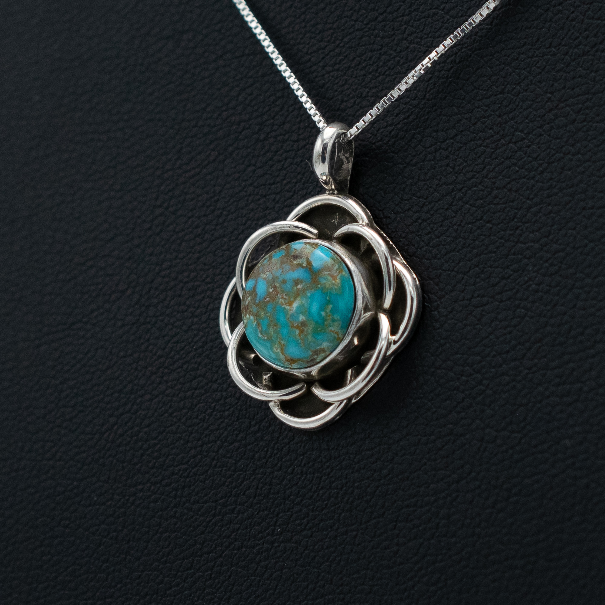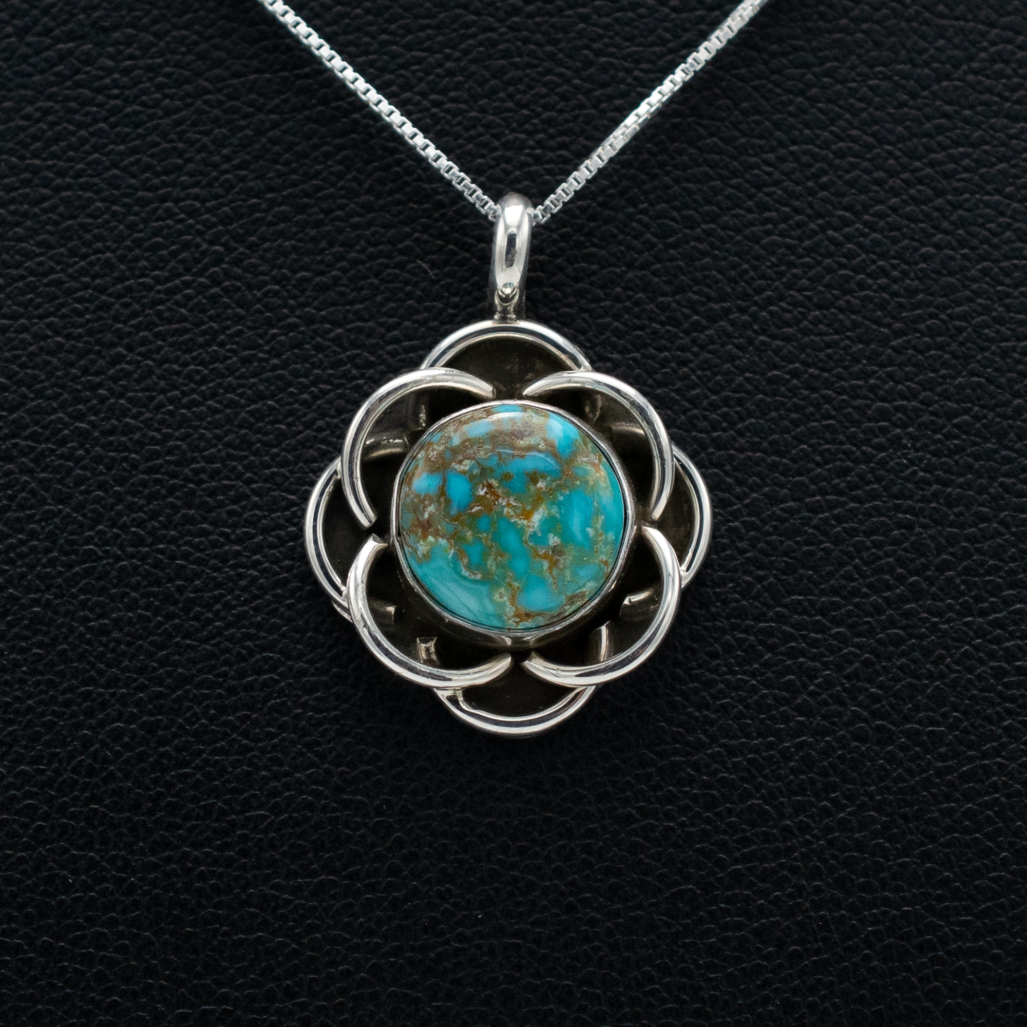 This Sierra Bella Turquoise Pendant by Navajo artist Ruth Ann Begay features a unique floral setting that frames a striking round turquoise stone. The stone’s rich blend of teal and golden brown matrix is beautifully complemented by polished sterling silver petals, creating a graceful and organic look. A distinctive design that brings natural elegance to any collection.