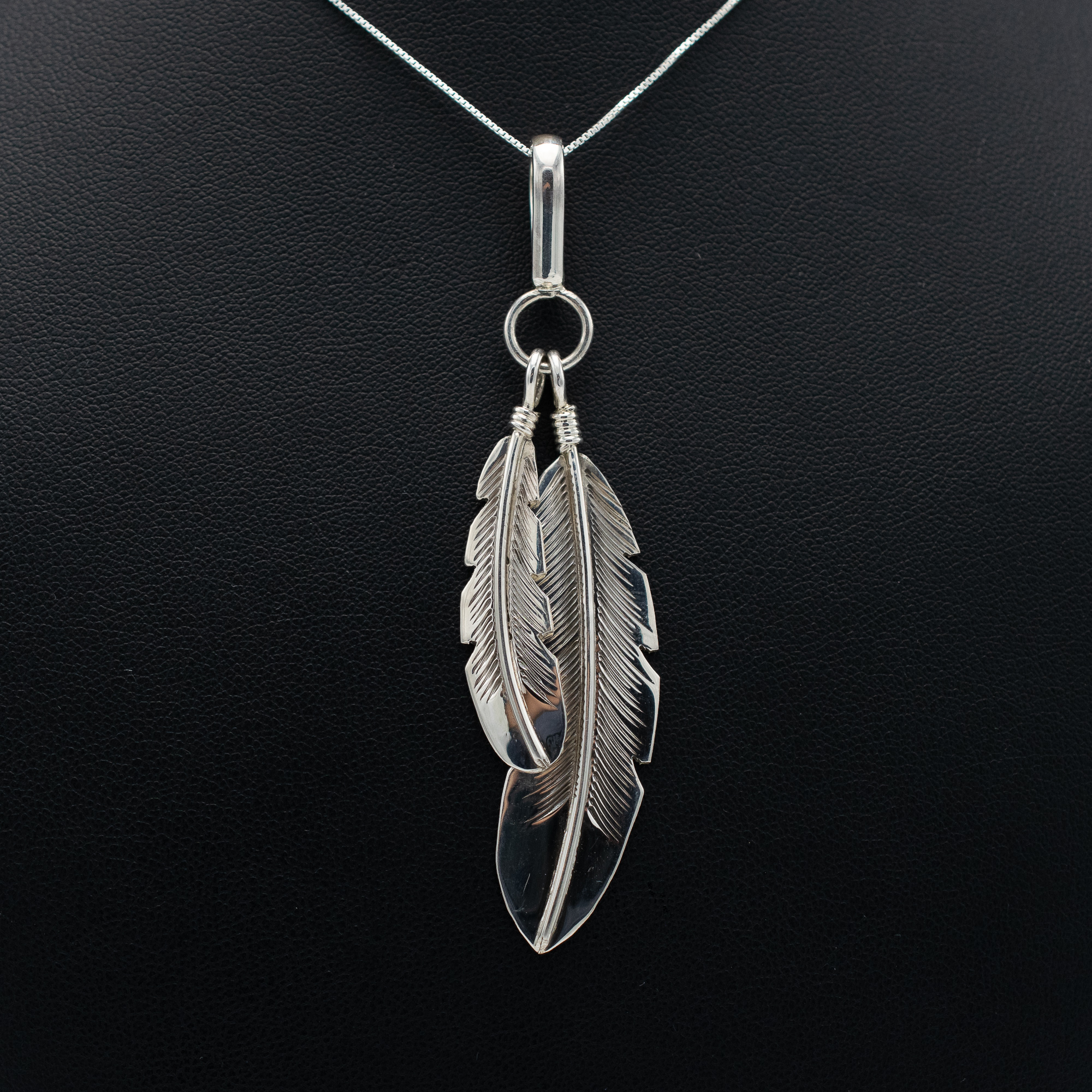 This sterling silver pendant by Navajo artist Joe Mace features two exquisitely detailed feathers, each hand-cut and engraved to capture their natural texture. Symbolizing strength, freedom, and spiritual connection, the dual-feather design moves freely from a single ring, making it a meaningful and stylish accessory. A timeless piece rooted in Native tradition.