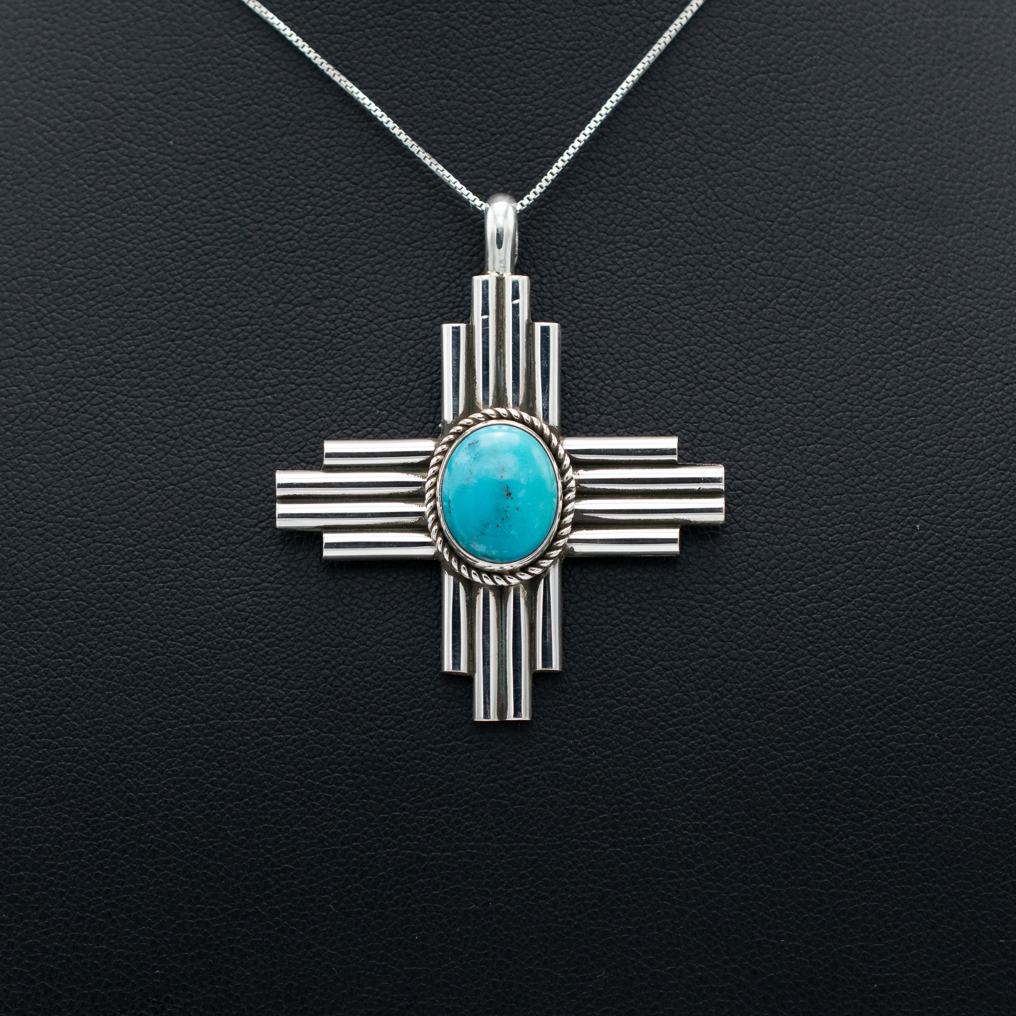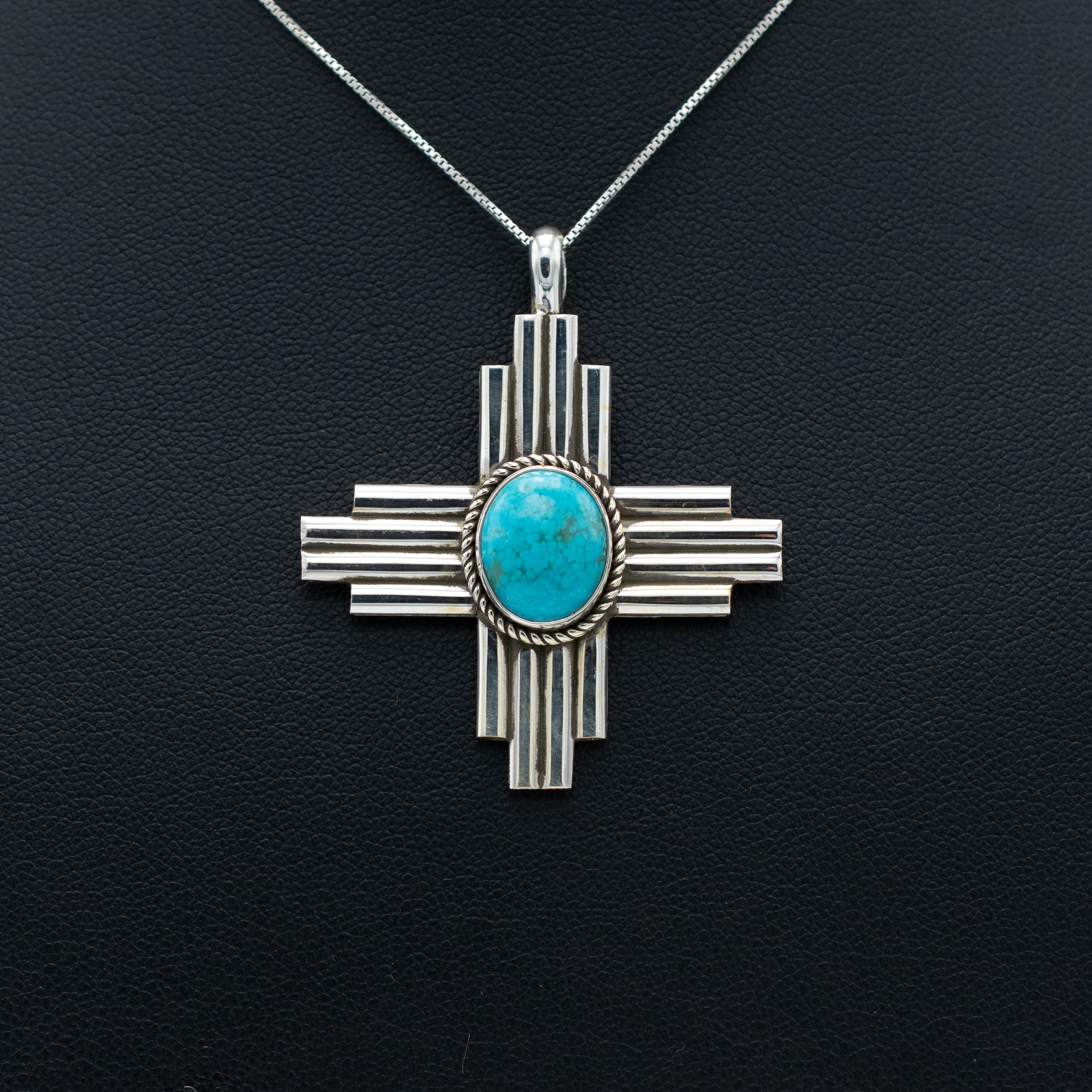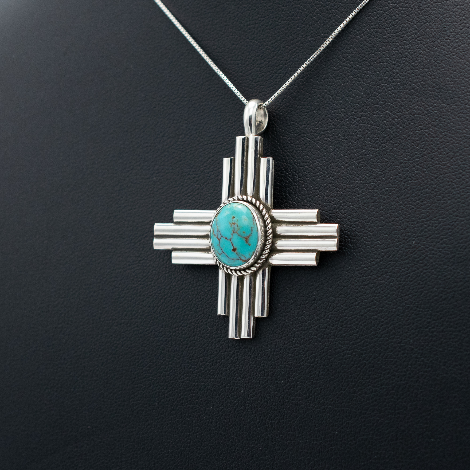 Introducing our Kingman Turquoise Zia Pendant by Bryant Martinez, Navajo. This striking pendant features the iconic Zia symbol, representing the sun and the four directions, beautifully accented with a vibrant Kingman turquoise stone. The stone’s deep blue hue contrasts elegantly with the sterling silver, creating a piece that is both symbolic and timeless. A rope-style bezel surrounds the turquoise, adding a touch of traditional Navajo craftsmanship. Perfect for anyone who wants to wear a meaningful statement piece, this pendant is a stunning tribute to the rich cultural heritage of the Southwest.