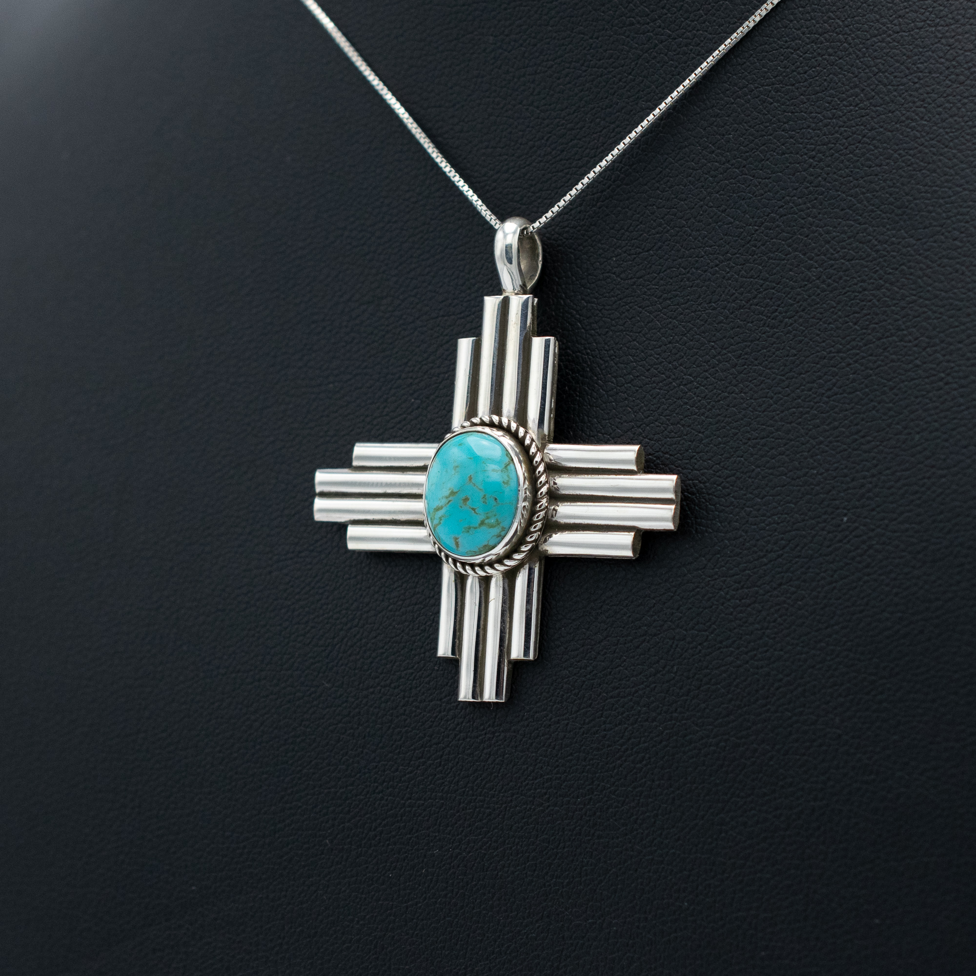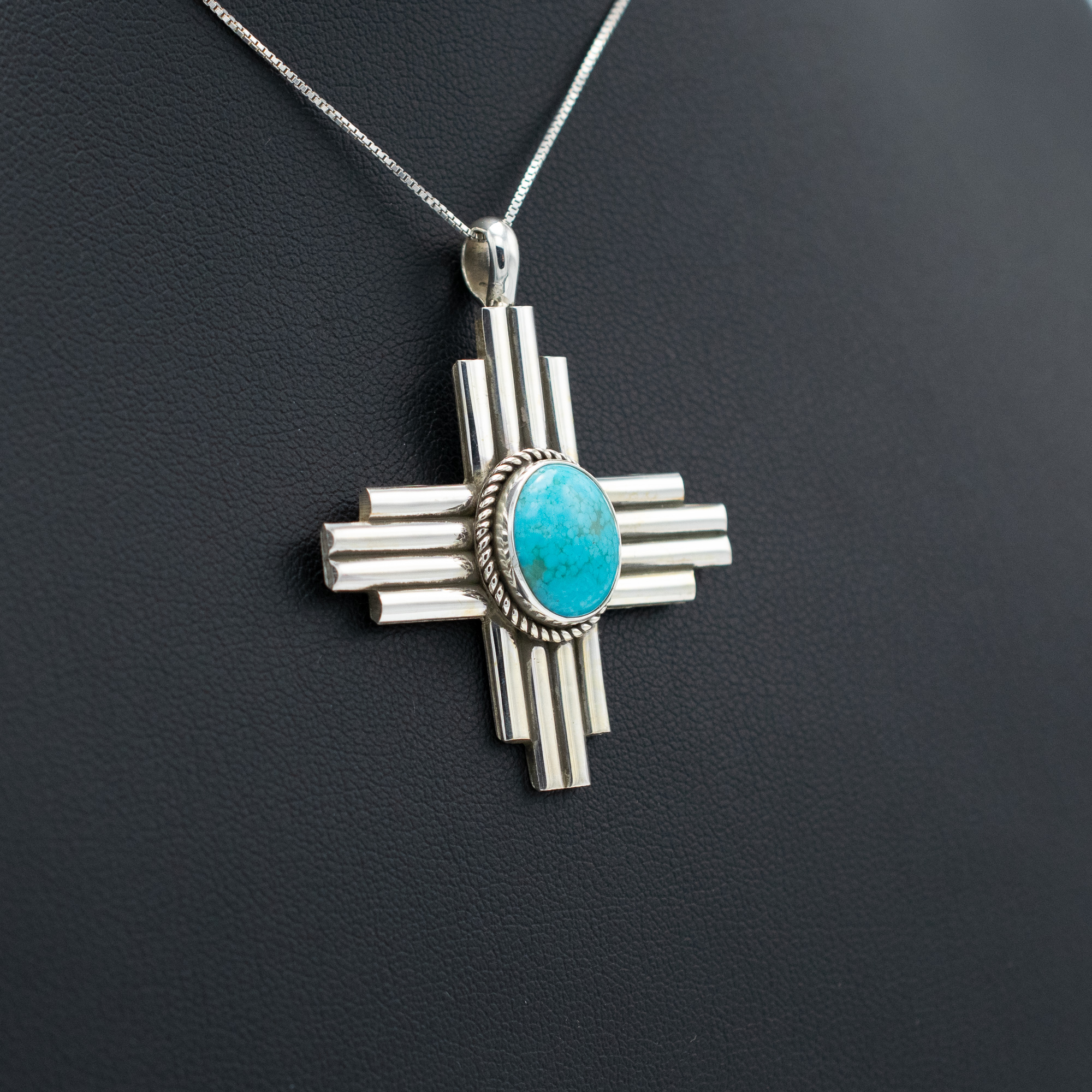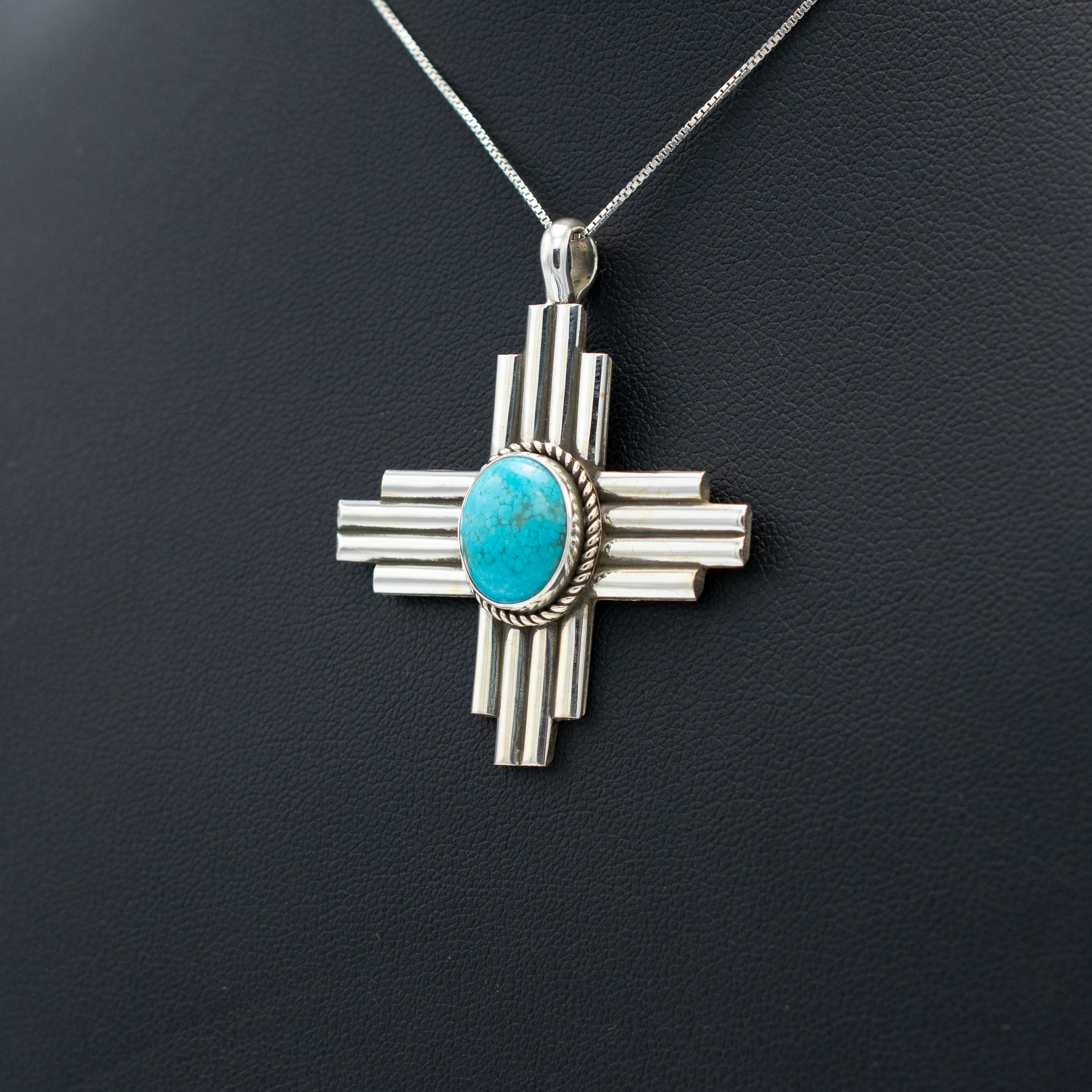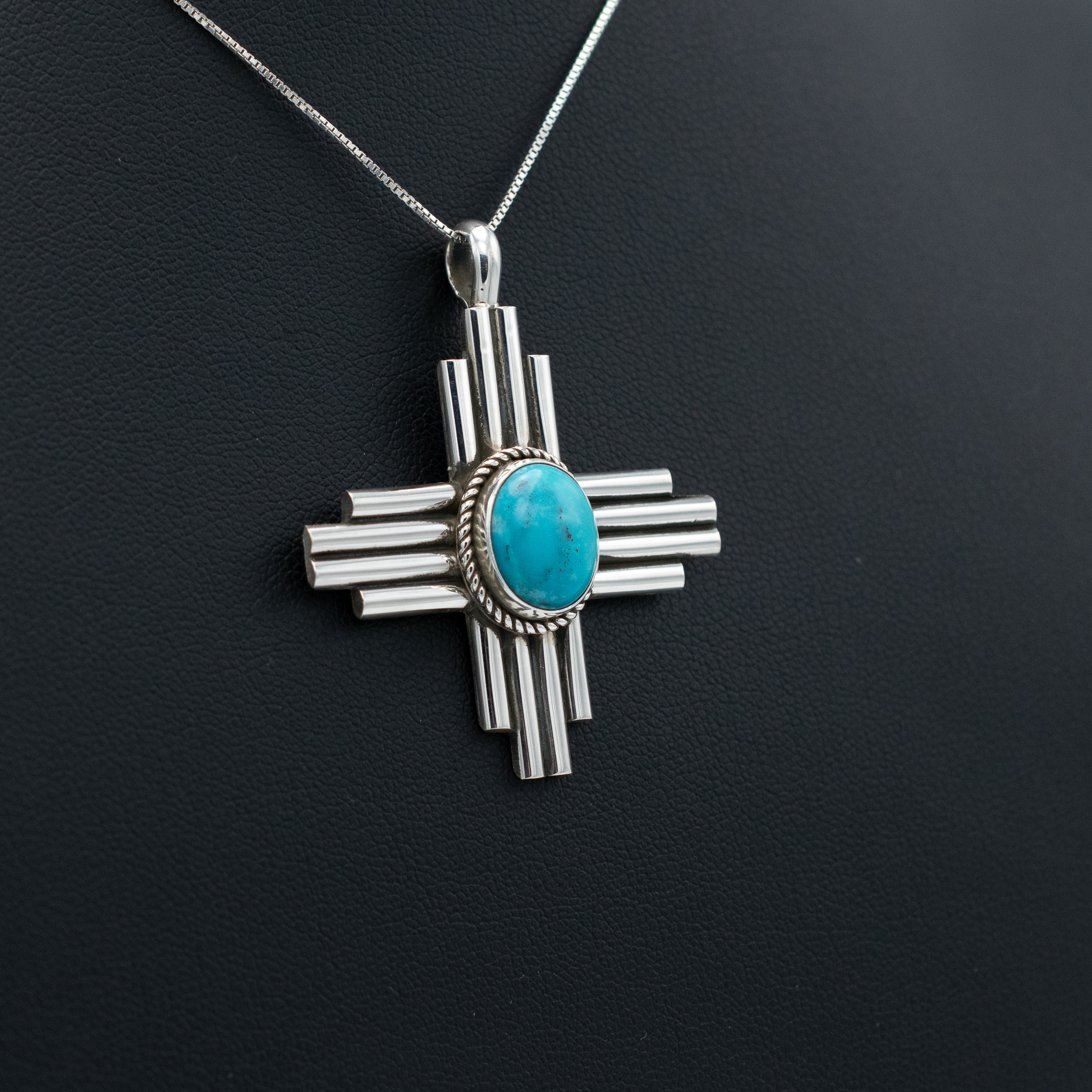 Introducing our Kingman Turquoise Zia Pendant by Bryant Martinez, Navajo. This striking pendant features the iconic Zia symbol, representing the sun and the four directions, beautifully accented with a vibrant Kingman turquoise stone. The stone’s deep blue hue contrasts elegantly with the sterling silver, creating a piece that is both symbolic and timeless. A rope-style bezel surrounds the turquoise, adding a touch of traditional Navajo craftsmanship. Perfect for anyone who wants to wear a meaningful statement piece, this pendant is a stunning tribute to the rich cultural heritage of the Southwest.