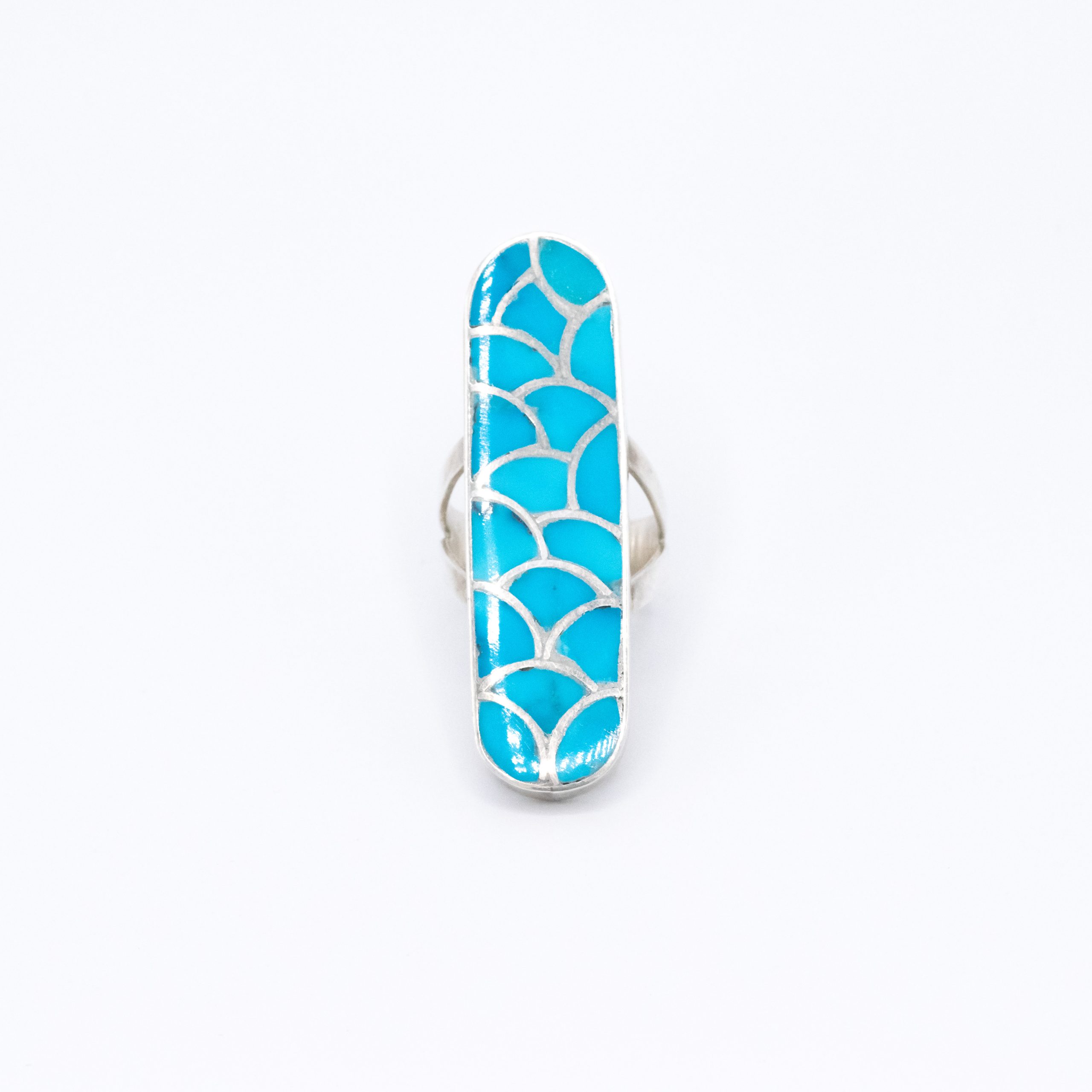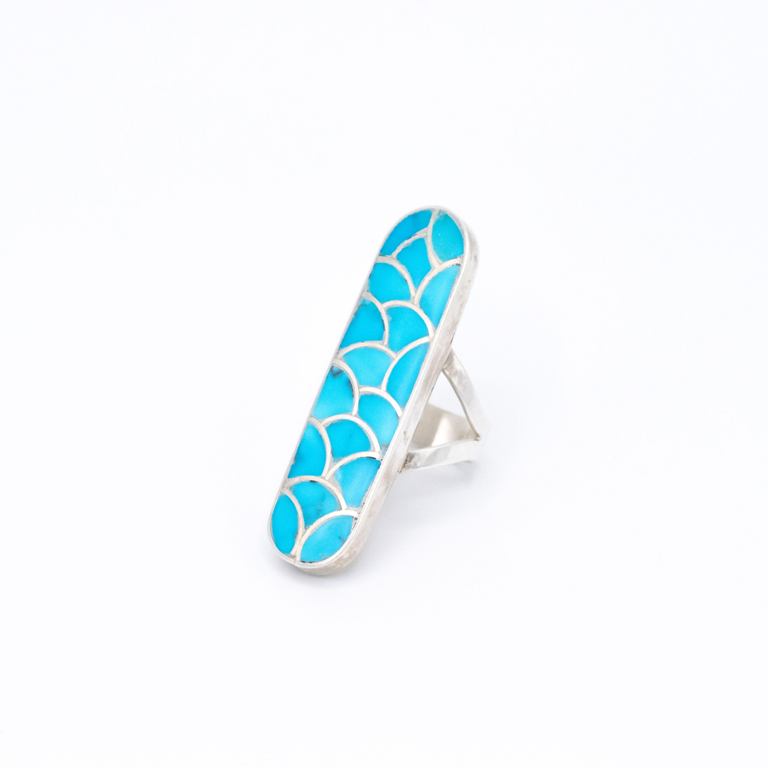 Often described as “fish scale”, the style and pattern of this ring are associated with the Pueblo of Zuni and to artist Carmichael Haloo. Skilled work!