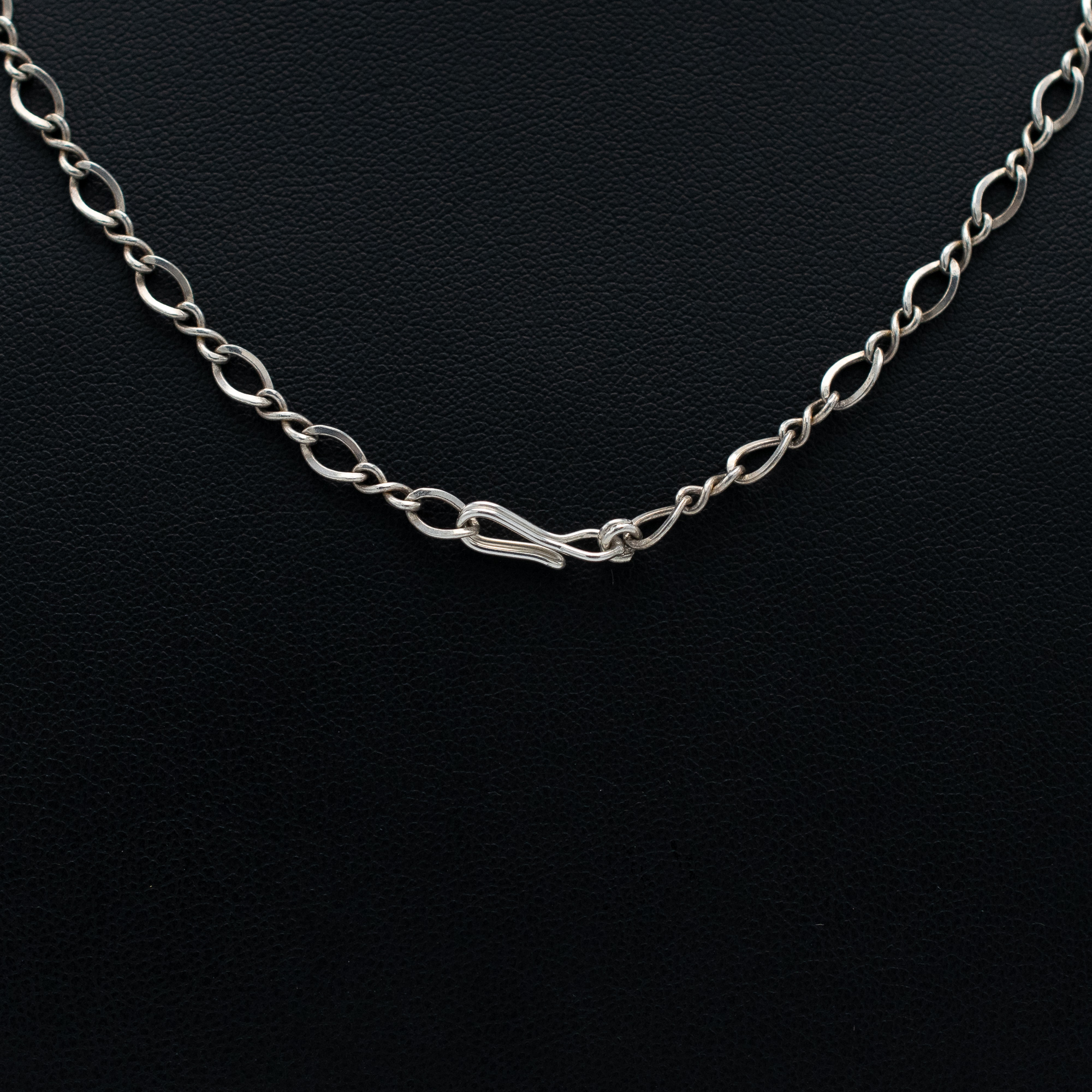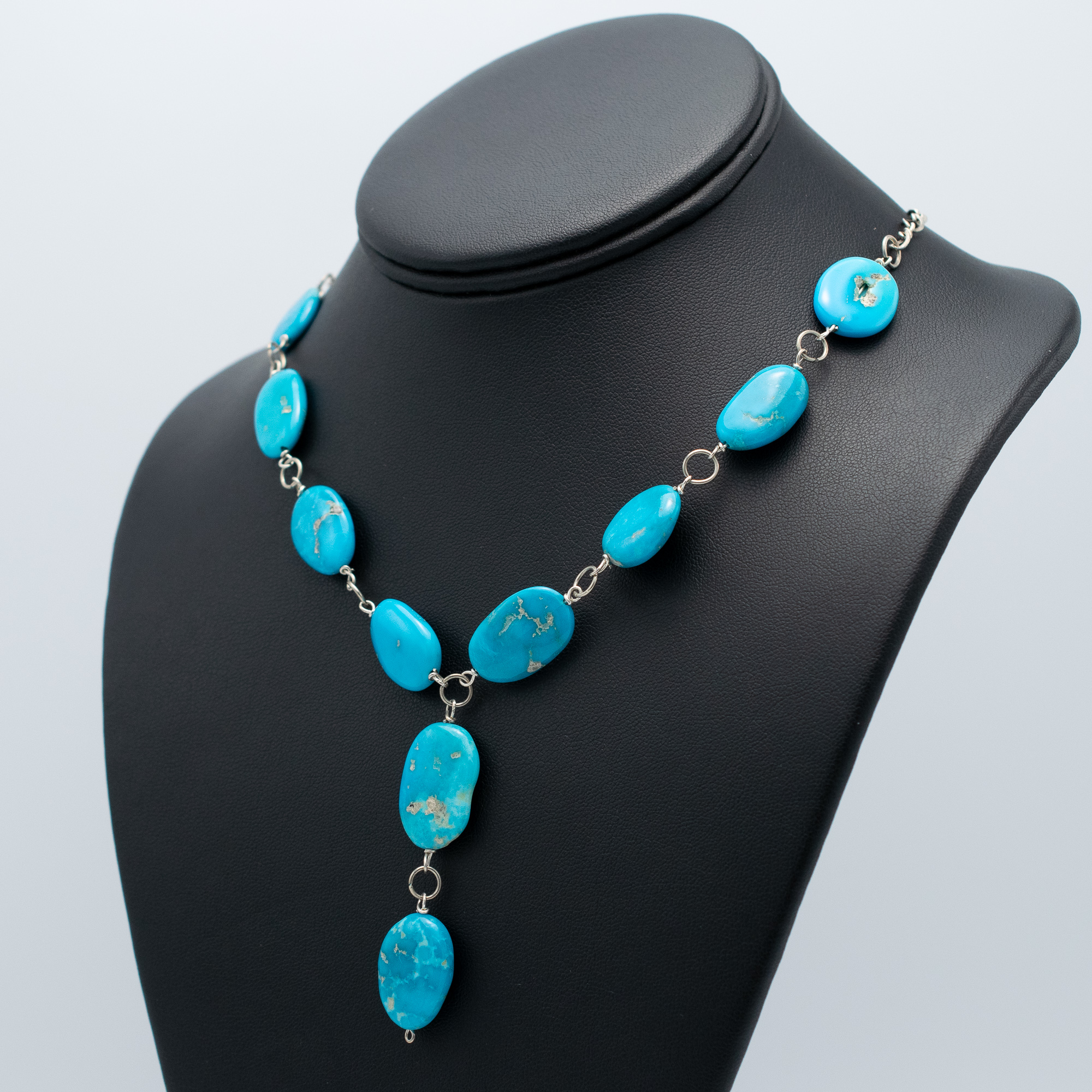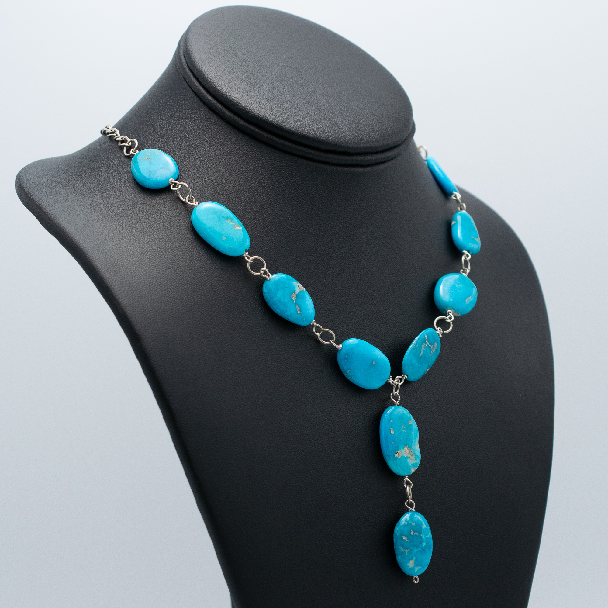 This elegant lariat necklace by Kathleen Sanchez of San Felipe Pueblo features radiant enhanced Sleeping Beauty turquoise stones, linked together in a graceful Y-shaped design. Each turquoise nugget showcases the stone’s signature sky-blue color, with delicate matrix patterns that add depth and character. The lariat style lends a refined, elongated silhouette that flatters the neckline and transitions easily from casual to formal settings. Handcrafted with care and precision, this necklace is a timeless statement of natural beauty and Native artistry.