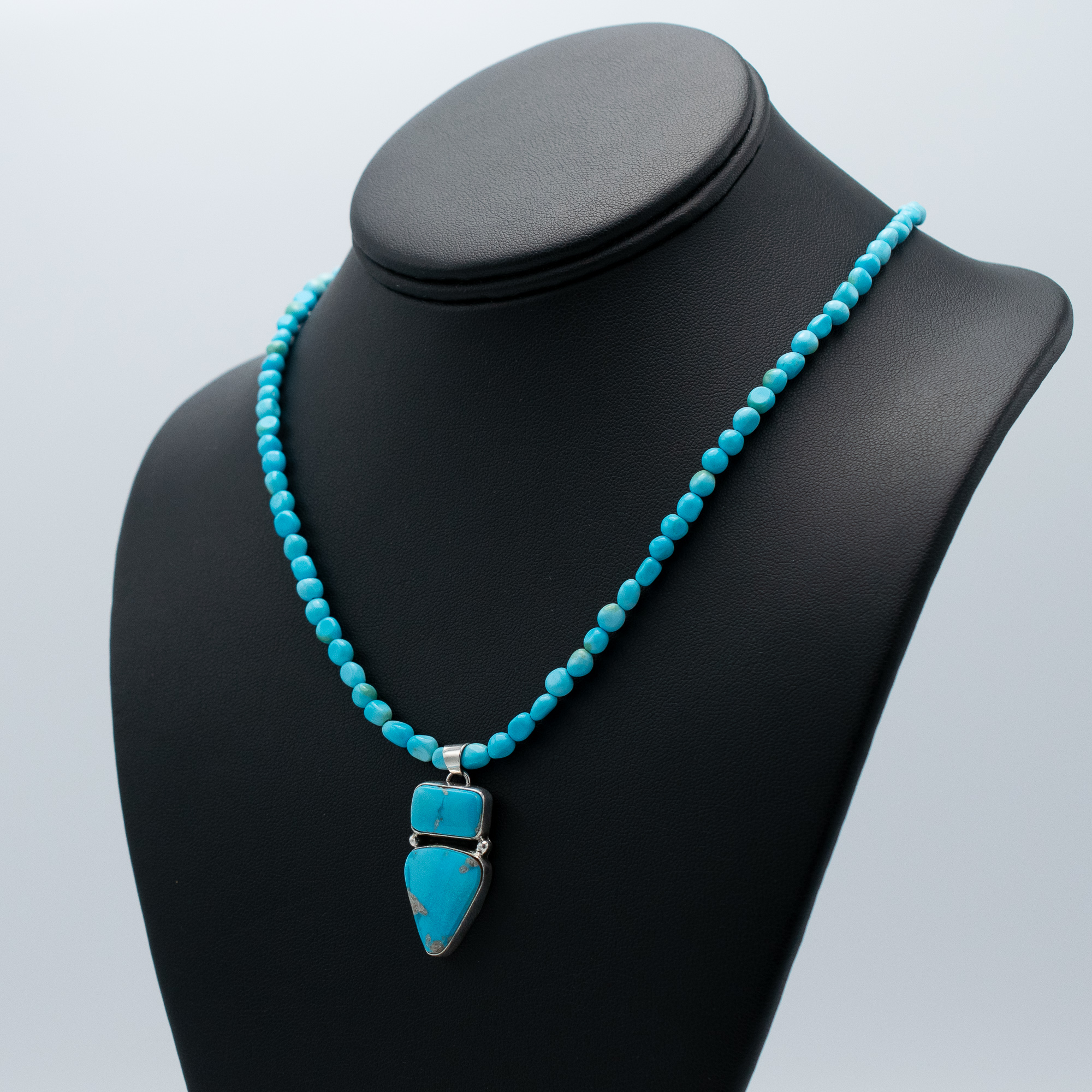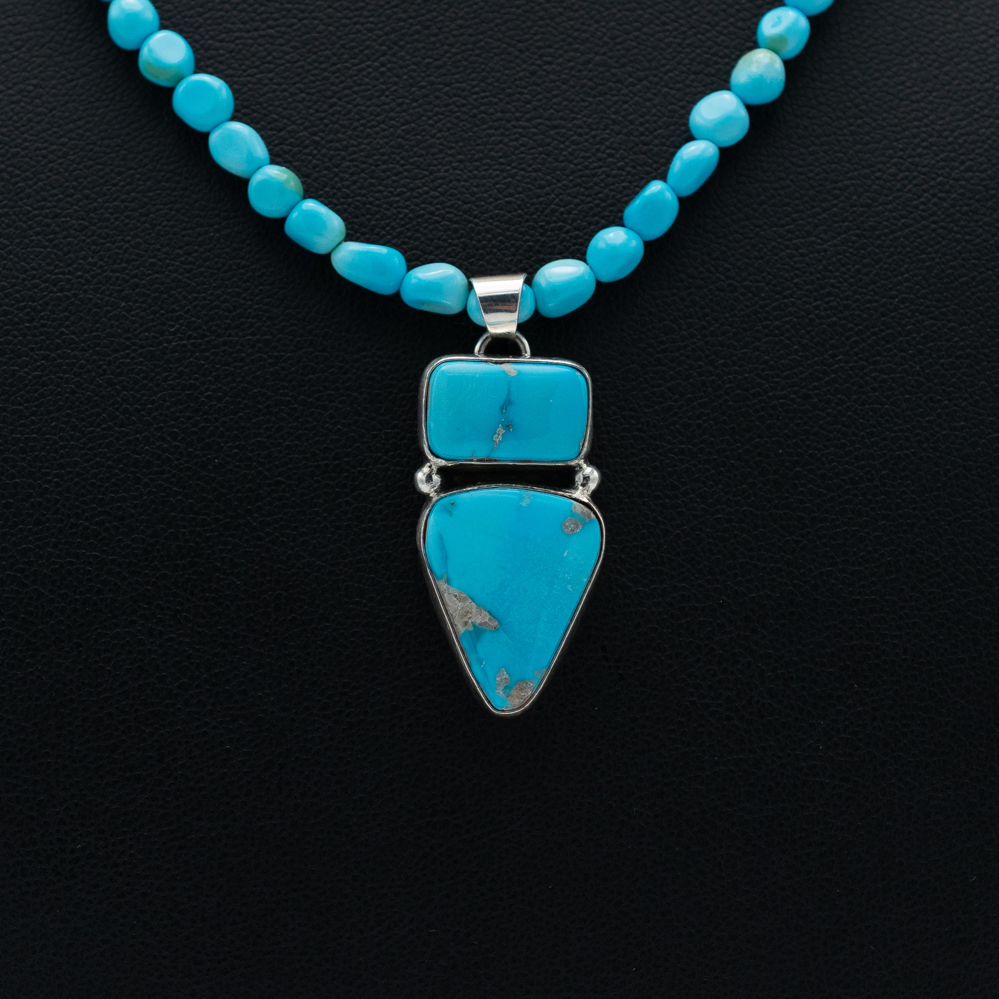 This Natural Sleeping Beauty Turquoise Necklace by Navajo artist Ruth Ann Begay features two vibrant stones in a unique double pendant design. Set in sterling silver, the smooth shapes and bright sky-blue hues of the stones evoke a clean, contemporary look. The pendant is strung on a necklace of Sleeping Beauty turquoise beads, enhancing the elegance of this handcrafted piece. Perfect for collectors and turquoise lovers alike.