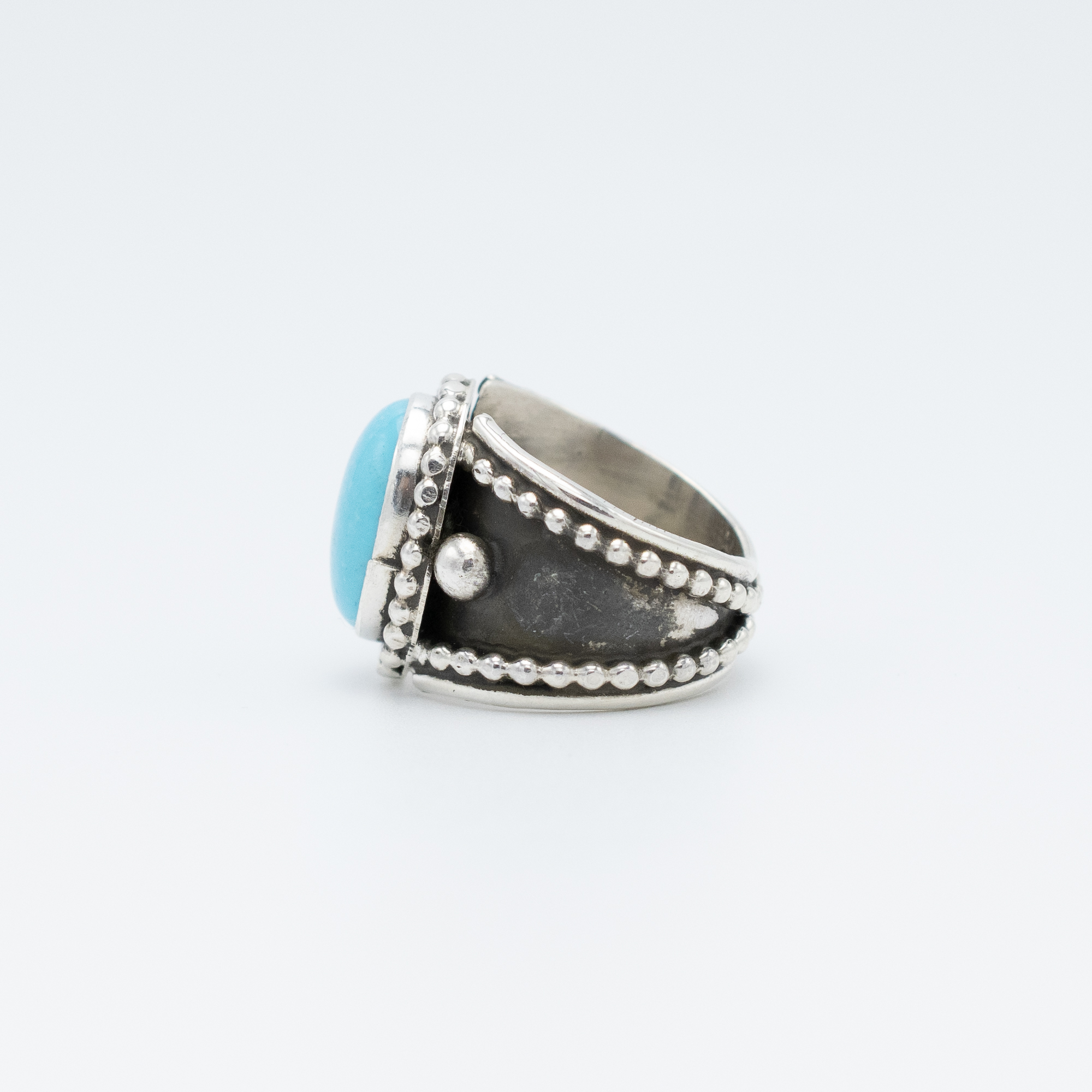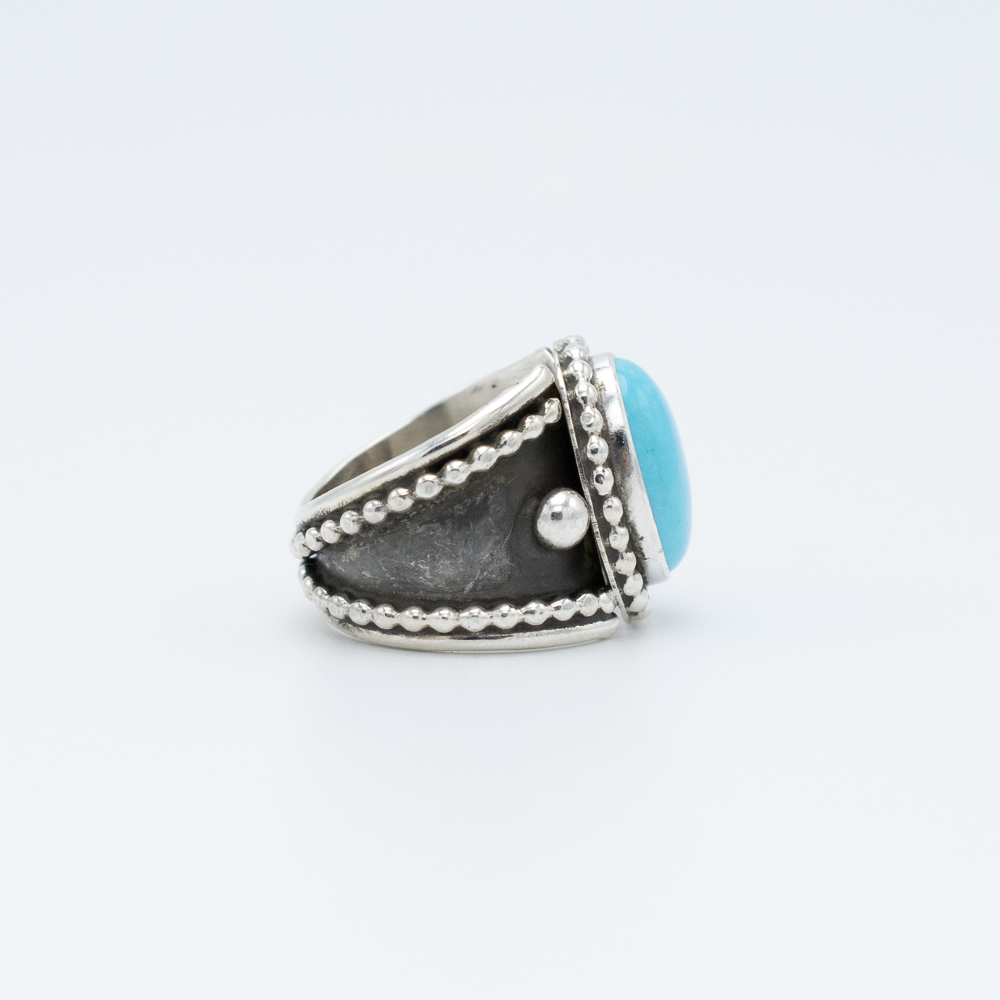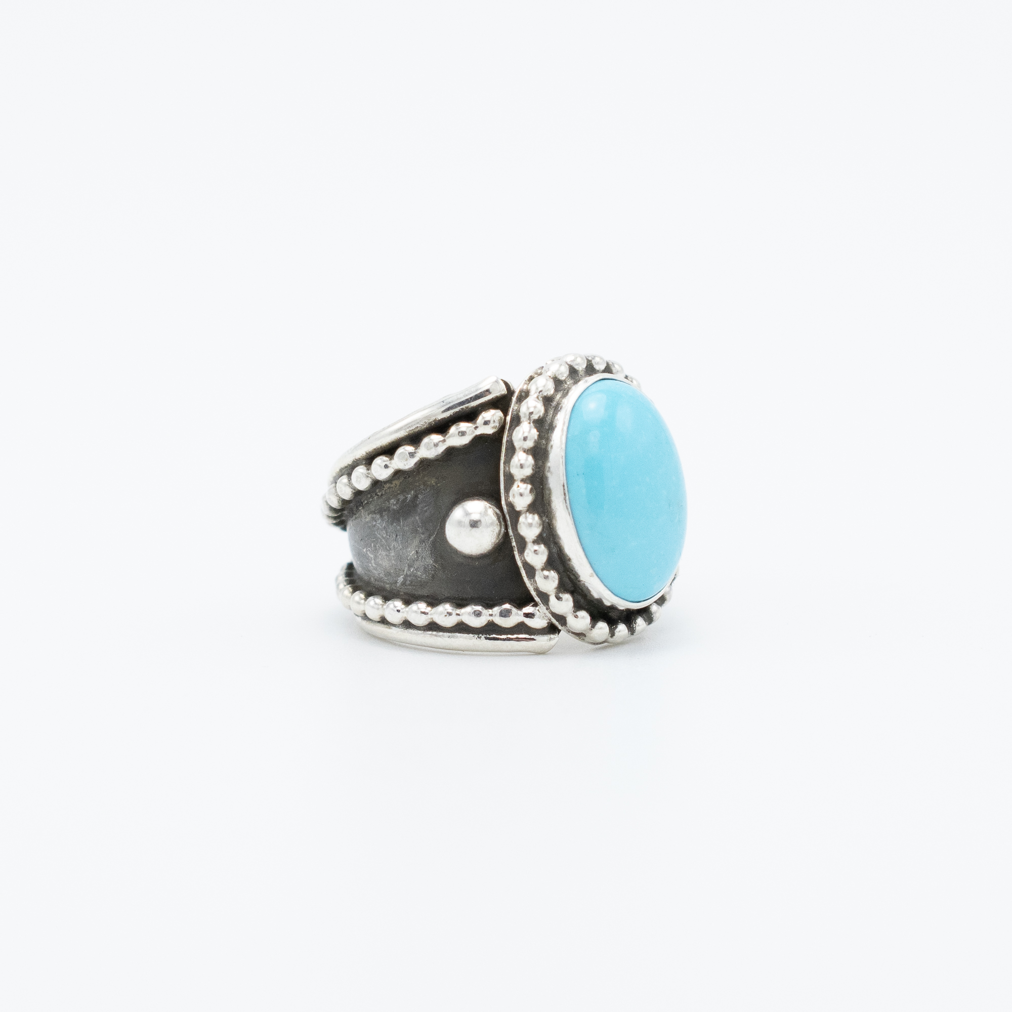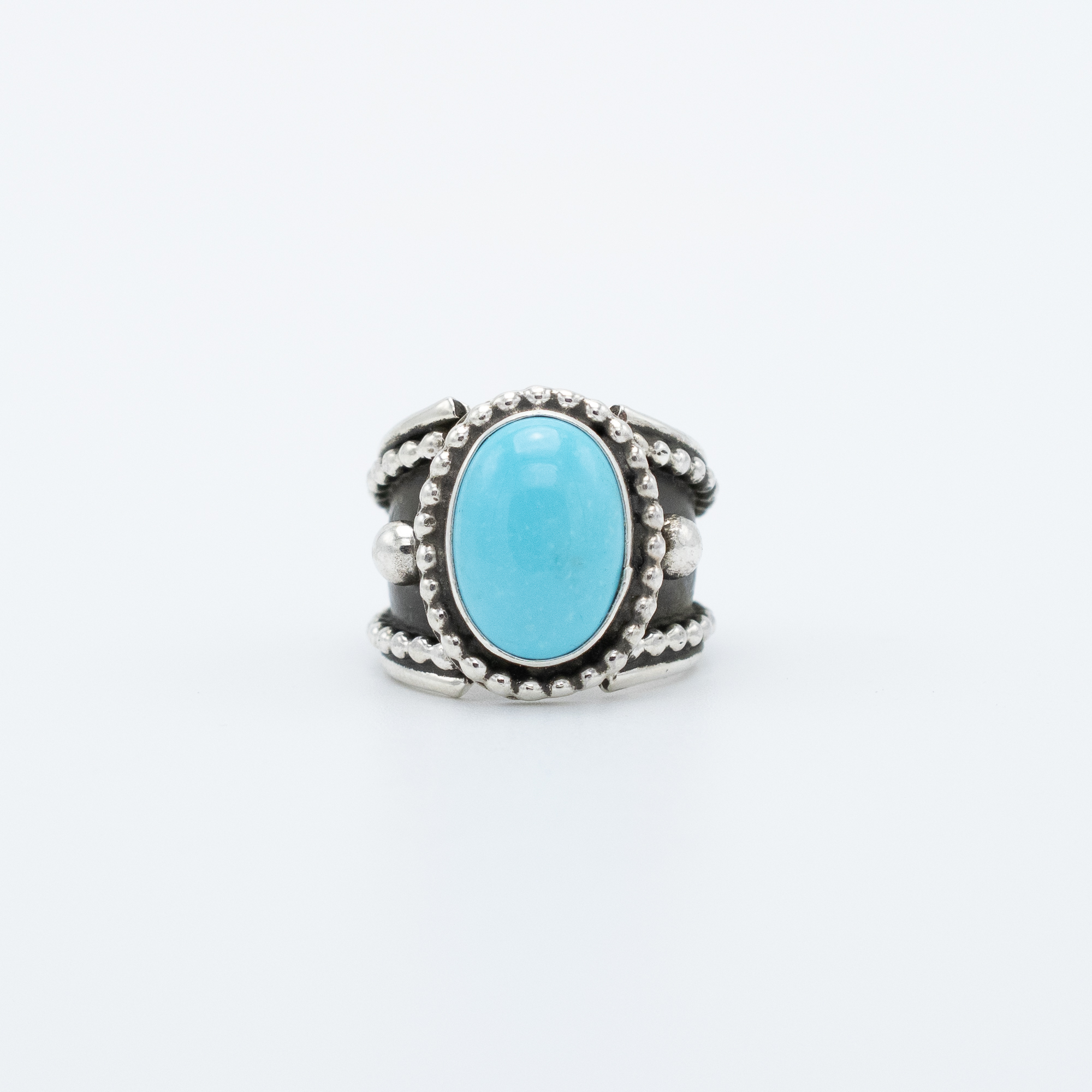 Handcrafted by Navajo artisan Ruth Ann Begay, this elegant ring features a stunning natural Sleeping Beauty turquoise stone, celebrated for its smooth, vivid sky-blue color. The stone’s oval shape is framed by a sterling silver bezel with delicate beaded detailing that enhances its natural beauty. The bold yet graceful band tapers for a comfortable fit and features traditional silversmith accents, bringing a touch of timeless elegance to any look. This ring is the perfect piece to showcase the beauty of turquoise and the rich tradition of Navajo craftsmanship.
