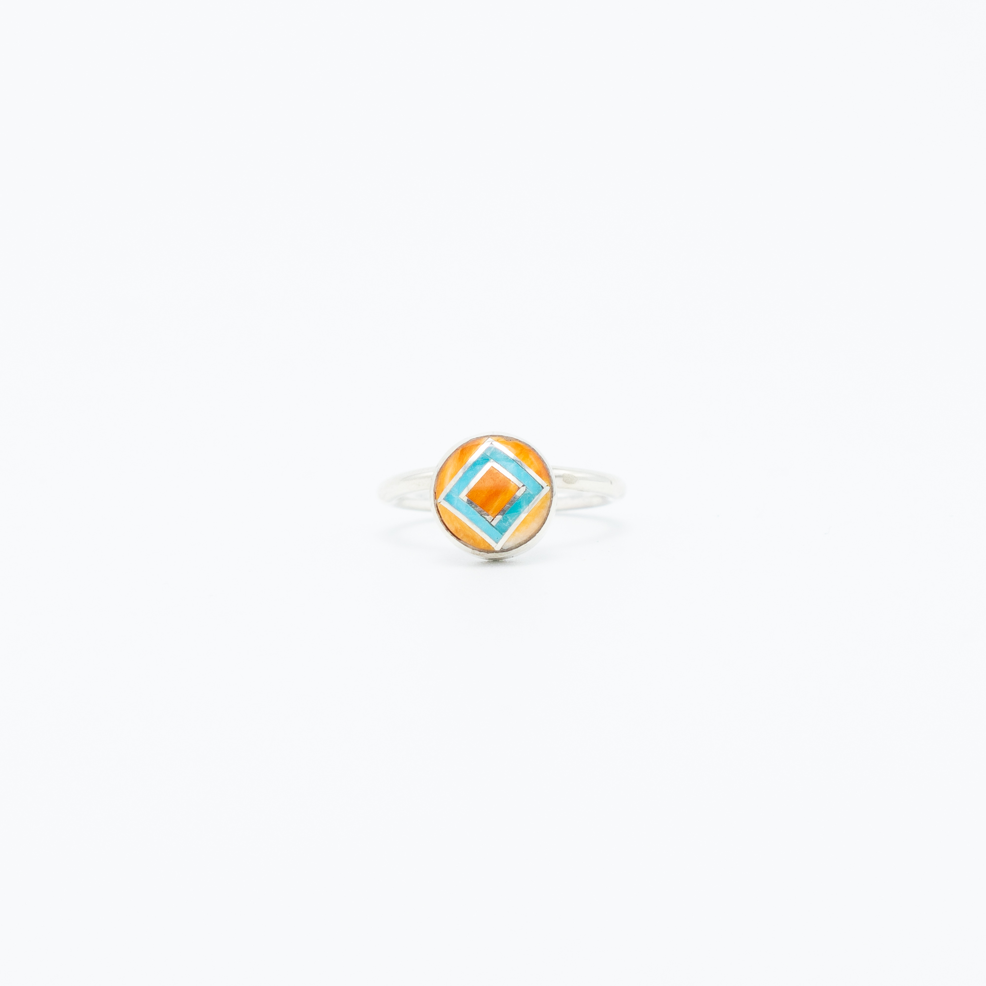 This beautifully crafted inlay ring by Georgia Ann Curley, Laguna Pueblo, features a square of vibrant Spiny Oyster Shell at its center, which is framed by a striking Enhanced Sleeping Beauty Turquoise. Finally, more Spiny Oyster Shell encases the Sleeping Beauty Turquoise square. Notably, each layer is meticulously separated by sterling silver inlay, bringing a touch of light to this union of gemstones. This piece embodies a harmonious blend of colors and textures, showcasing exquisite craftsmanship and making it a standout addition to any collection!