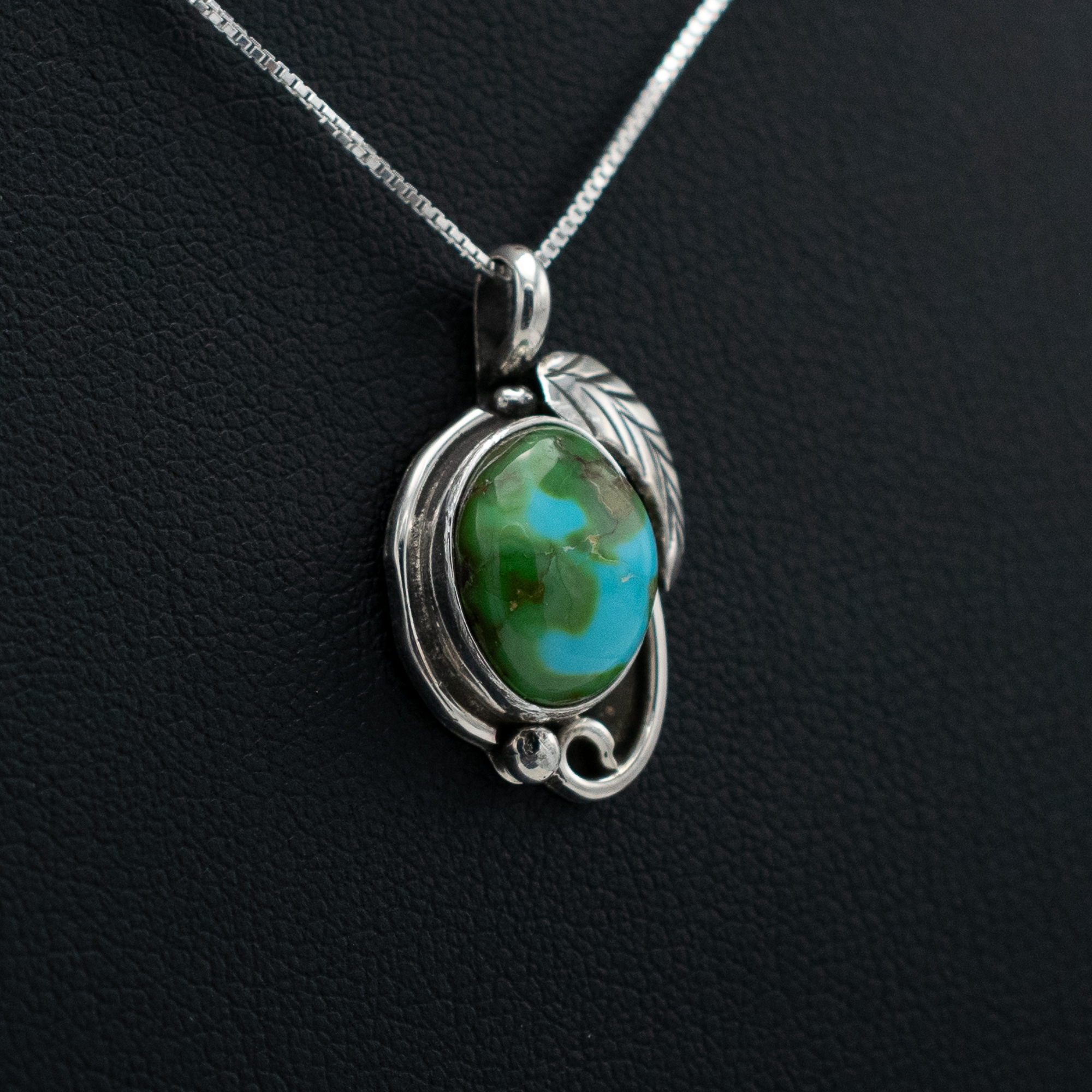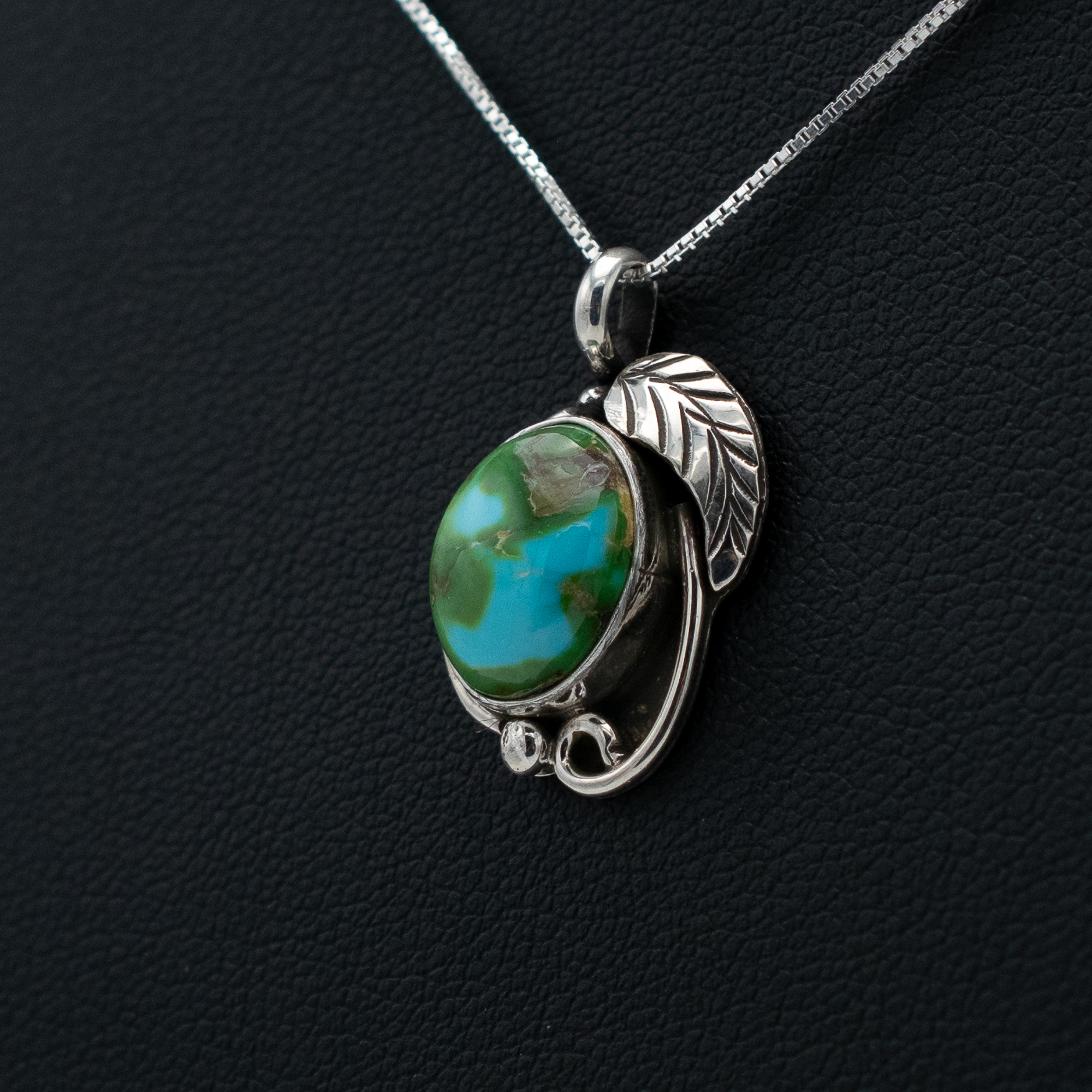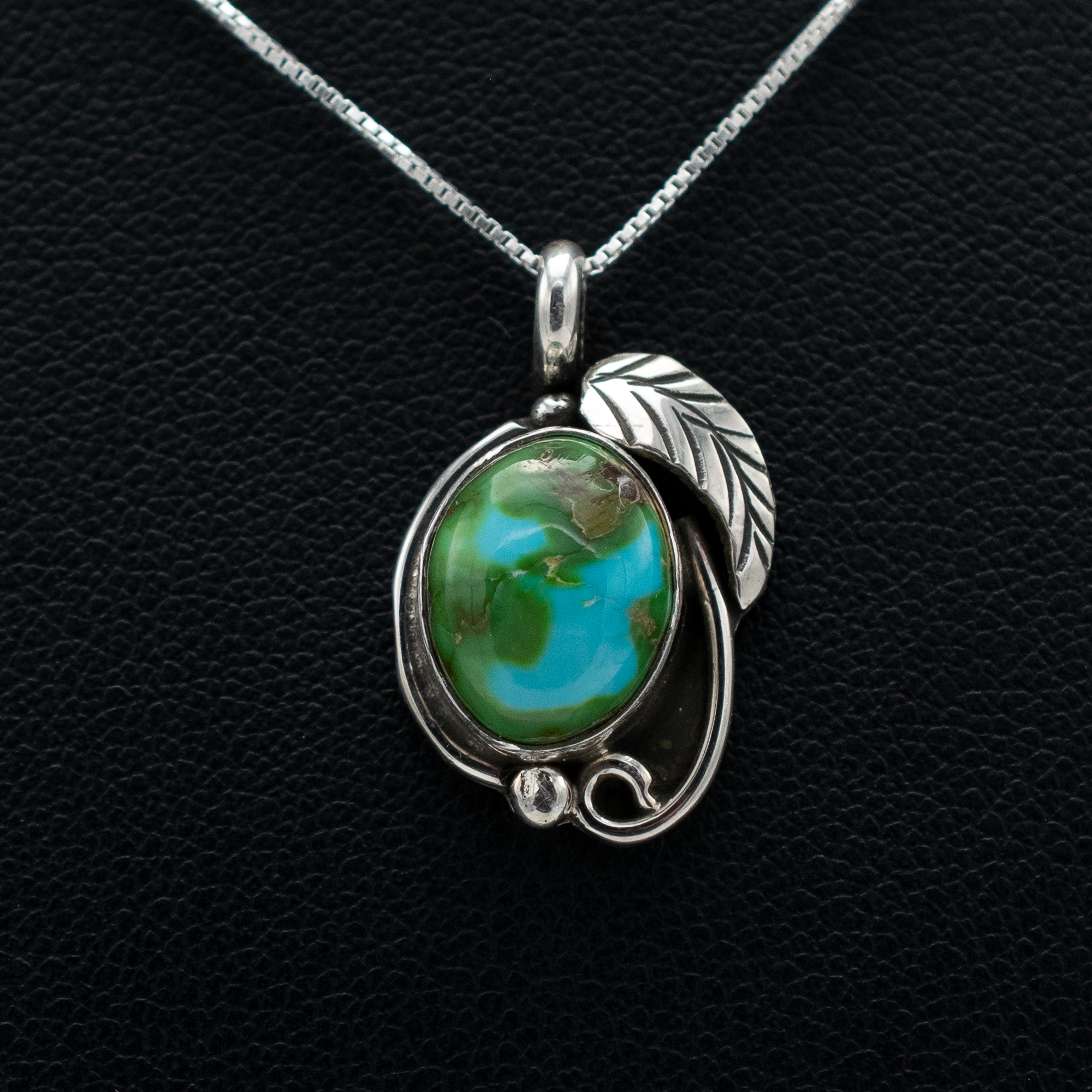 This Enhanced Sonoran Gold Turquoise Pendant by Navajo artist Ruth Ann Begay highlights the vibrant green and blue tones this rare stone is known for. The oval turquoise is set in sterling silver with a flowing, nature-inspired design that includes a hand-stamped leaf accent. A beautiful expression of organic elegance and traditional craftsmanship.