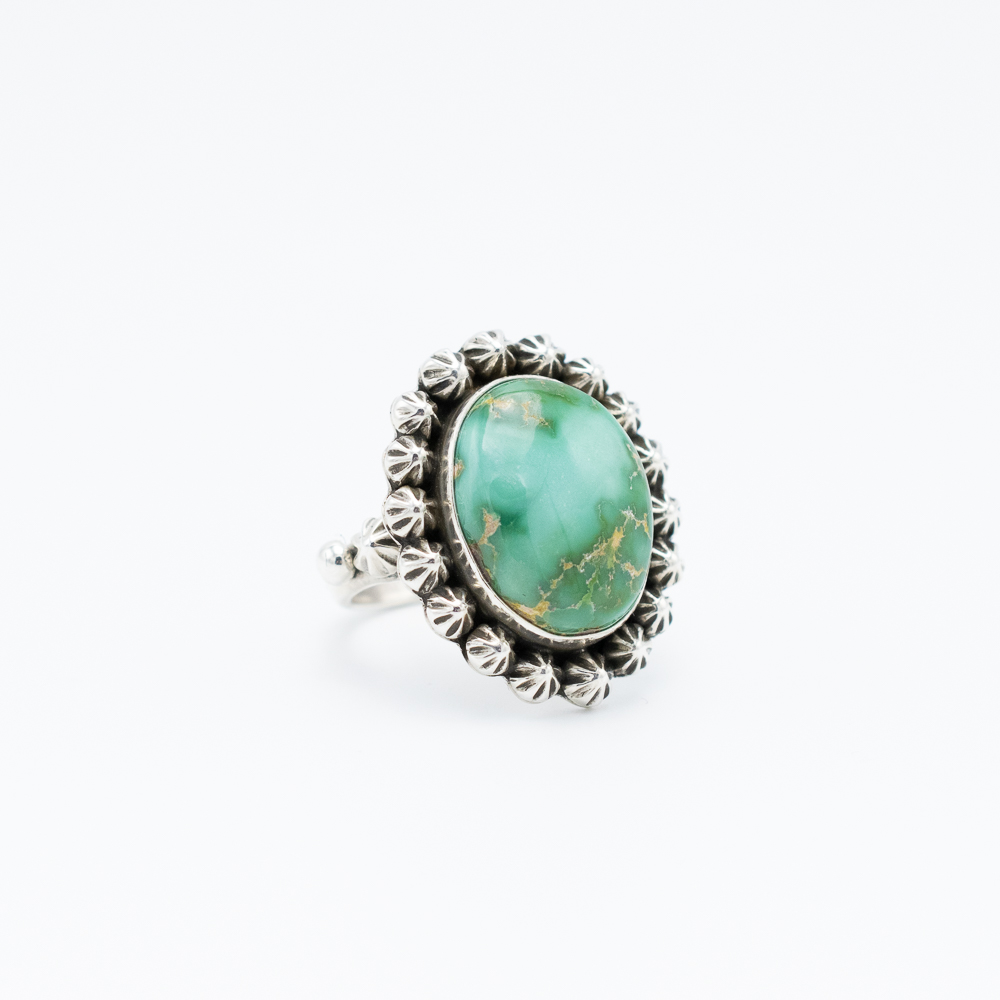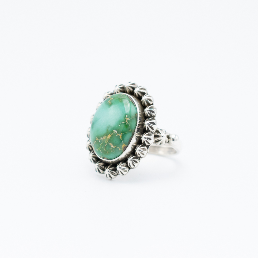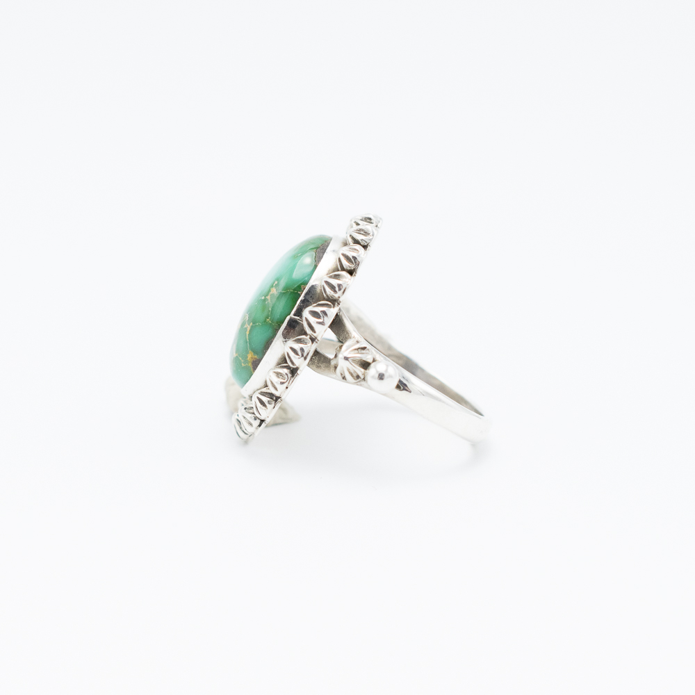 This Enhanced Sonoran Gold Turquoise Ring by Ruth Ann Begay, Navajo, showcases the natural beauty of the Sonoran Gold turquoise with its vibrant green hues and striking golden matrix. The oval stone is framed with sterling silver rosettes, adding a touch of elegance to its handcrafted design. Perfect for any occasion, this ring is a timeless addition to your collection, blending traditional artistry with contemporary style.
