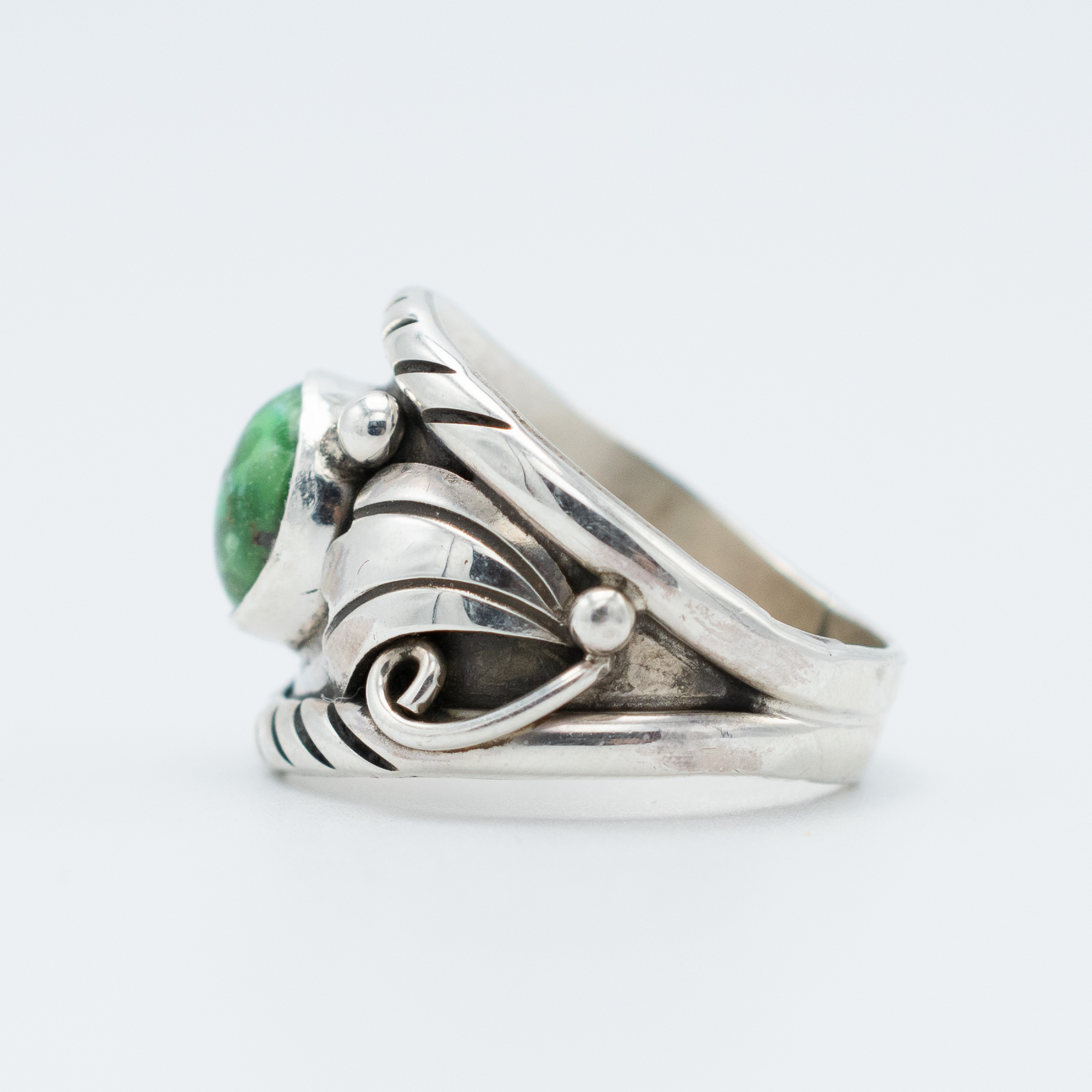 This Sonoran Gold Turquoise ring by Navajo artist Ruth Ann Begay showcases a striking green turquoise stone with natural golden matrix, set in a handcrafted sterling silver design. Traditional Navajo silverwork frames the stone, featuring intricate hand-stamped details and elegant leaf motifs. The oxidized finish adds depth and character, making this statement ring a beautiful tribute to Native American craftsmanship.