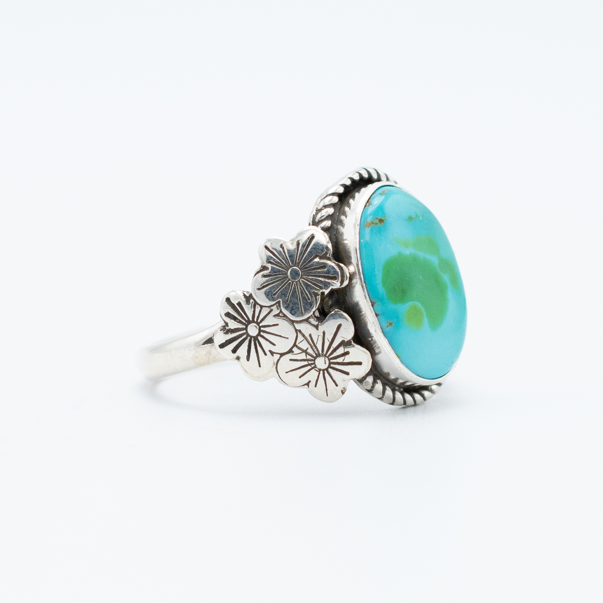 This cheerful ring by Navajo artist Ruth Ann Begay features an oval cabochon of enhanced Sonoran Gold turquoise, showcasing brilliant aqua and vivid green tones. Set in sterling silver and framed with a twisted wire bezel, the stone is flanked by stamped silver flowers that add a whimsical floral touch. Handcrafted with care, this piece brings a fresh and playful energy to any collection.