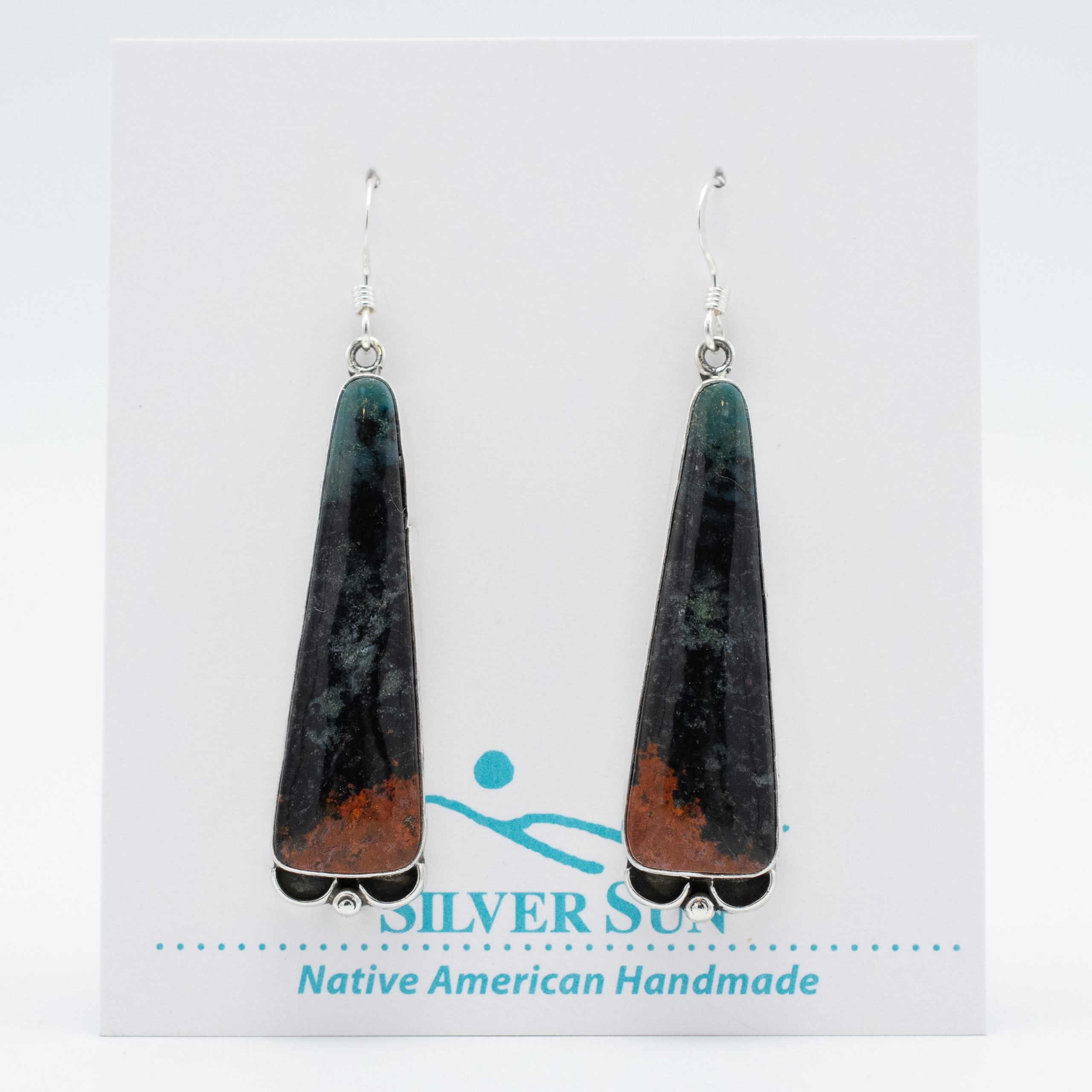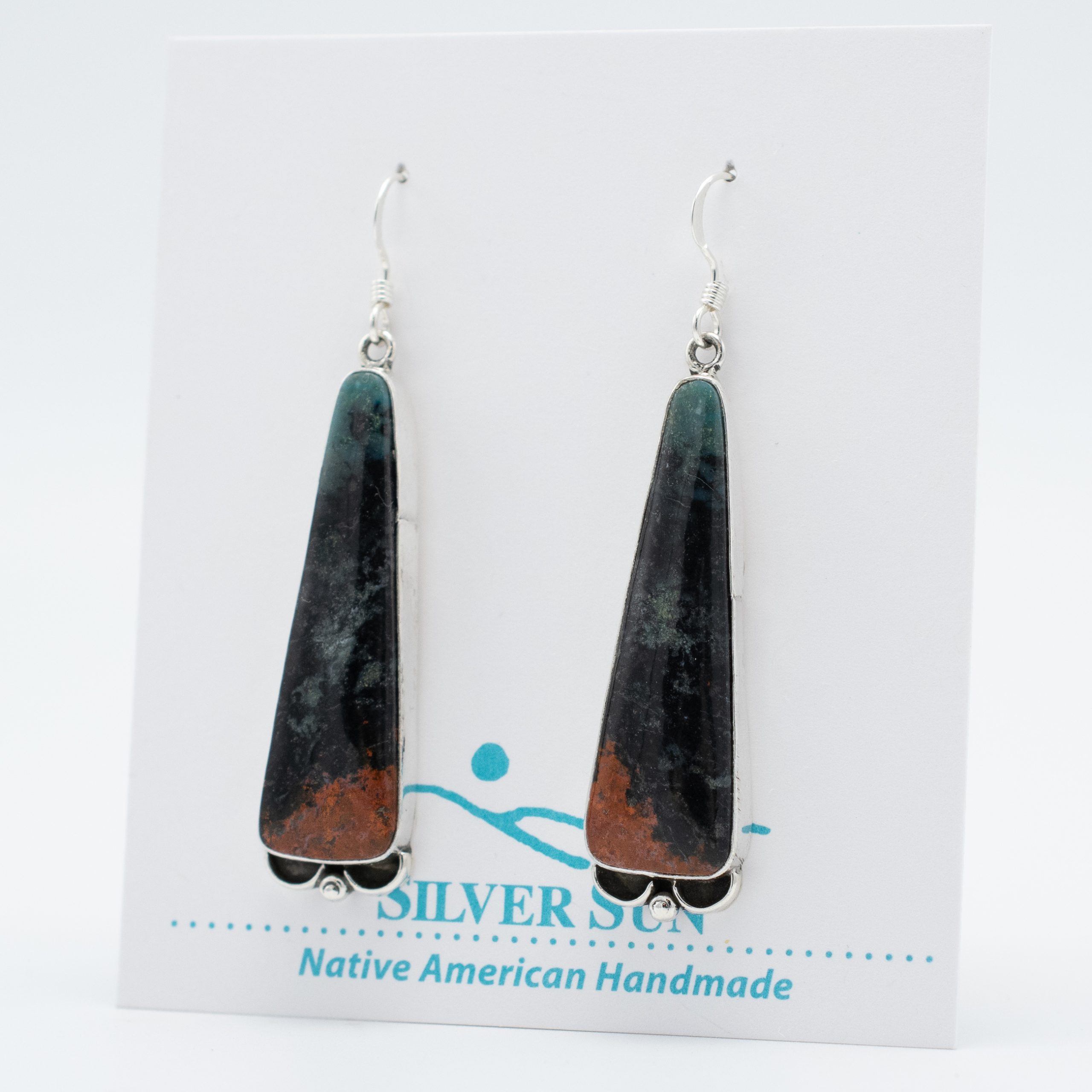 These stunning Sonoran Sunrise Earrings by Ruth Ann Begay, Navajo, showcase the natural beauty of Sonoran Sunrise jasper. The vibrant colors, blending deep green, striking red, and earthy black hues, evoke the breathtaking beauty of a desert sunrise. Set in sterling silver and accented with delicate silverwork, these earrings embody traditional Navajo craftsmanship. Perfect for adding a bold and elegant touch to any look.