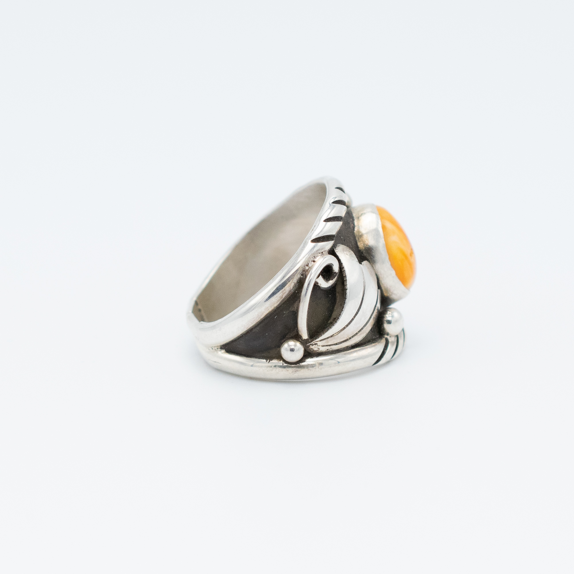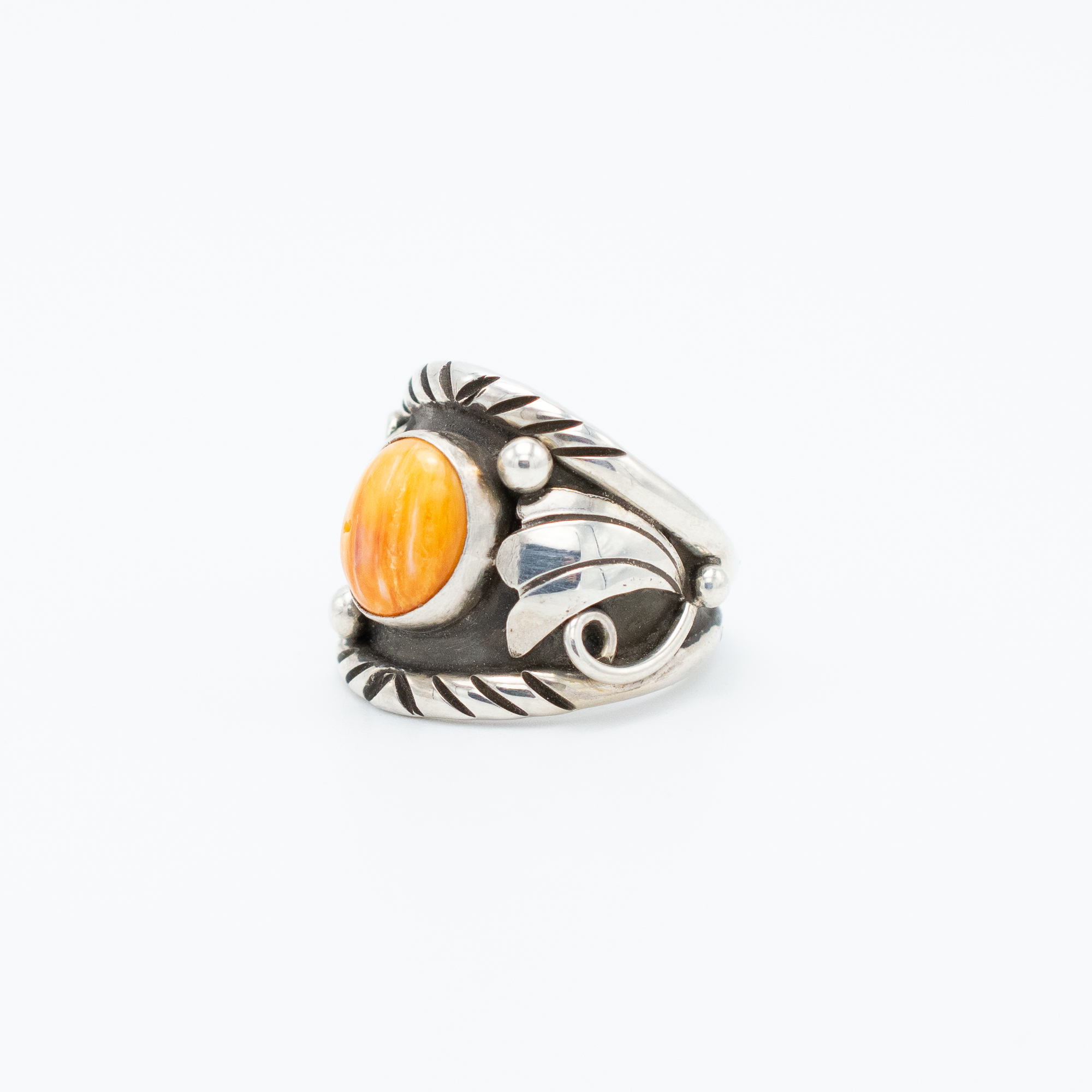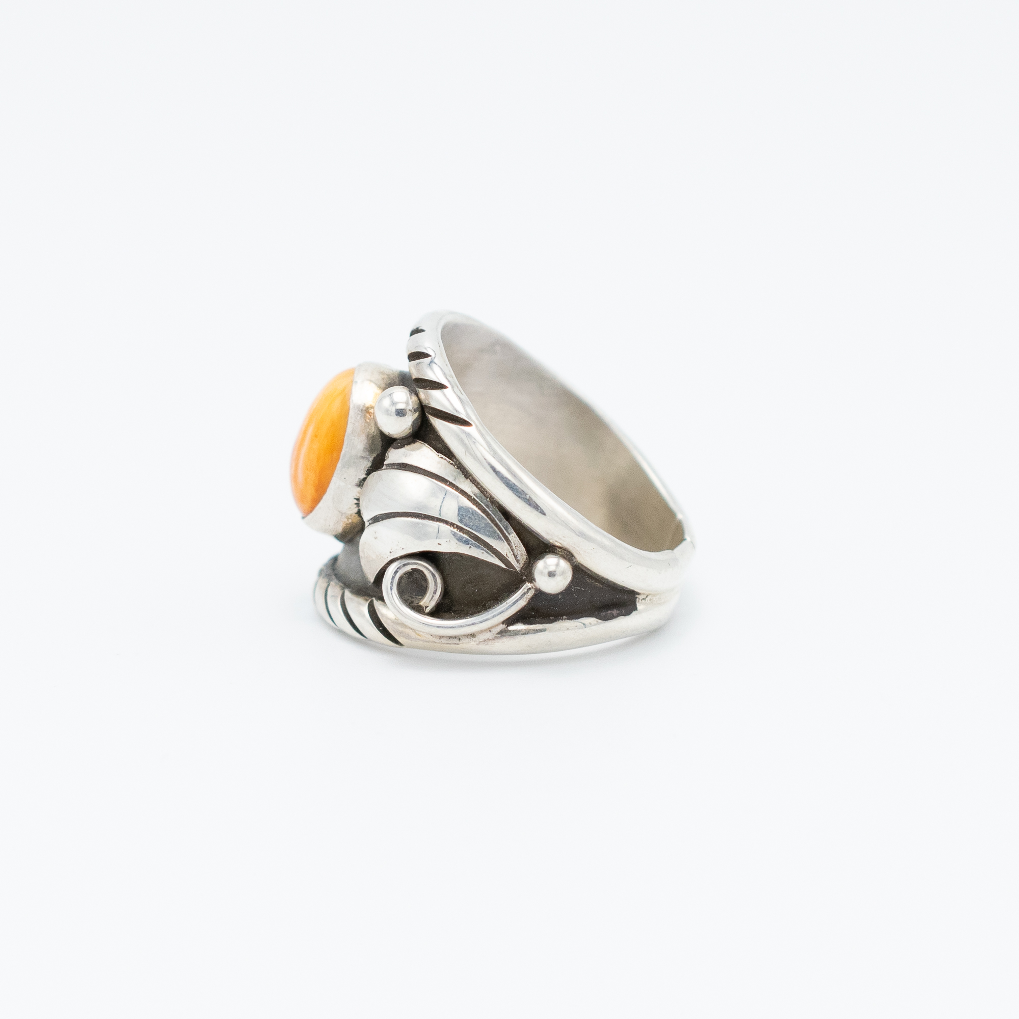 Add a pop of color to your ensemble with this vibrant Spiny Oyster ring by Ruth Ann Begay, Navajo. The orange and white color streaks create a stunning contrast, while the intricate silver leaf work adds a touch of flair, making it a standout piece in your collection.