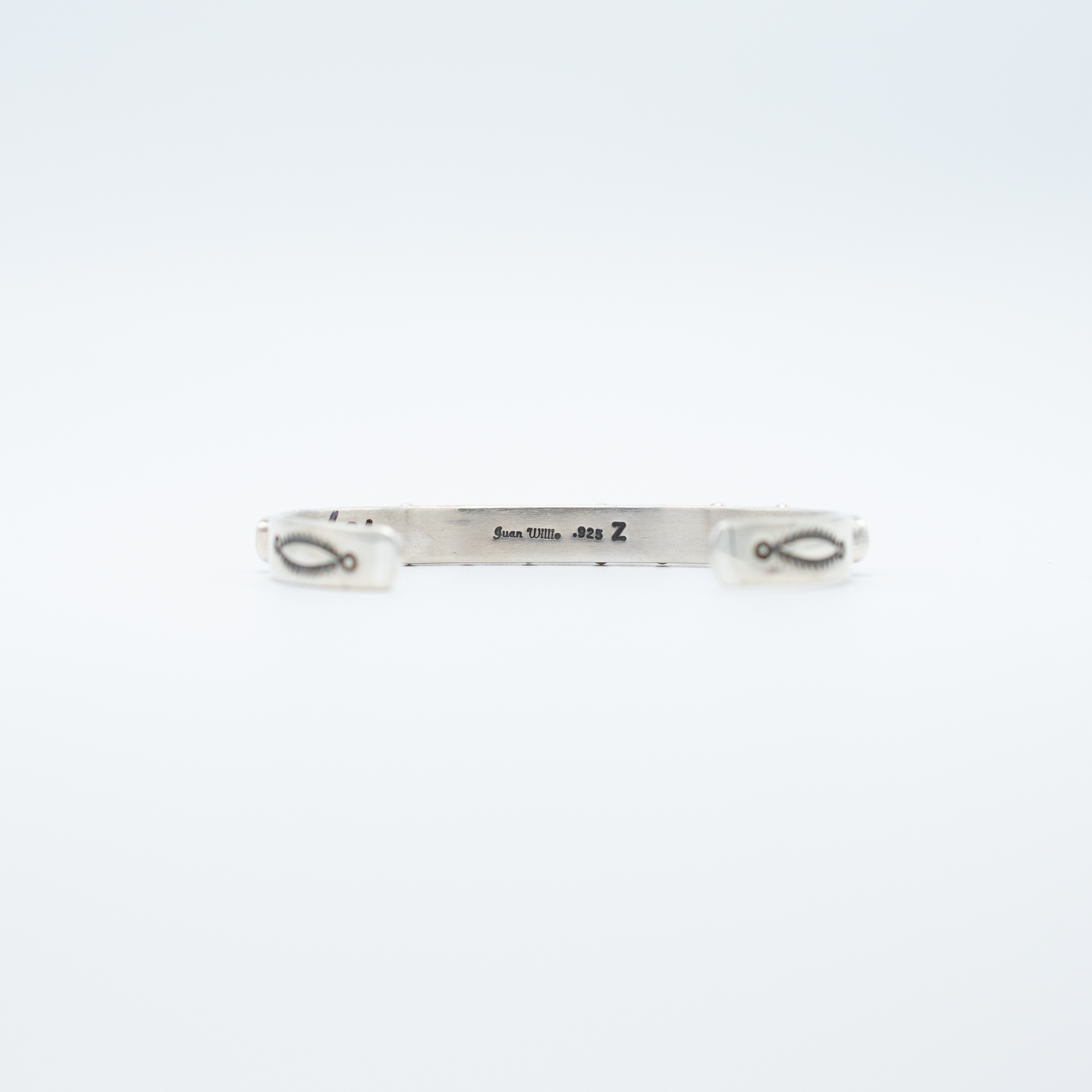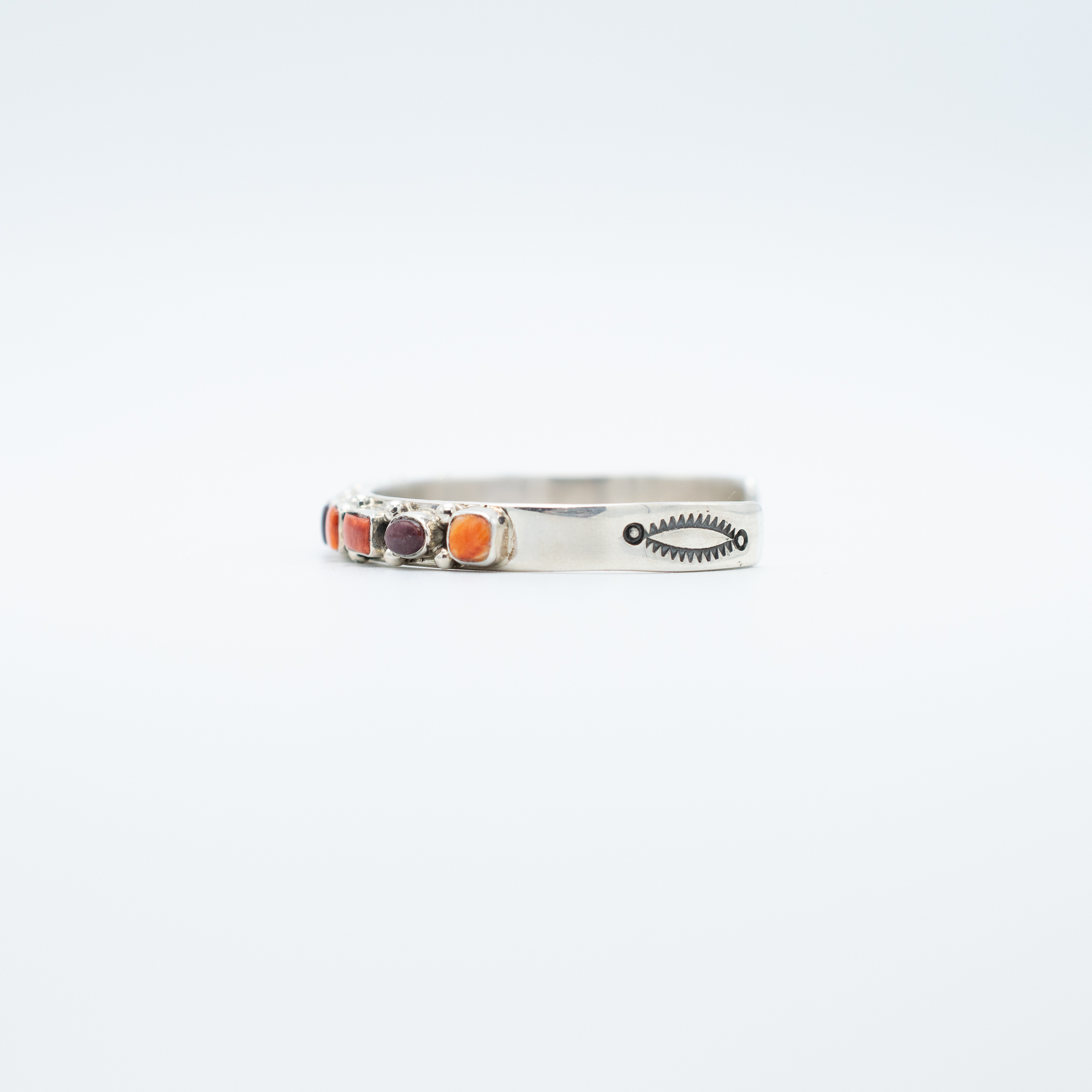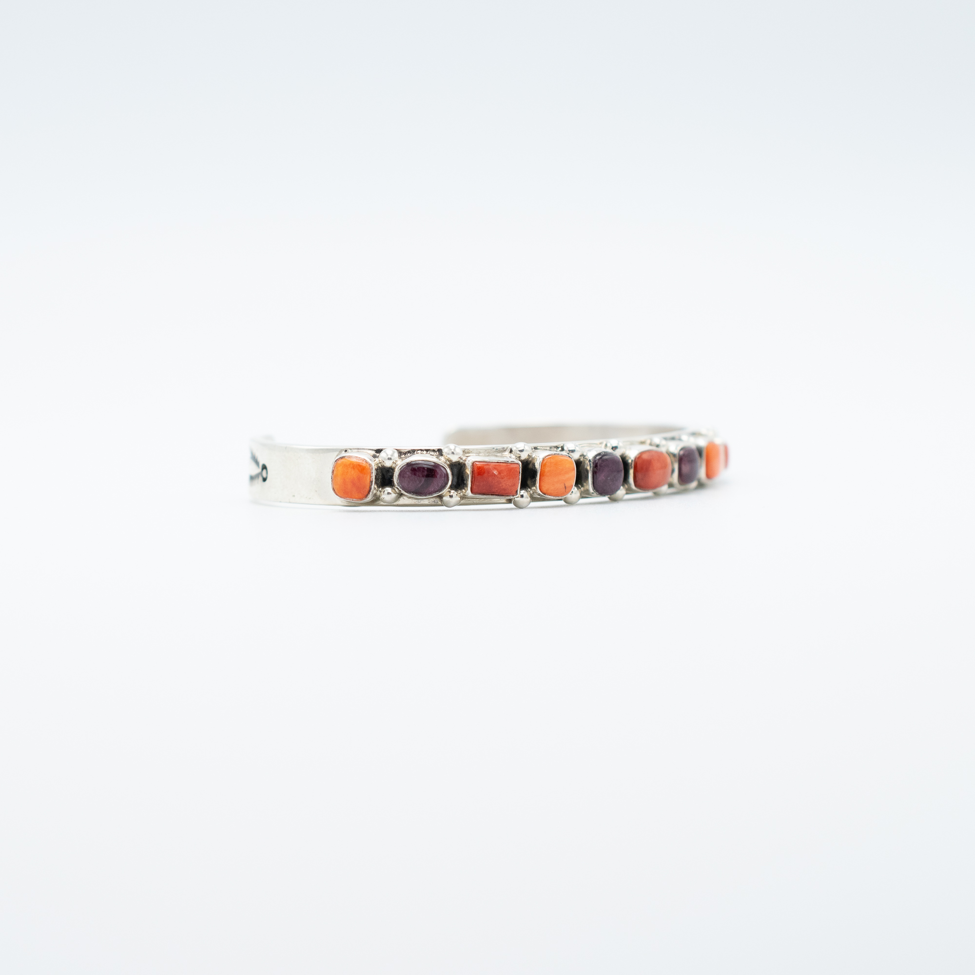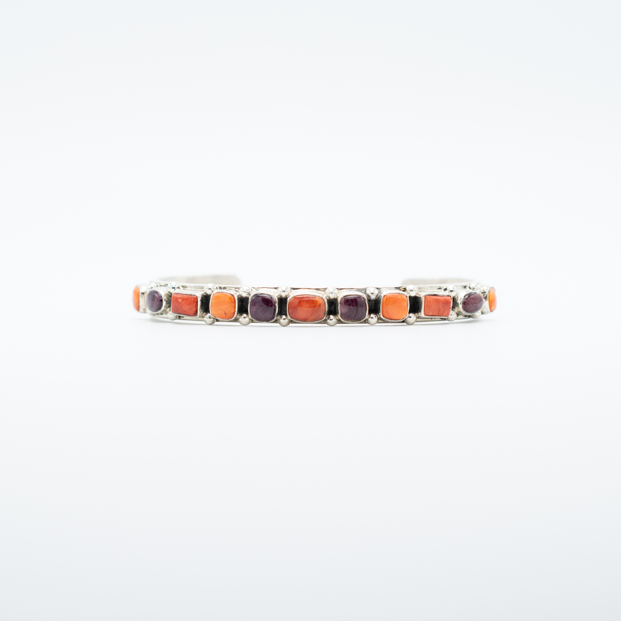 This Purple and Red Spiny Oyster Shell Bracelet by Navajo artist Juan Willie is a vibrant statement of traditional craftsmanship. The bracelet features a row of precisely set spiny oyster shell stones in rich shades of deep purple and warm red-orange, creating a stunning contrast. Sterling silver details frame each stone, adding depth and texture to the piece. Handcrafted with care, this bracelet is a striking combination of bold color and classic Navajo artistry, perfect for adding a unique touch to any collection.