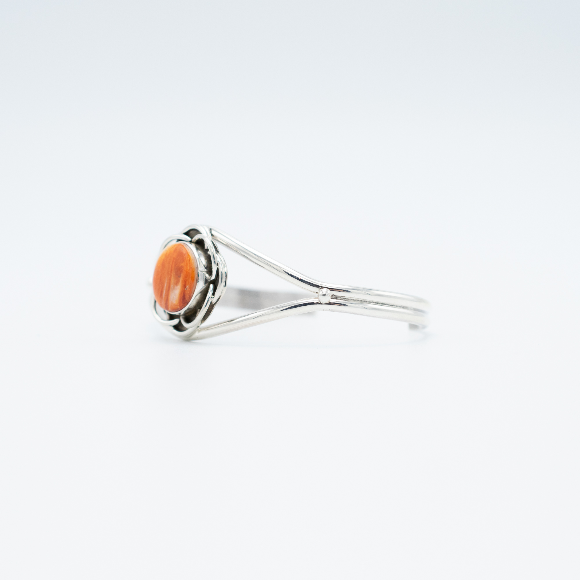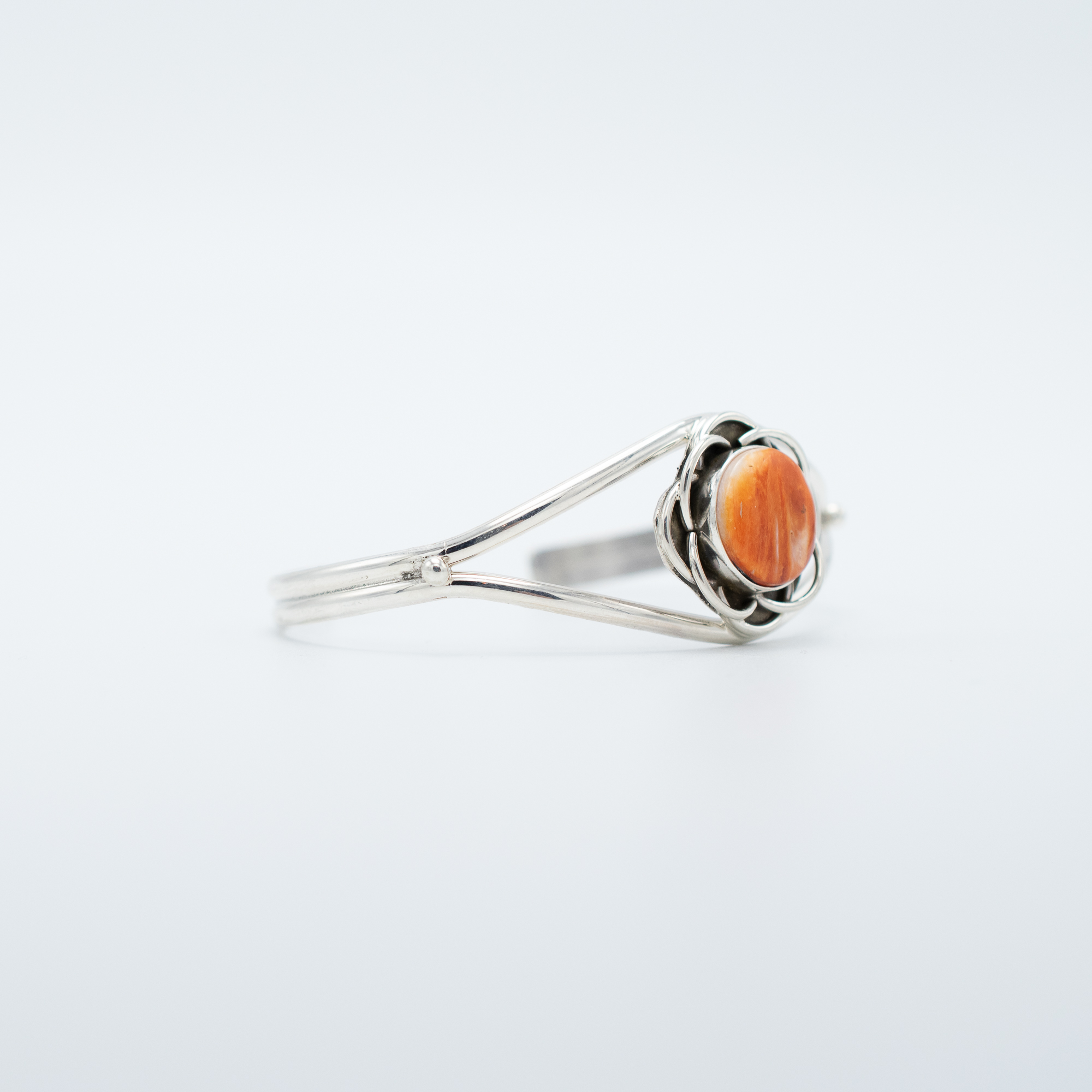 This Spiny Oyster Shell Flower Petal Bracelet by Navajo artist Ruth Ann Begay captures the warmth and beauty of natural spiny oyster shell. The round cabochon sits at the center of a delicate sterling silver flower-inspired setting, creating an elegant and feminine design. The split band structure enhances the open, airy feel of this handcrafted bracelet, making it a versatile and timeless addition to any collection.