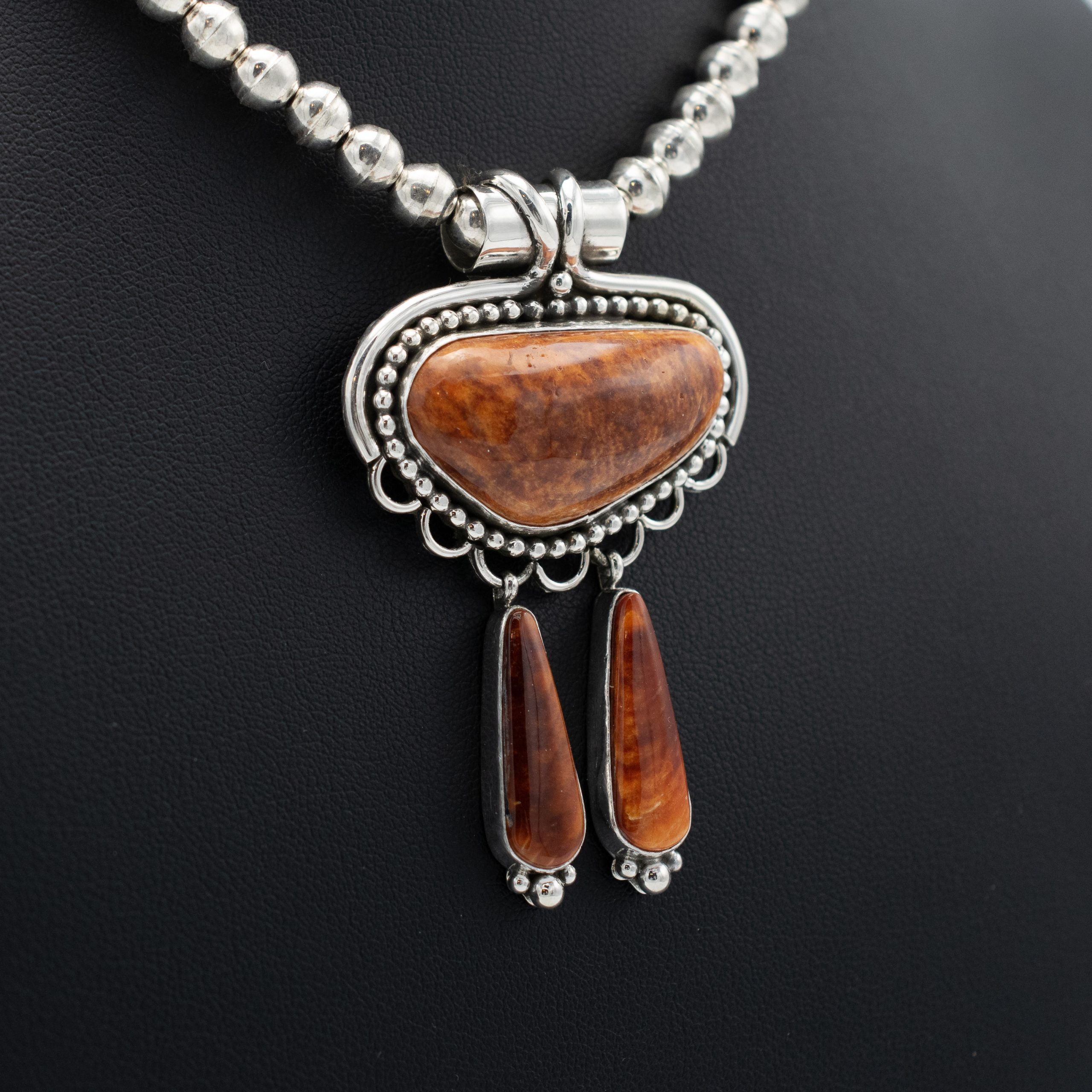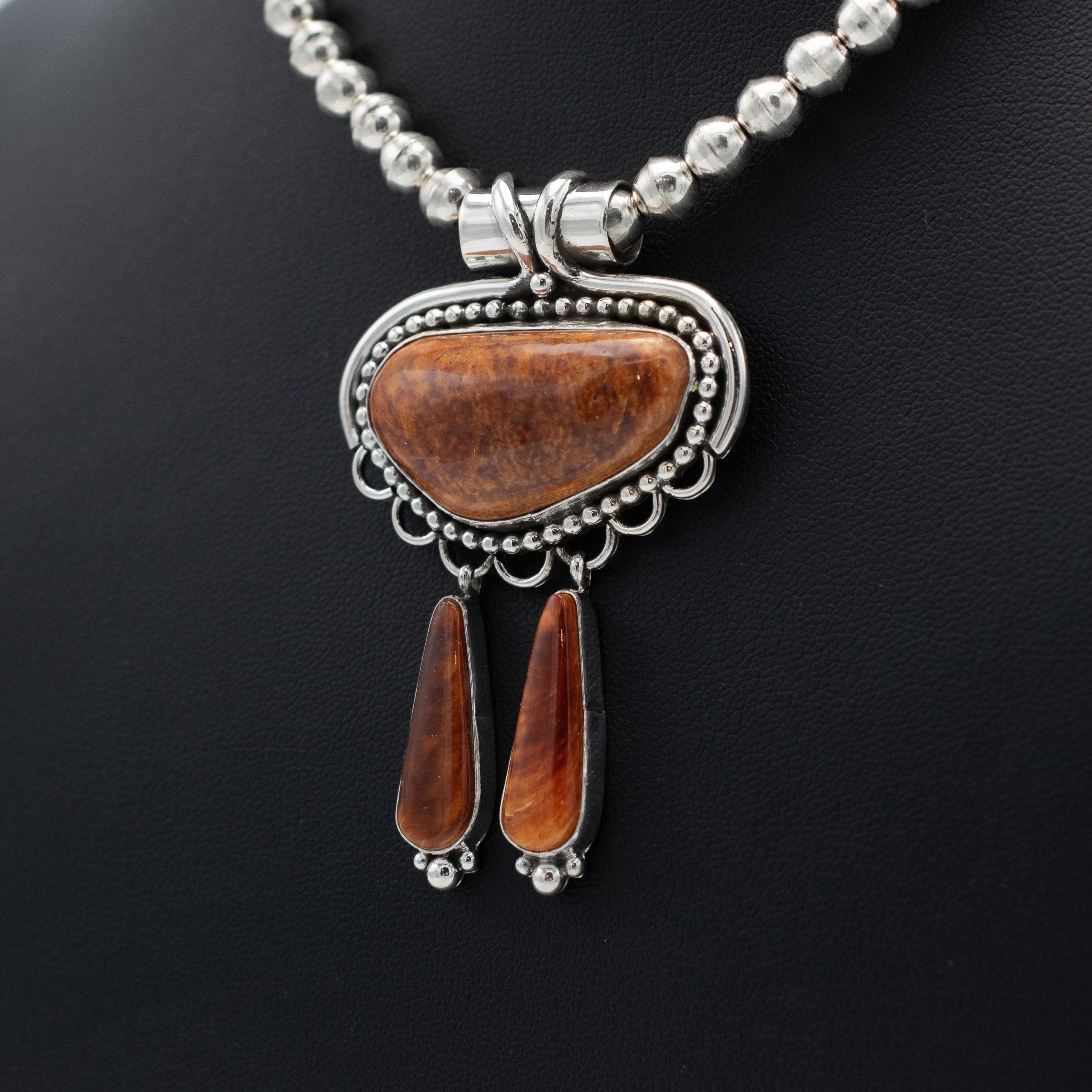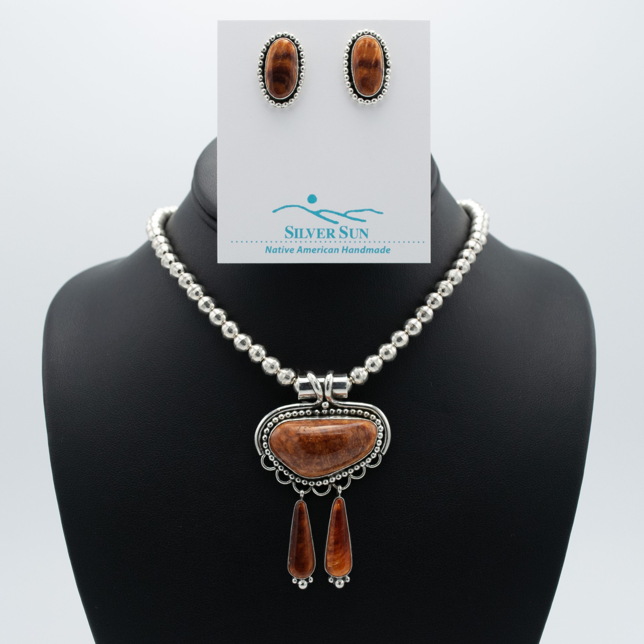 This stunning Spiny Oyster Shell Pendant and Earring Set by Navajo artist Ruth Ann Begay showcases the rich, warm hues and natural beauty of spiny oyster shell. The pendant features an impressive spiny oyster shell centerpiece that is set in sterling silver with a polished finish. A wide bale allows you to pair it with your favorite chain or cord. Accompanying the pendant is a pair of matching earrings, thoughtfully designed to highlight the captivating colors and unique patterns of spiny oyster shell.