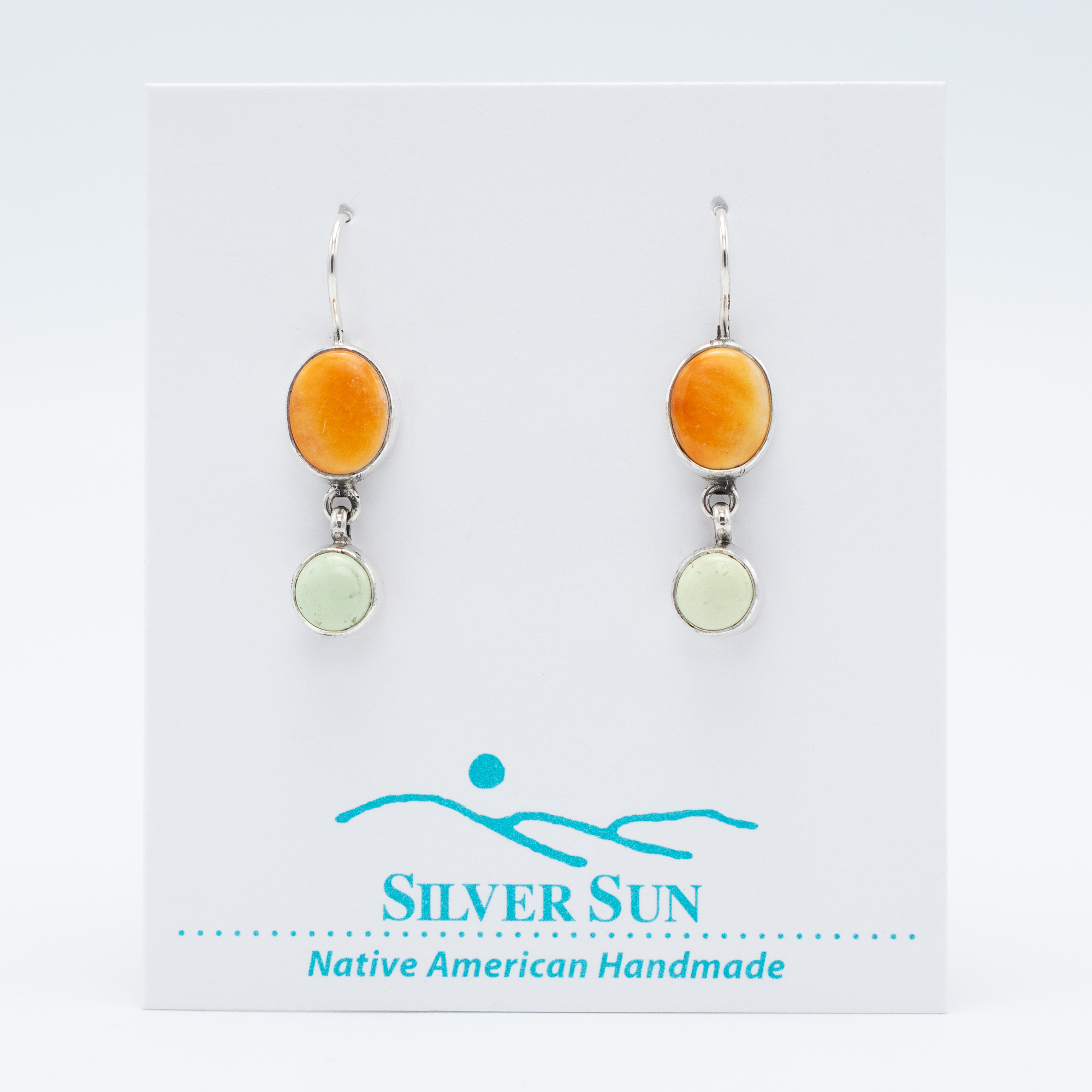These Spiny Oyster & Stabilized Chinese Turquoise Dangle Earrings by Navajo artist Ruth Ann Begay pair warm, sunlit color with soft green tones for a vibrant yet balanced look. Each earring features an oval spiny oyster shell in rich orange hues paired with a round Chinese turquoise drop, both set in smooth sterling silver. The two-stone design creates gentle movement and a playful touch, making these earrings an easy way to add color and handcrafted charm to your everyday style.