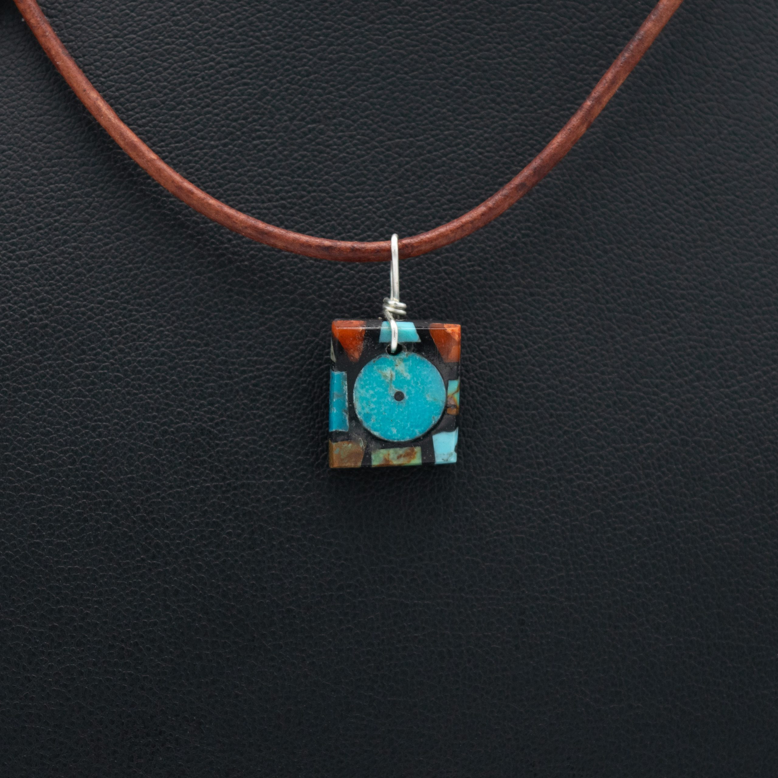 Julian Coriz’s artistry is showcased in this stunning pendant. Featuring a mosaic inlay of apple coral, stabilized Kingman turquoise, it’s a true work of art. This mixed gemstone mosaic pendant comes on an adjustable leather cord.