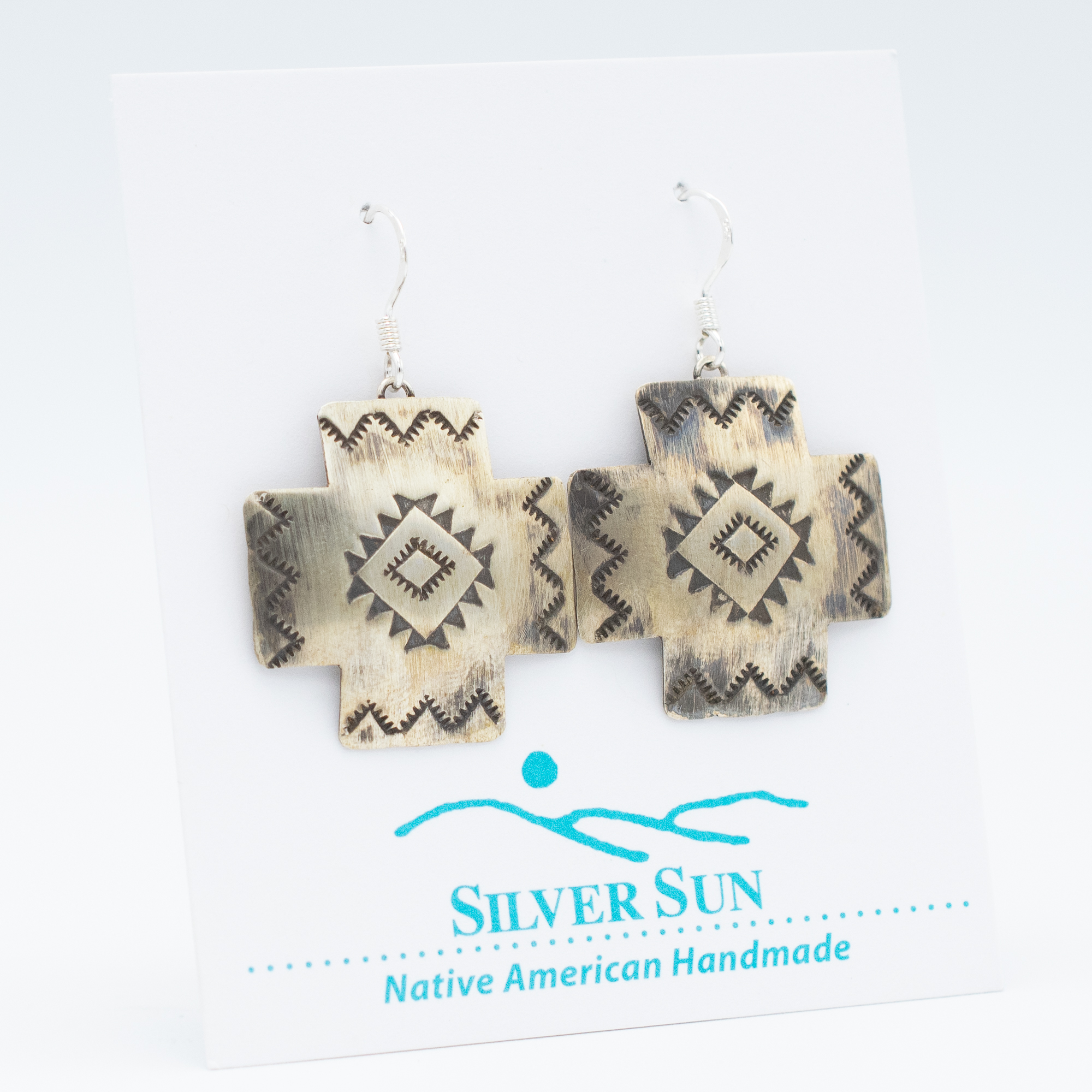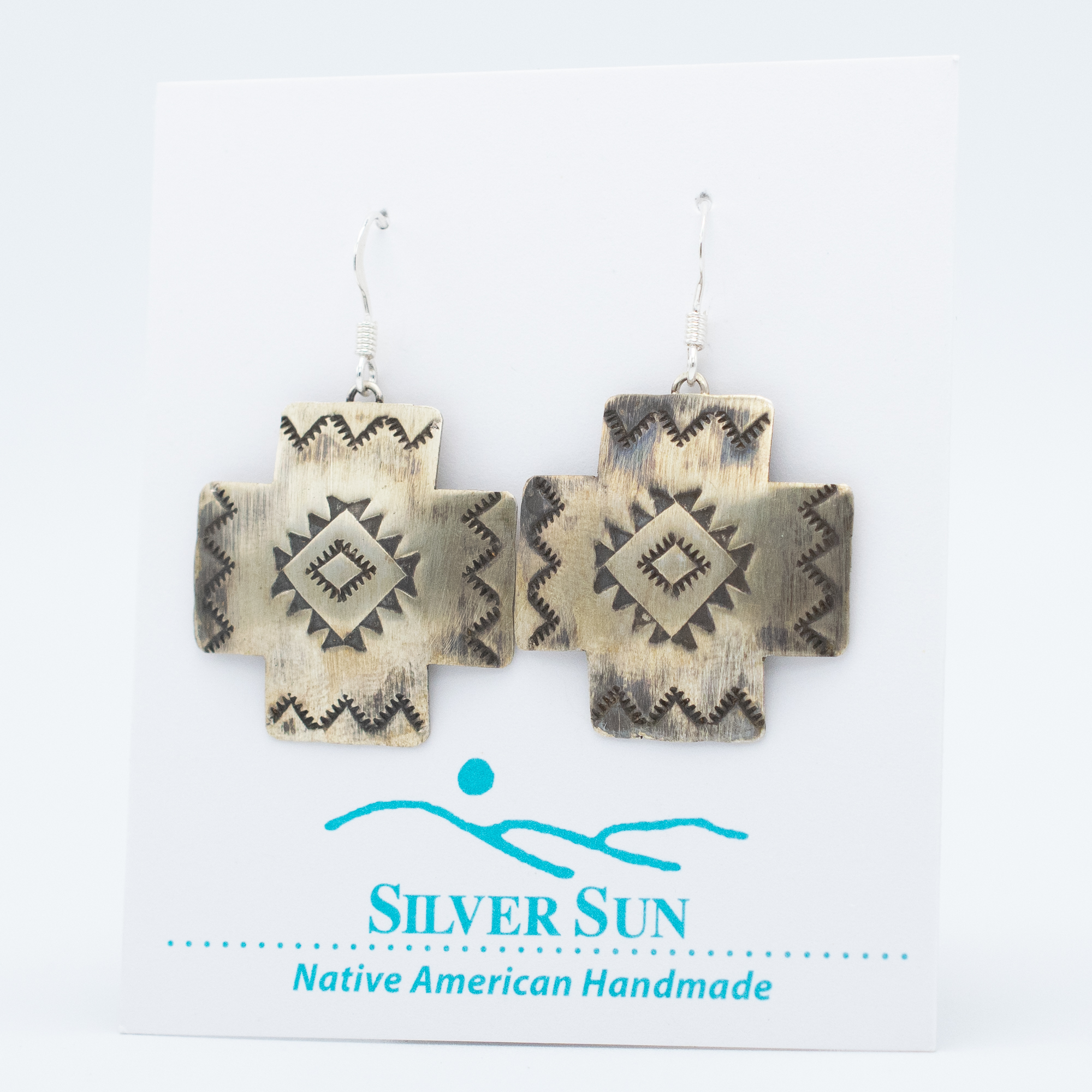 These bold stamped silver Spider Woman Cross earrings by Navajo artist Bryant Martinez showcase a traditional geometric pattern with a warm, oxidized finish. The layered sunburst design adds dimension and movement to the cross-shaped silhouette, creating a striking look that blends heritage with artistry. Handcrafted in sterling silver, they make a meaningful statement piece.
