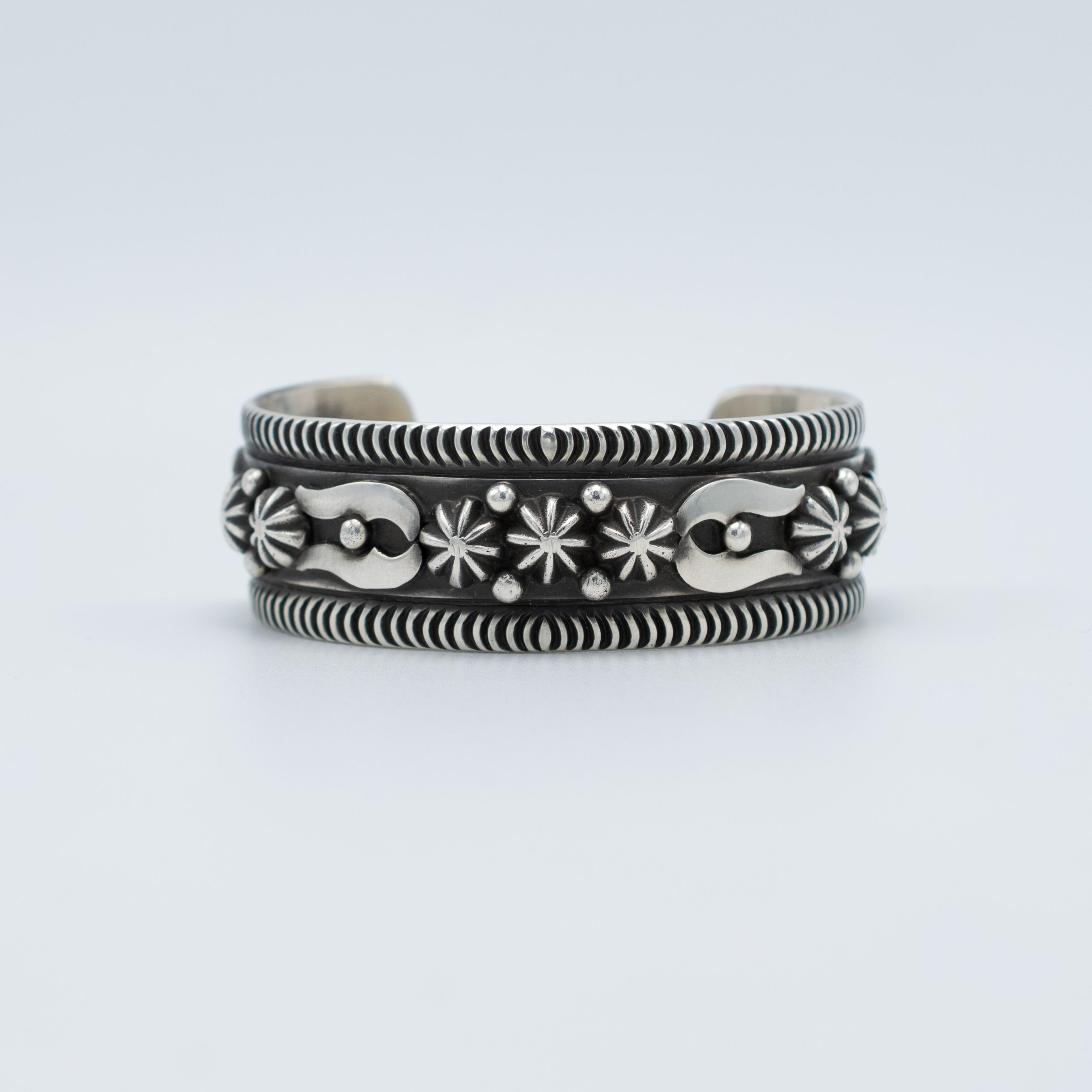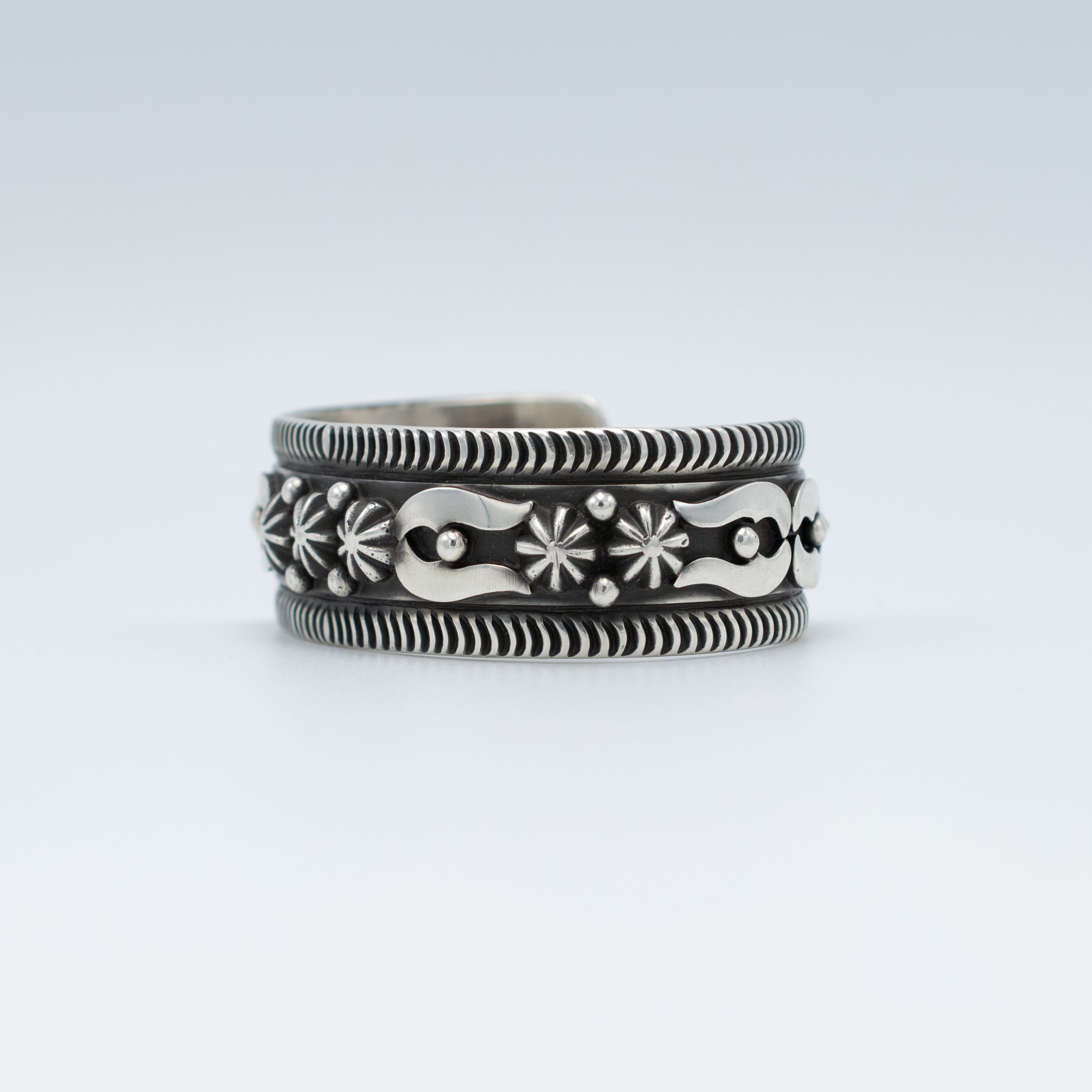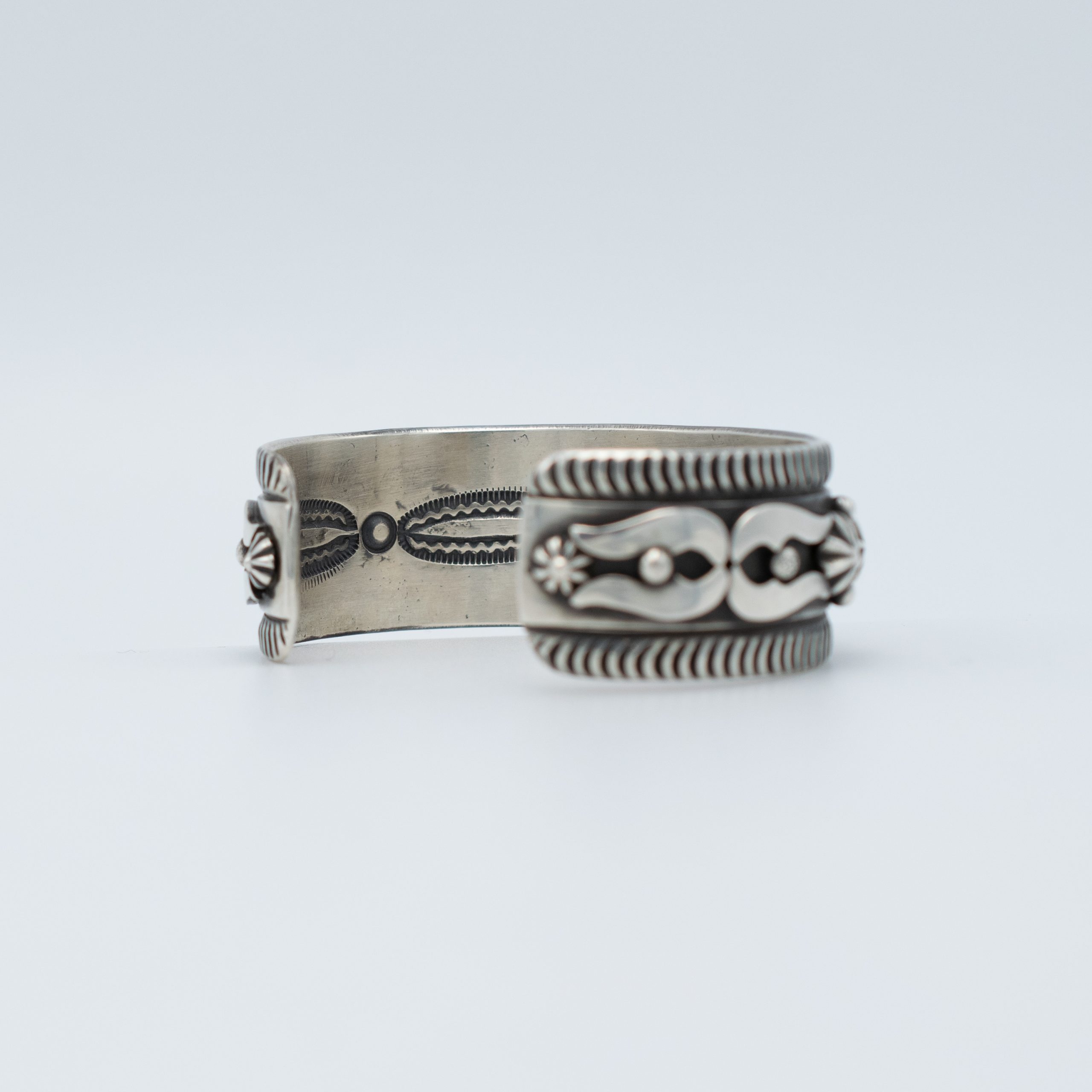 Turn heads with this Sterling Silver Applique Bracelet by Roland Dixon, Navajo. Meticulously crafted, this exquisite bracelet features intricate sterling silver applique detailing, showcasing the craftsmanship and artistry of Navajo silversmithing in a timeless and elegant design.